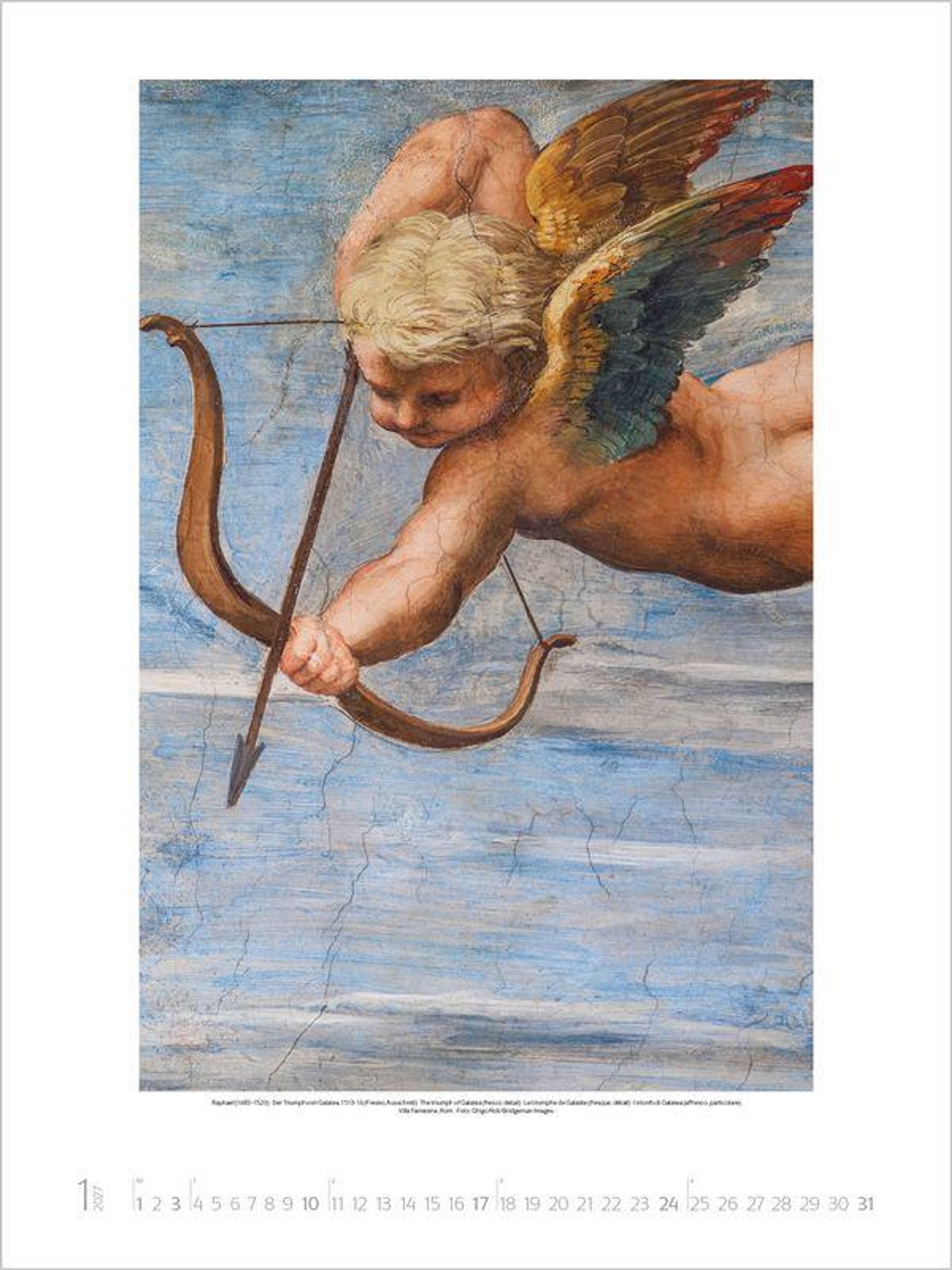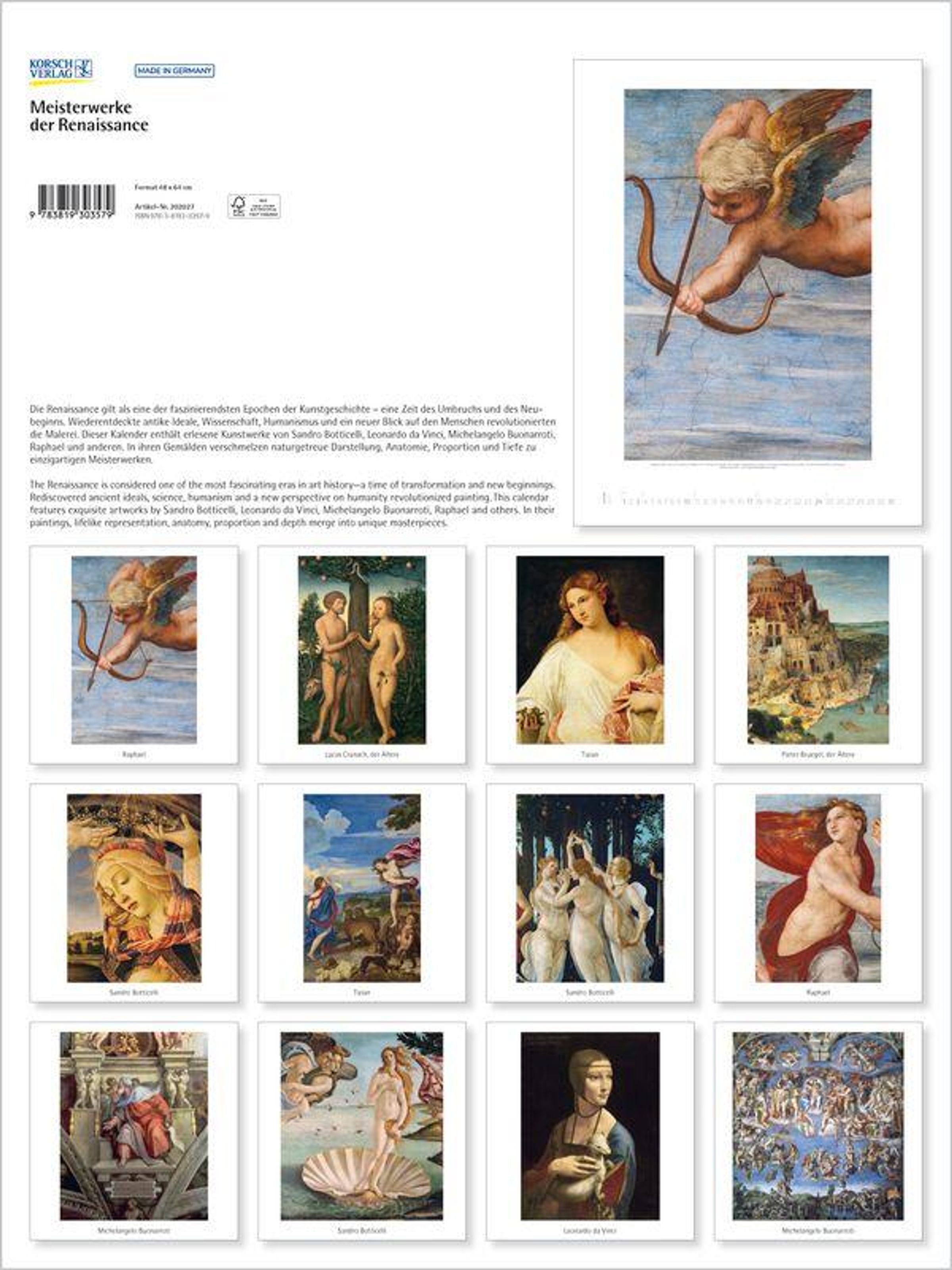 Die Meisterwerke der Renaissance entführen in eine der faszinierendsten Epochen der Kunstgeschichte: Bruch und Neubeginn durch Wiederentdeckung antiker Ideale, Wissenschaft, Humanismus und individuelle Sichtbarkeit führten zu einer neuen Betrachtung von Mensch, Raum und Zeit. Künstler wie Leonardo da Vinci, Michelangelo und Raffael verbanden naturgetreue Darstellung, Anatomie, Proportion und Tiefe. Von Botticellis Geburt der Venus bis Brueghels Turmbau zu Babel lädt dieser Kalender ein, Monat für Monat durch kunsthistorische Repräsentanten zu blättern. Ideal, um Kunstwissen zu fördern - und als Inspirationsquelle für Museumsbesuche.