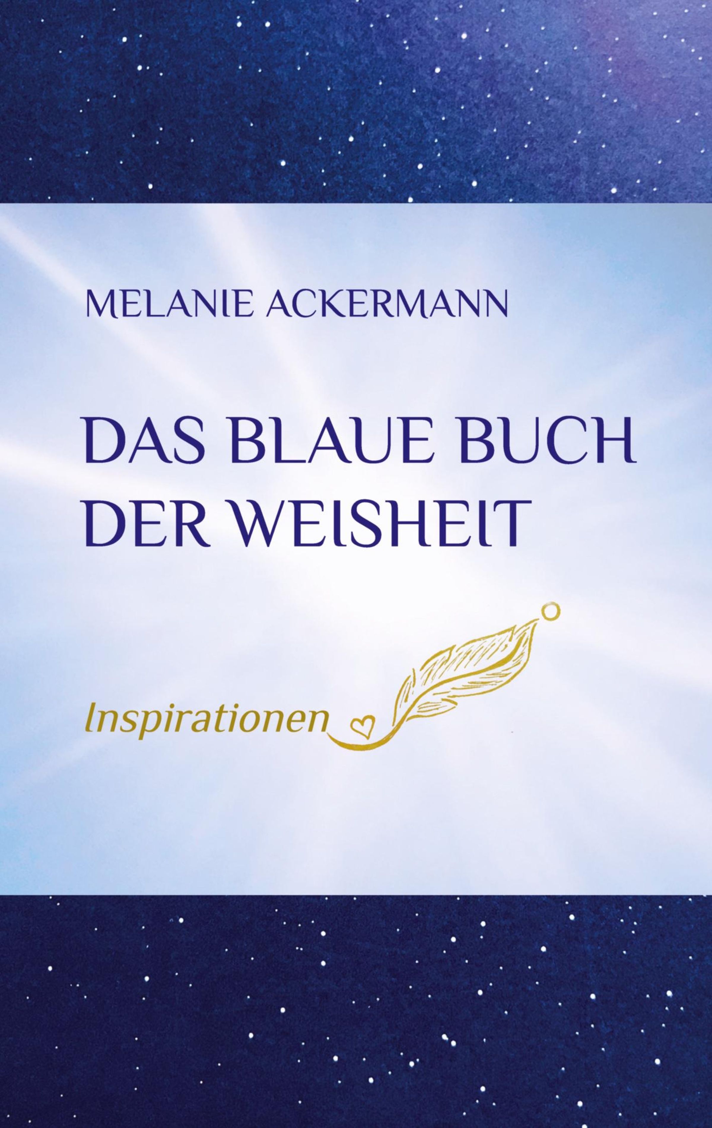 Titel: "Das blaue Buch der Weisheit". Autor: Melanie Ackermann. Ein blauer Hintergrund mit Sternen und einer Feder., Buch