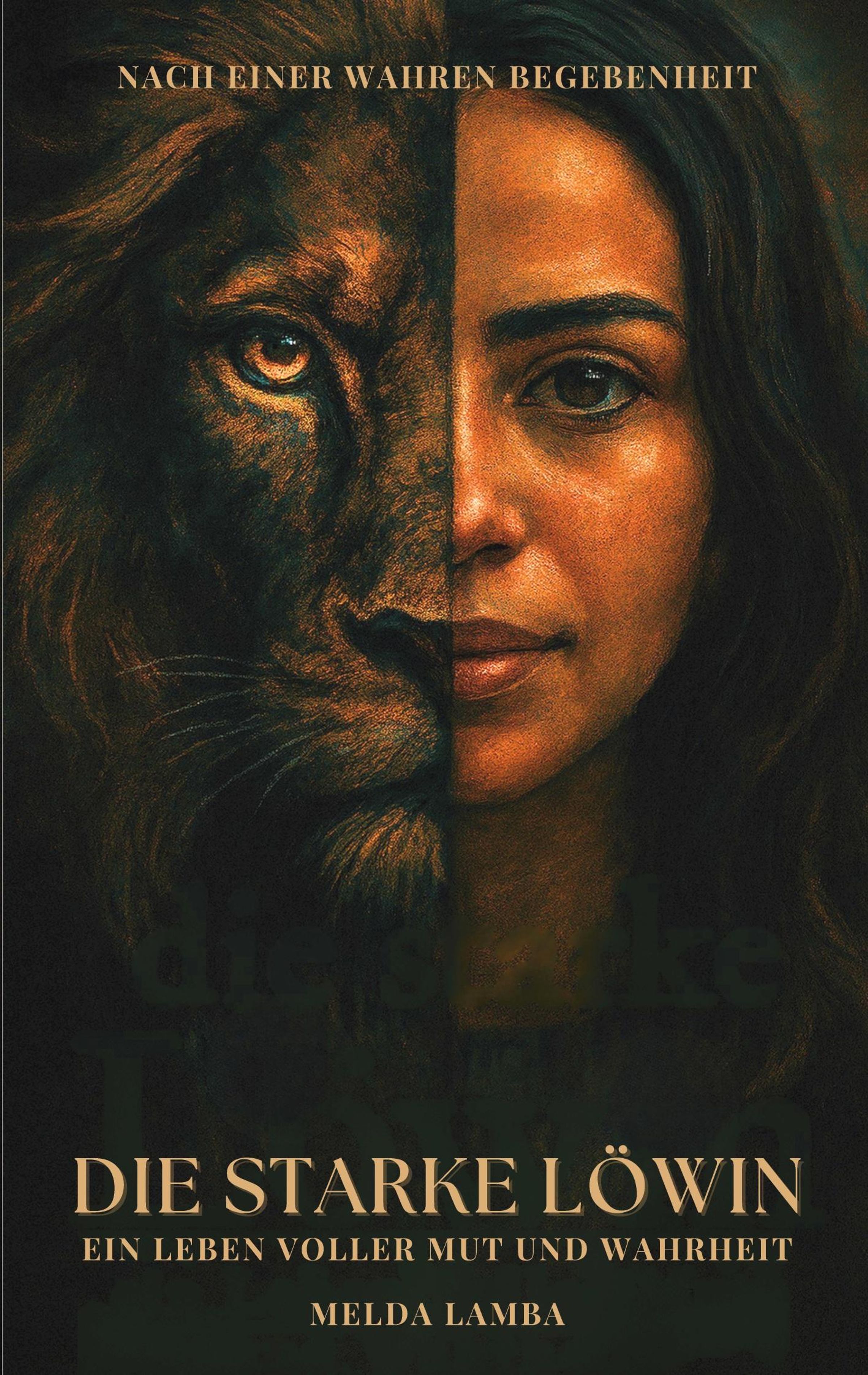 "Die starke Löwin. Ein Leben voller Mut und Wahrheit. Melda Lamba." Illustration: Gesicht halb Frau, halb Löwe., Buch