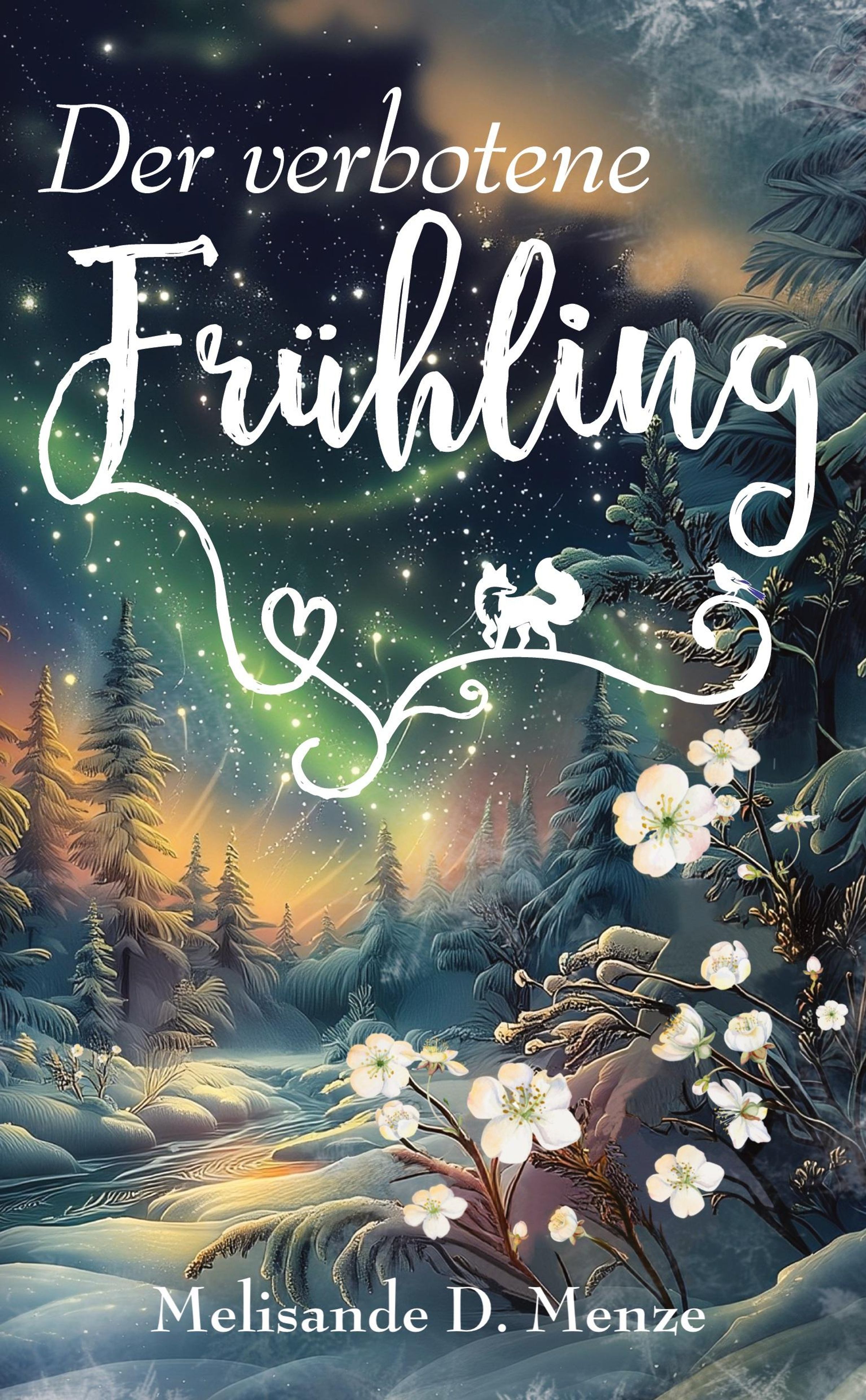 "Der verbotene Frühling" und "Melisande D. Menze" sind in geschwungener Schrift. Verschneite Landschaft mit Blüten., Buch