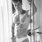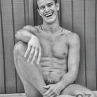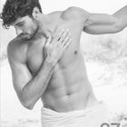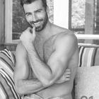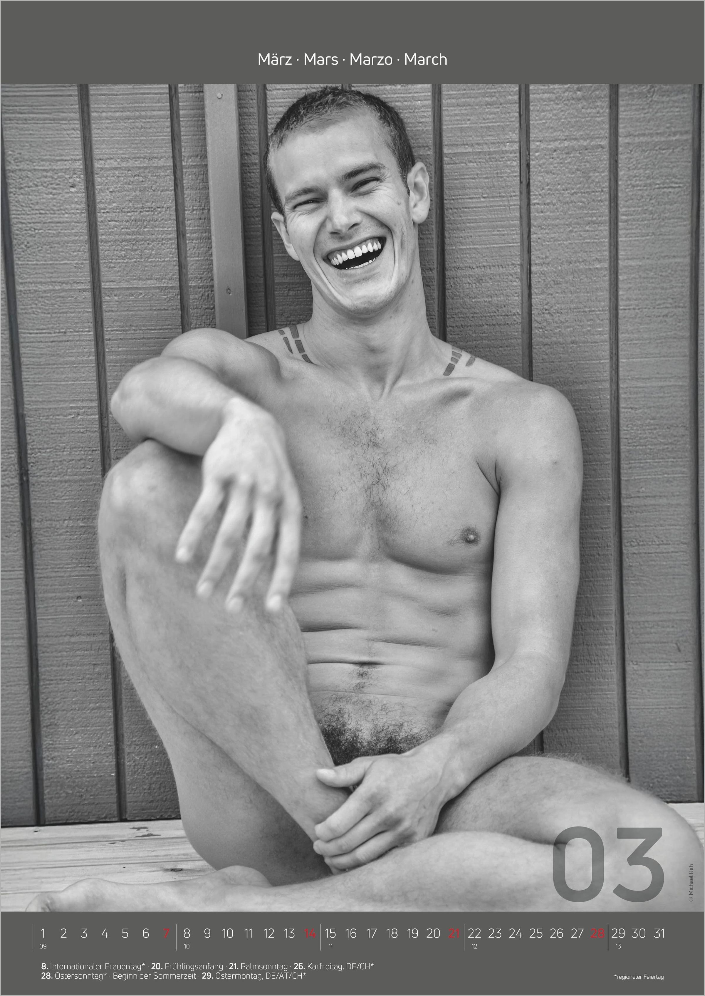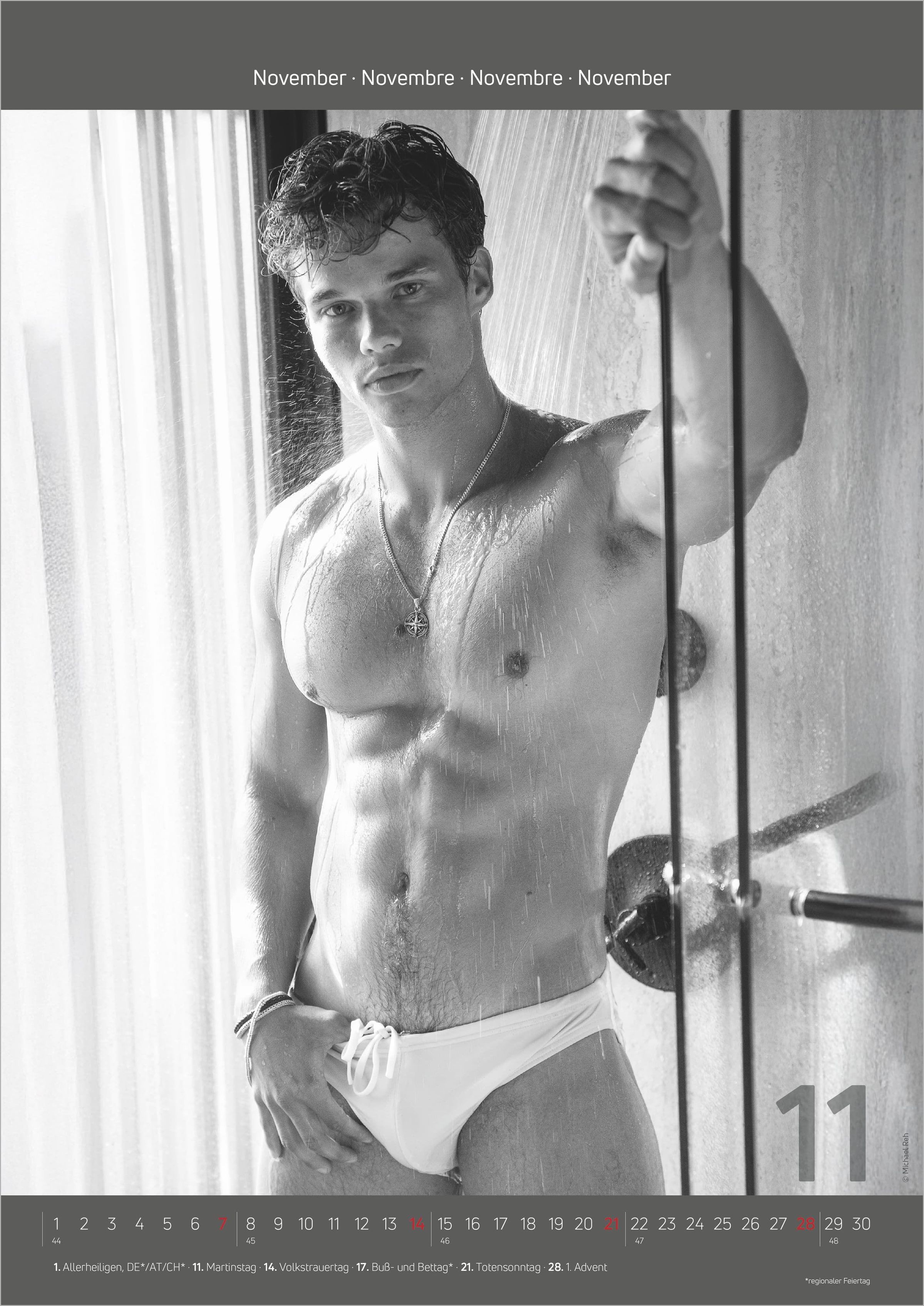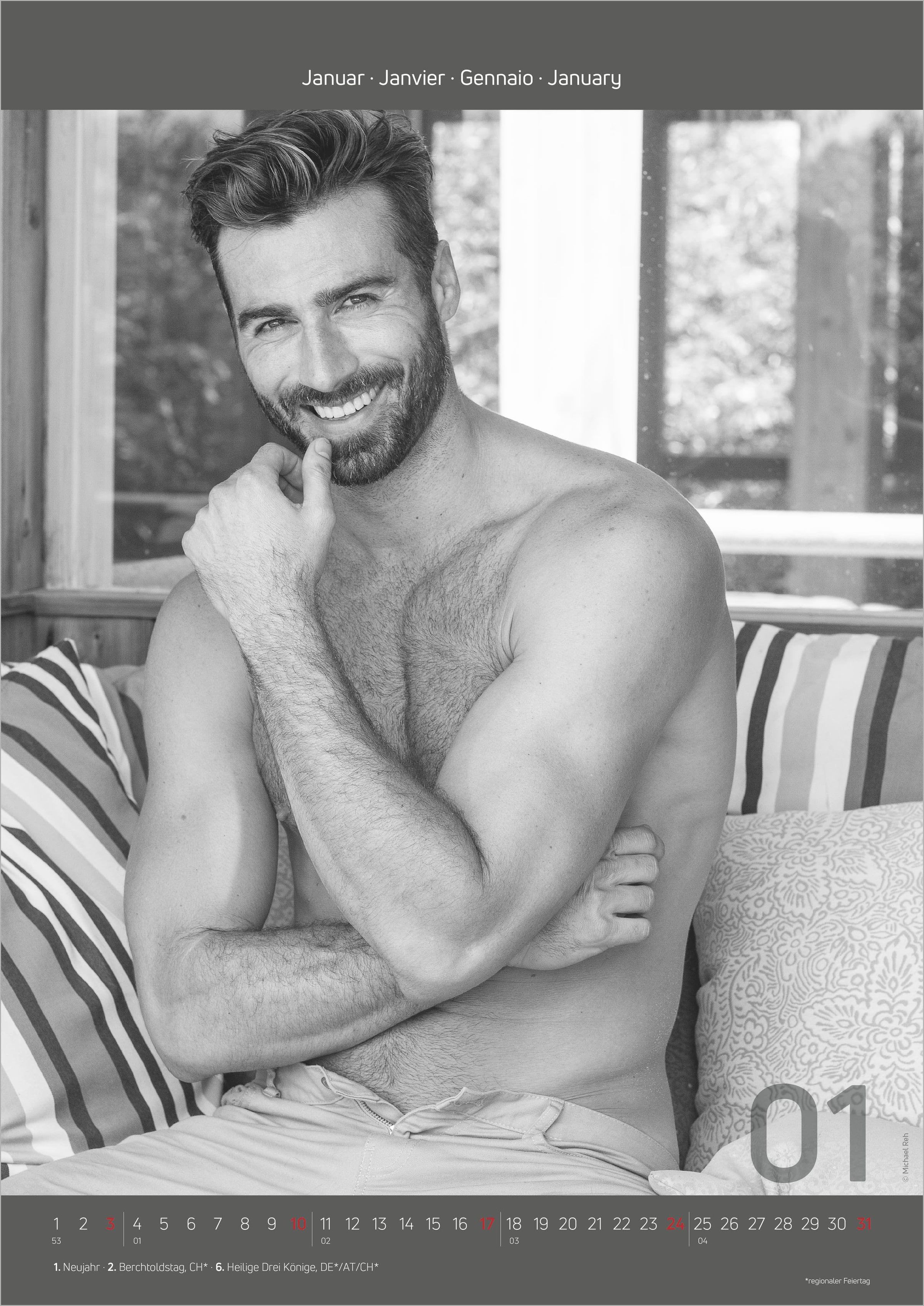 „2027 MEN“ steht auf einem Kalenderblatt. Ein muskulöser Mann in Badehose und offener Hemd sitzt am Strand., Kalender