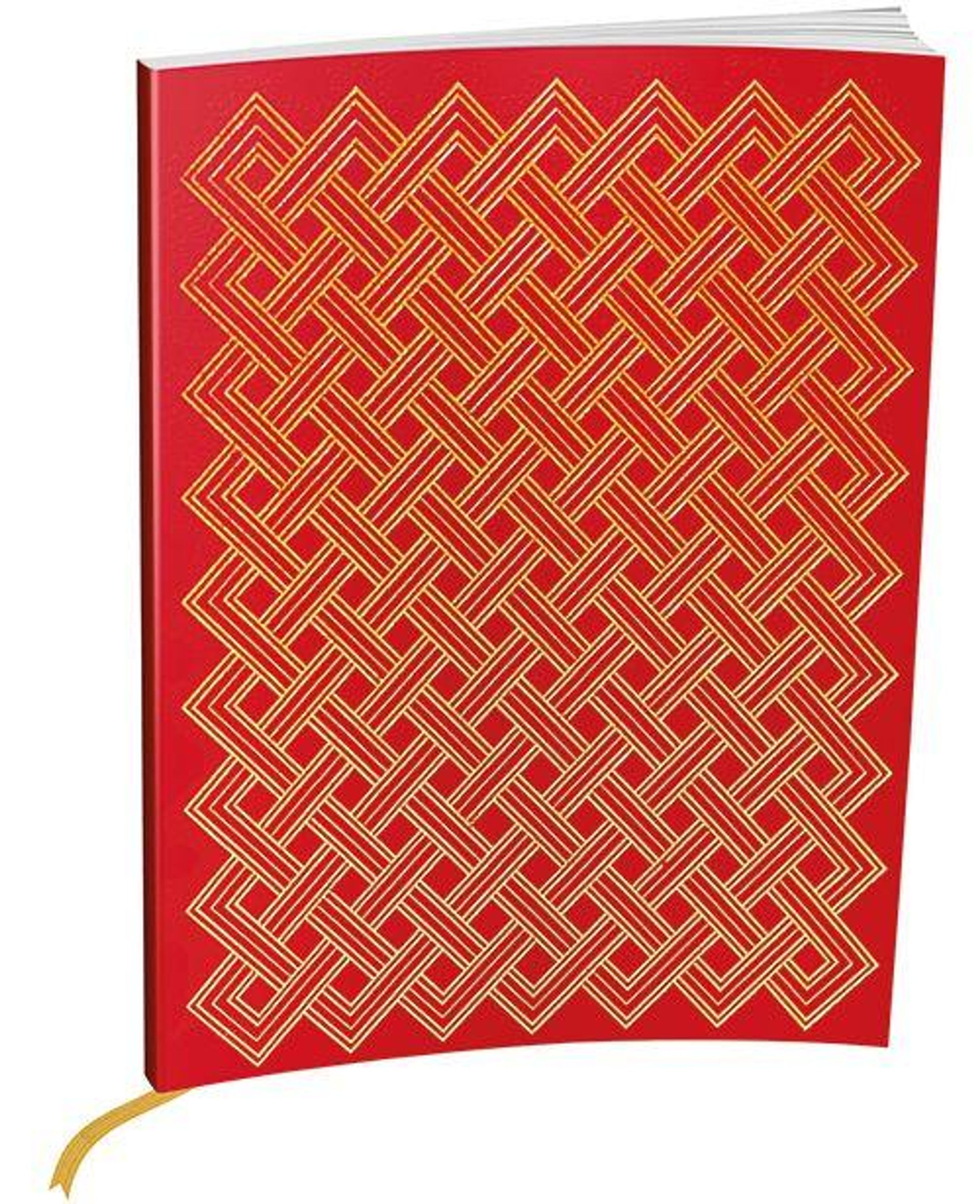 Ein rotes Notizbuch mit einem detaillierten, goldenen geometrischen Muster auf dem Deckel und einem gelben Lesezeichen., Buch