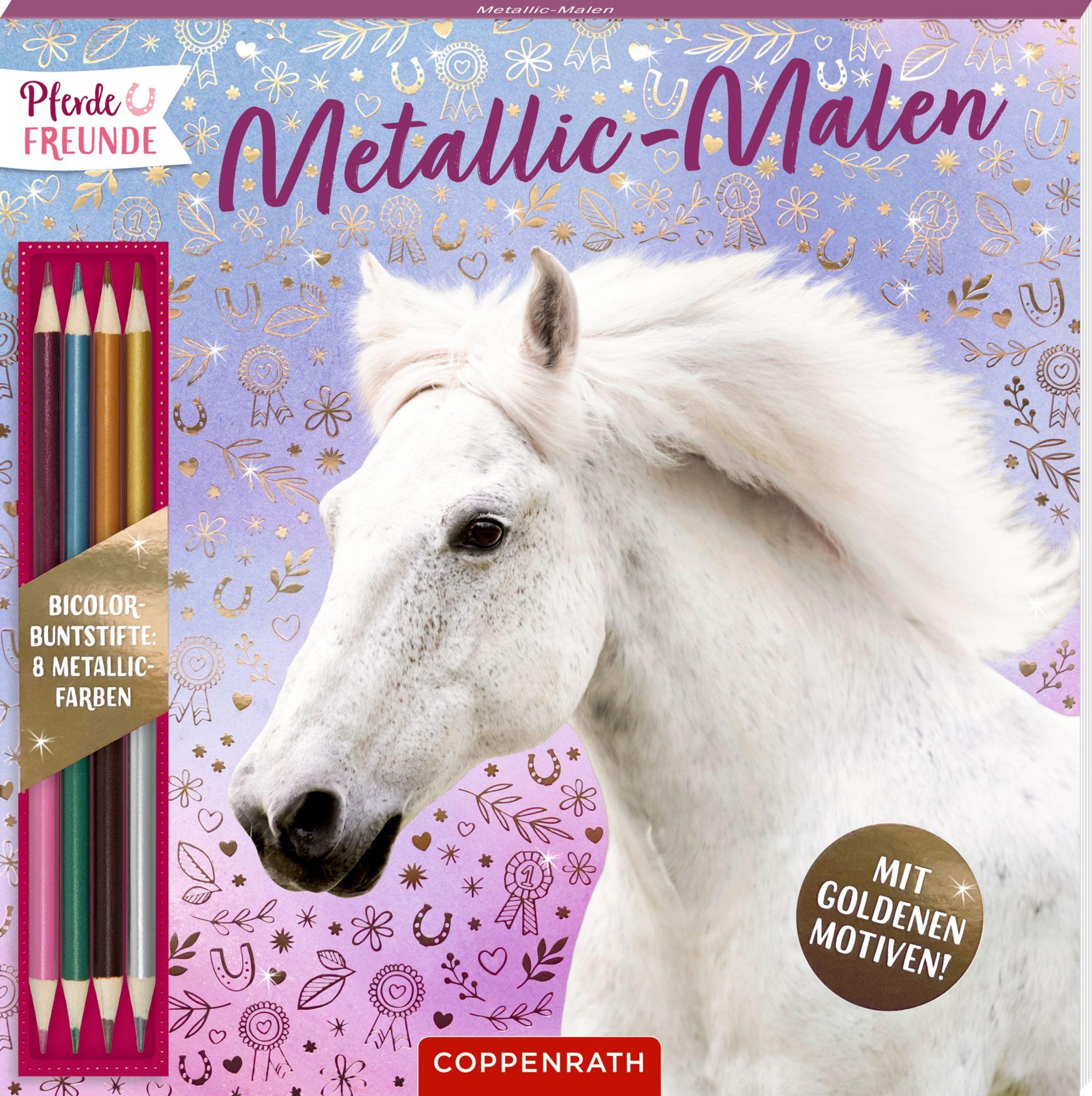 24 zauberhafte Motive, 12 davon mit Metallicfolie Inklusive 4 Bicolor-Stifte mit 8 Metallicfarben Sofort einsatzbereit - alles dabei im Set Fördert Kreativität und sorgt für funkelnde Auszeiten Der hochwertige Malblock enthält 24 wunderschöne Motive, davon 12 mit edlem Metallicfolien-Druck, sowie 4 Bicolor-Buntstifte mit 8 Metallicfarben. So kann das Ausmalen sofort beginnen - für kreativen Zeitvertreib zu Hause und unterwegs. Ideal für kleine Künstlerinnen ab 8 Jahren, die goldenen Metallic-Look und Pferde lieben - einfach auspacken und losmalen!