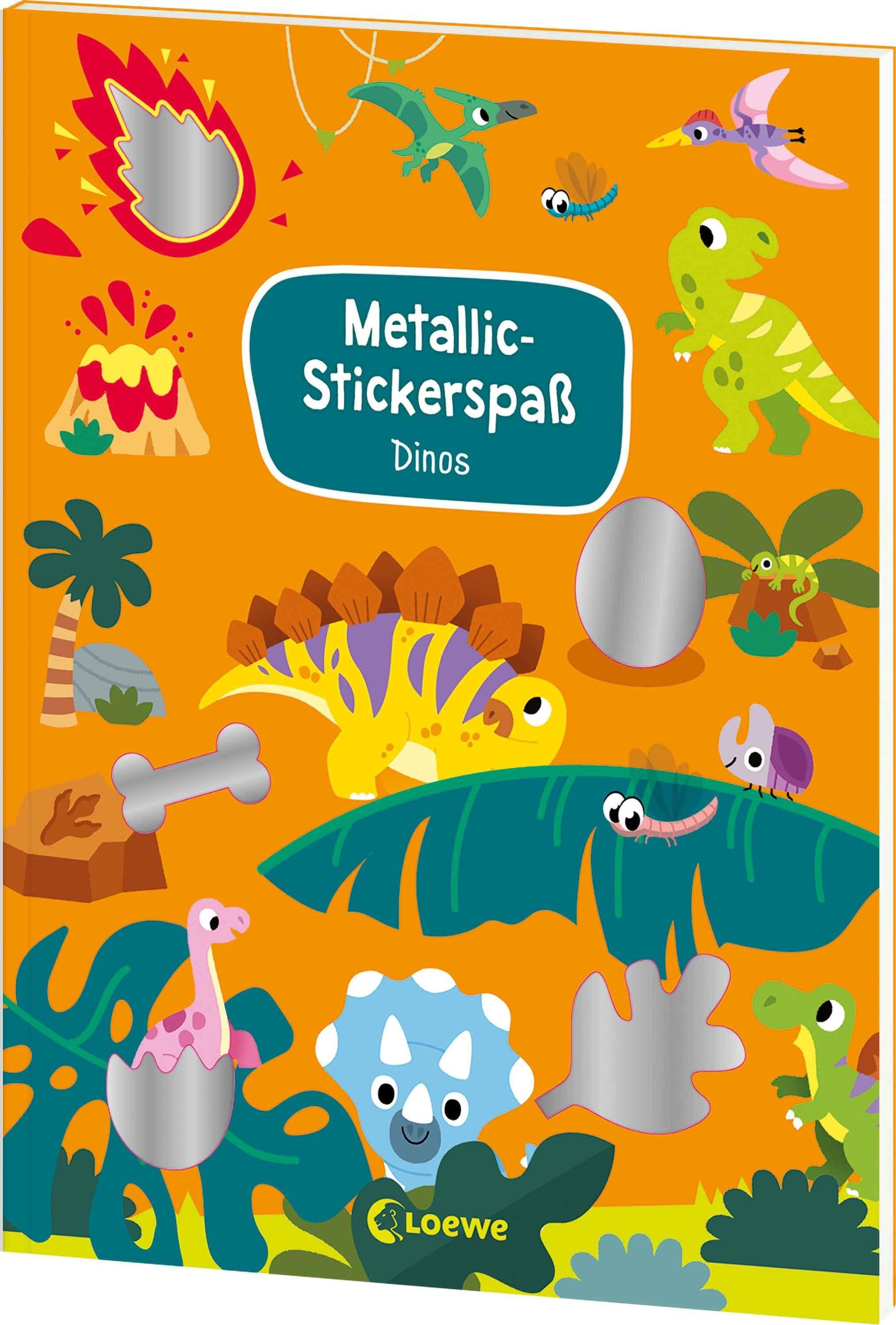 Male und knoble dich durch die aufregende Welt der Dinos und verschönere sie mit coolen Metallic-Stickern. So ist gute Laune garantiert!
