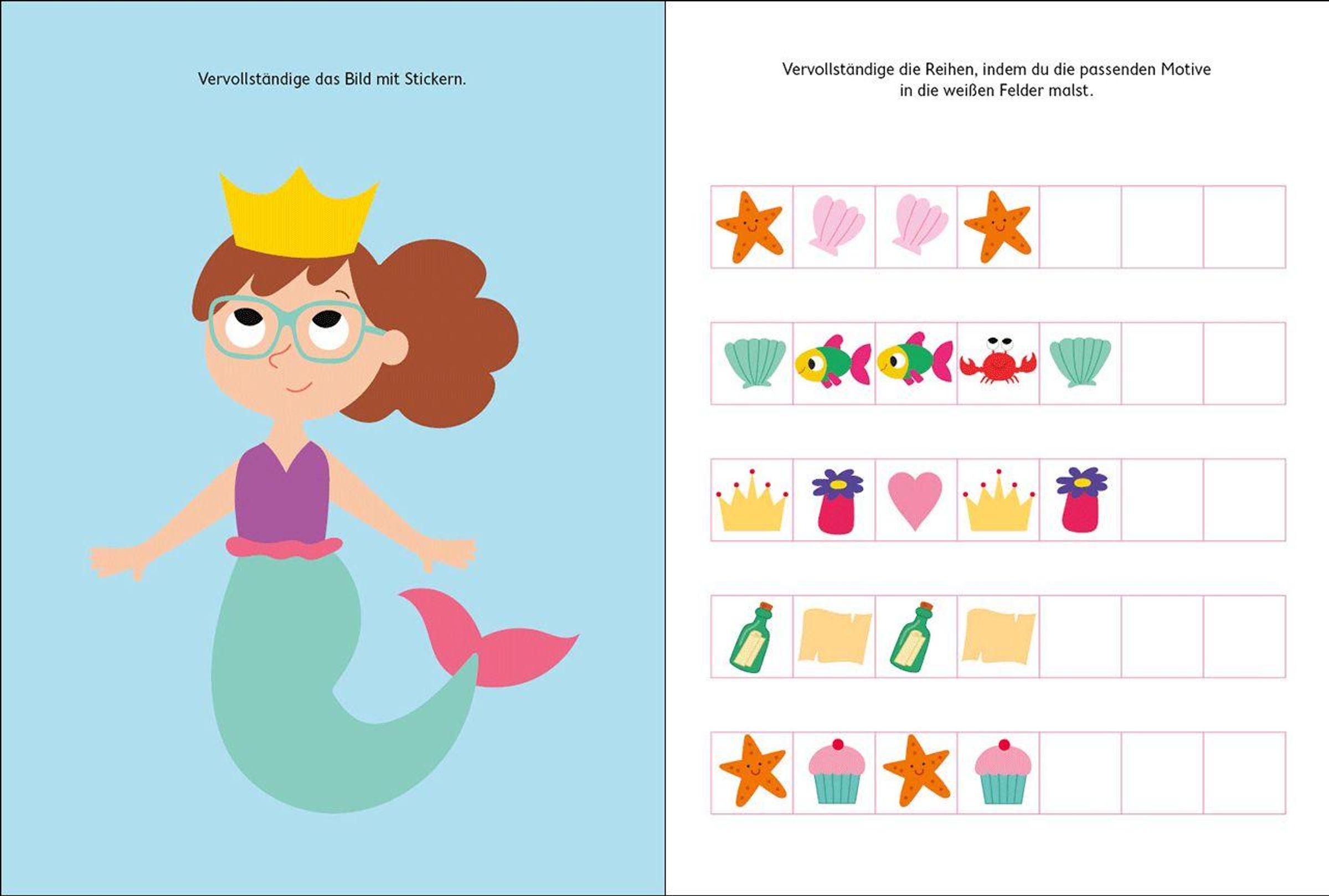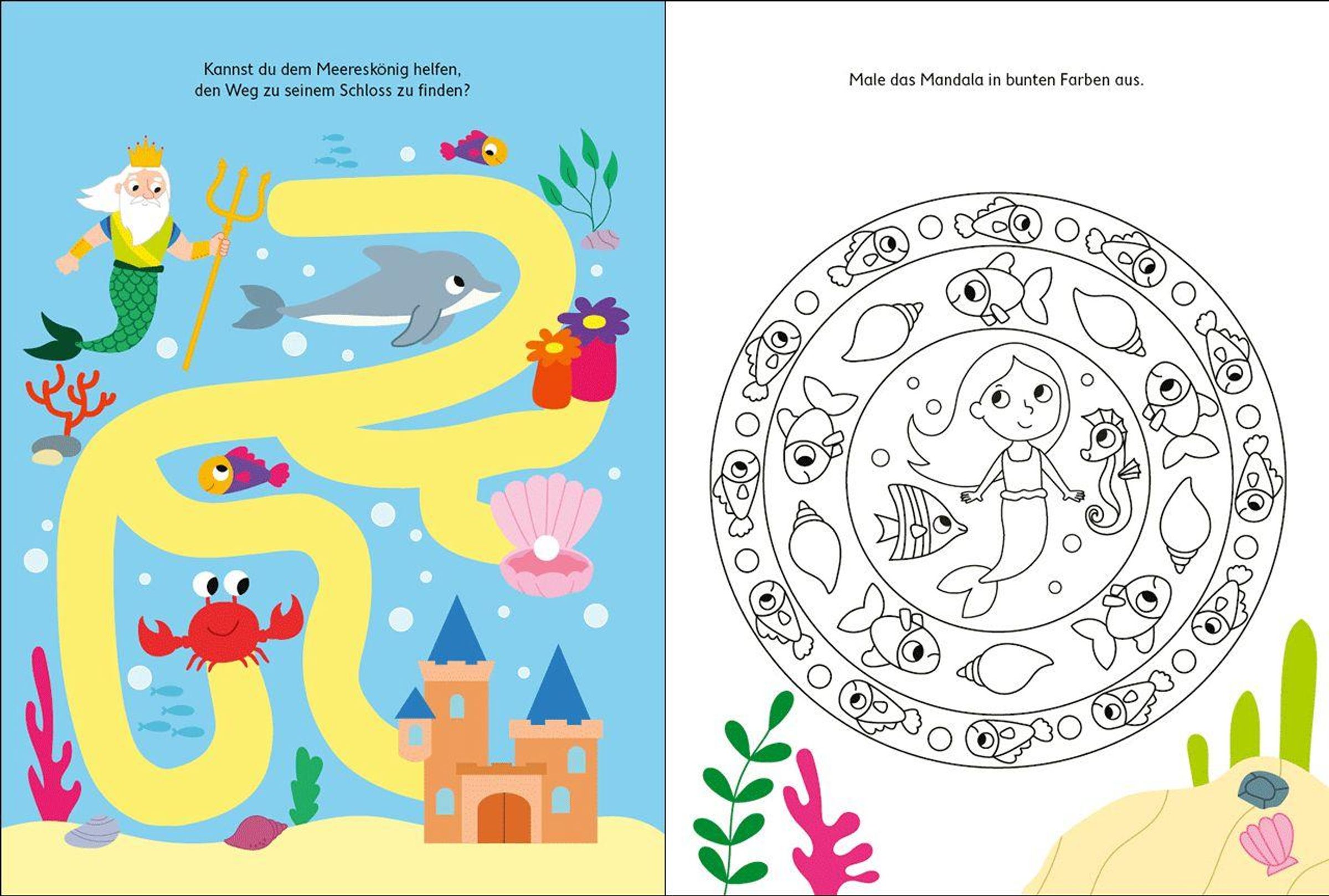 Stickern, Malen, Rätseln Kannst du das Unterwasser-Schloss in bunten Farben ausmalen? Mit welchen Stickern kannst du das Meermädchen schmücken? Und welche Meeresbewohner sehen genau gleich aus?