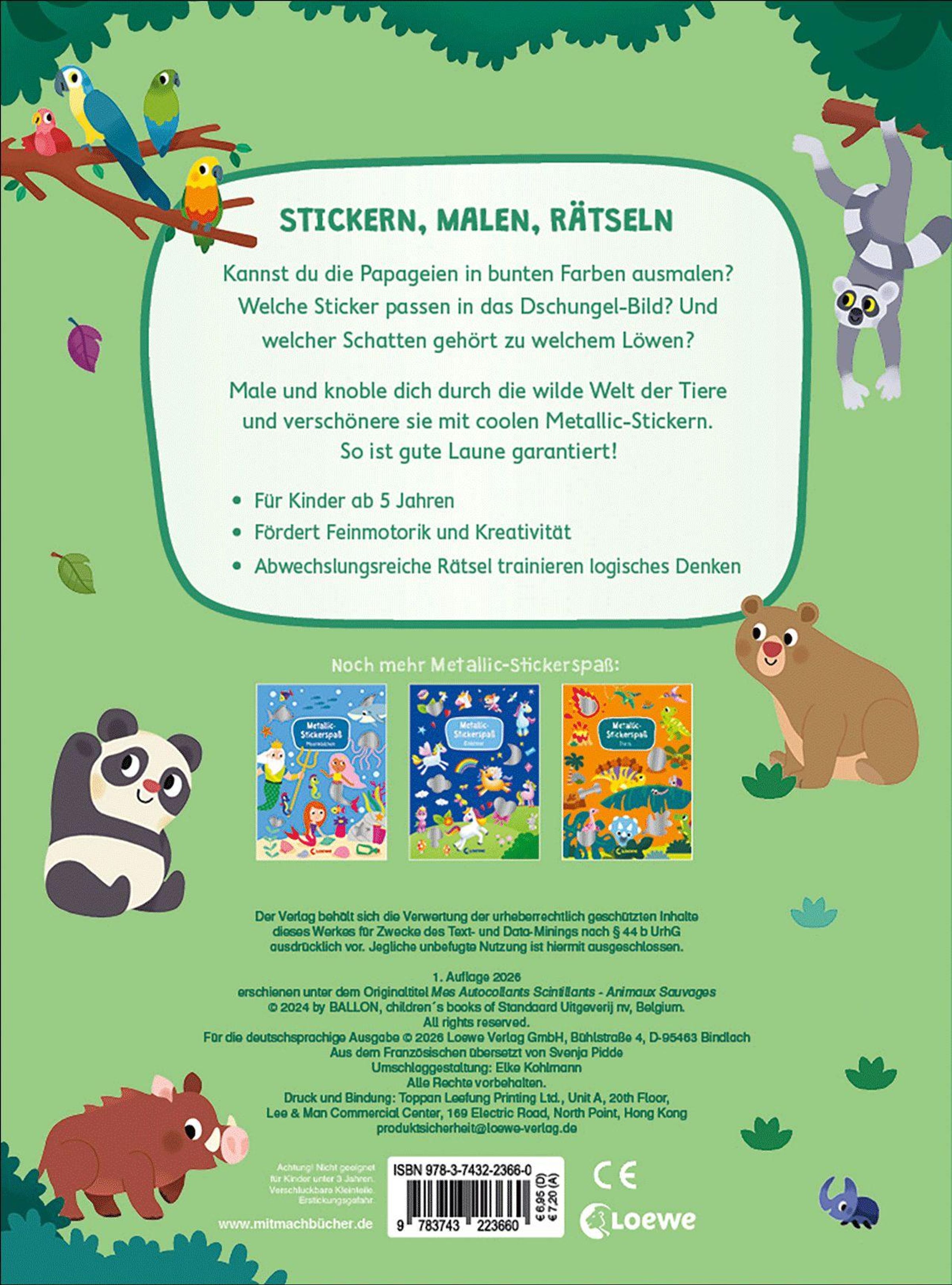 „Metallic-Stickerspaß: Wilde Tiere“ steht auf einem grünen Kinderbuch mit bunten Tierillustrationen., Buch