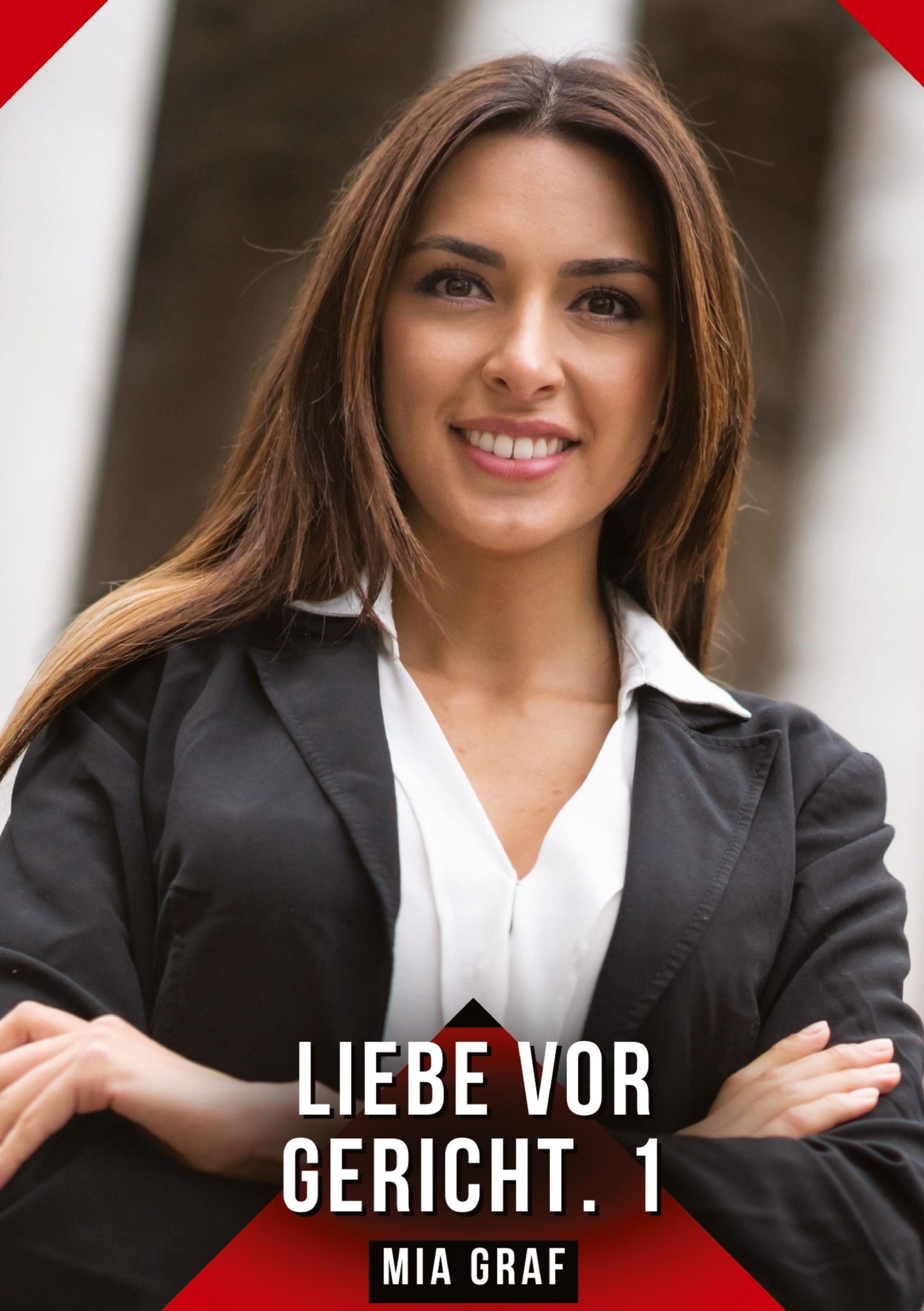 "LIEBE VOR GERICHT. 1" und "MIA GRAF". Frauenportrait, vertrauensvoll lächelnd in Business-Kleidung., Buch