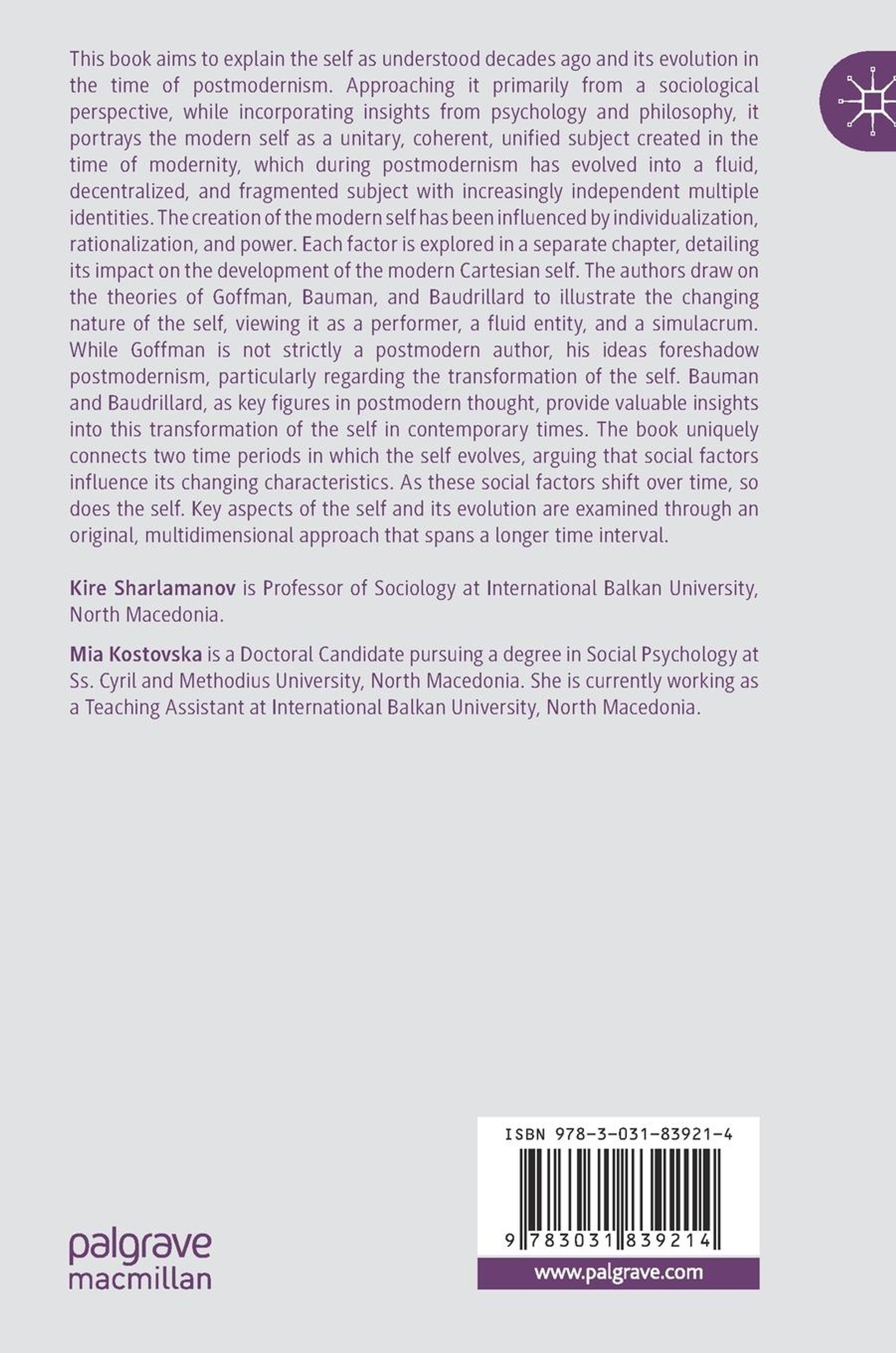 This book aims to explain the self as understood decades ago and its evolution in the time of postmodernism. Approaching it primarily from a sociological perspective, while incorporating insights from psychology and philosophy, it portrays the modern self as a unitary, coherent, unified subject created in the time of modernity, which during postmodernism has evolved into a fluid, decentralized, and fragmented subject with increasingly independent multiple identities. The creation of the modern self has been influenced by individualization, rationalization, and power. Each factor is explored in a separate chapter, detailing its impact on the development of the modern Cartesian self. The authors draw on the theories of Goffman, Bauman, and Baudrillard to illustrate the changing nature of the self, viewing it as a performer, a fluid entity, and a simulacrum. While Goffman is not strictly a postmodern author, his ideas foreshadow postmodernism, particularly regarding the transformation of the self. Bauman and Baudrillard, as key figures in postmodern thought, provide valuable insights into this transformation of the self in contemporary times. The book uniquely connects two time periods in which the self evolves, arguing that social factors influence its changing characteristics. As these social factors shift over time, so does the self. Key aspects of the self and its evolution are examined through an original, multidimensional approach that spans a longer time interval.