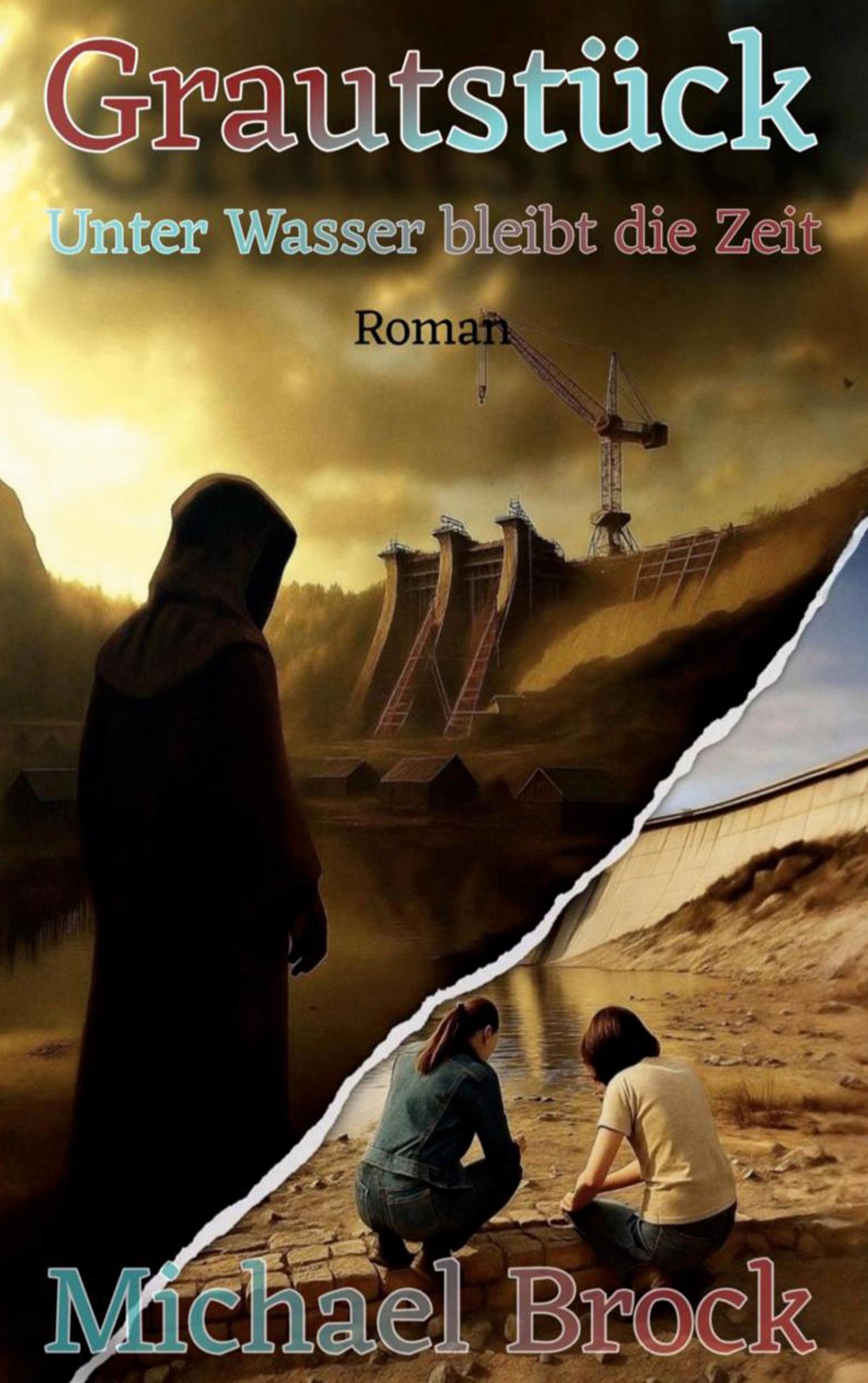 „Grautstück: Unter Wasser bleibt die Zeit“. Zwei Szenen: eine dunkle Gestalt vor Staudamm, zwei Personen am Ufer kniend., Buch