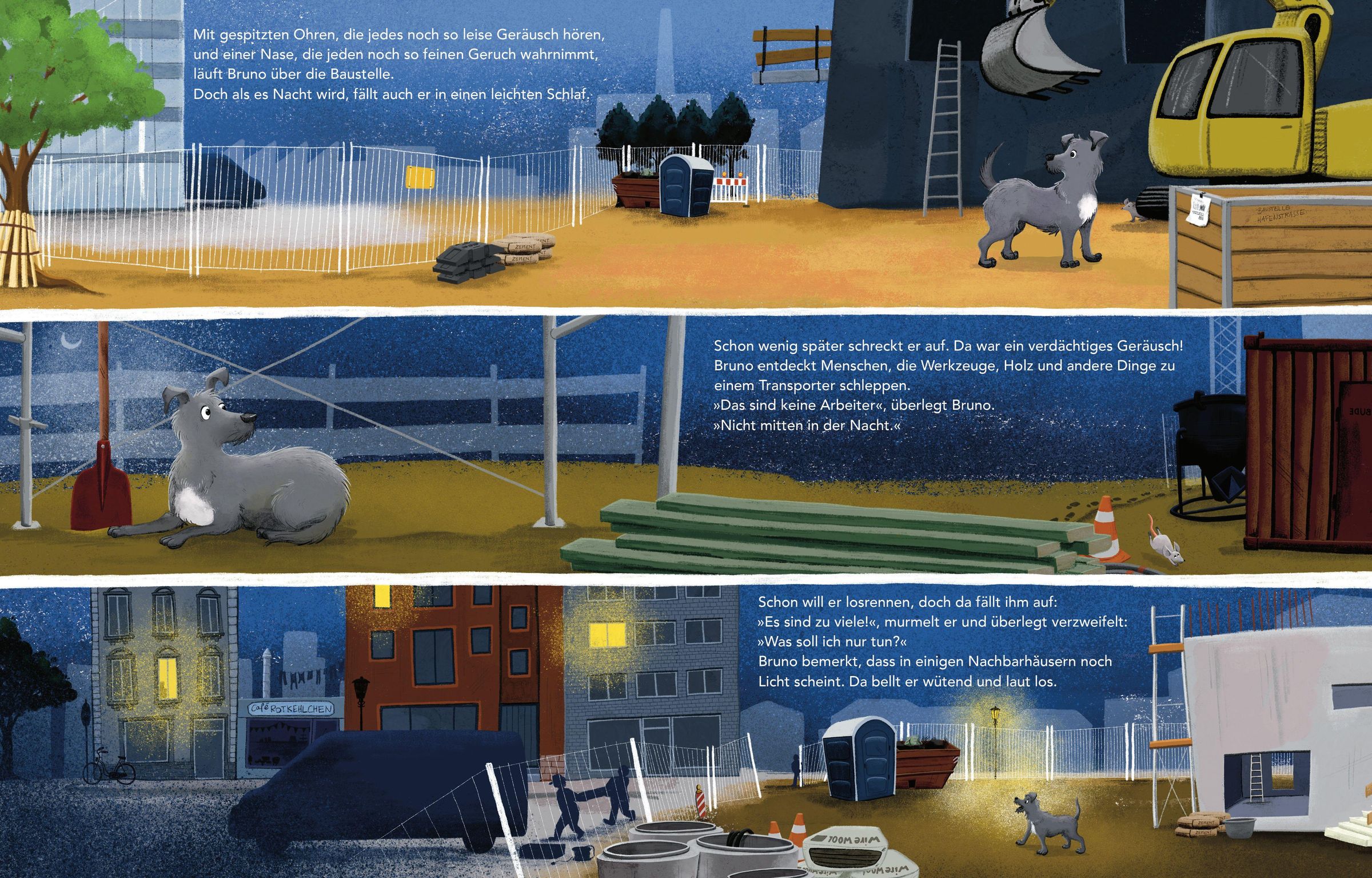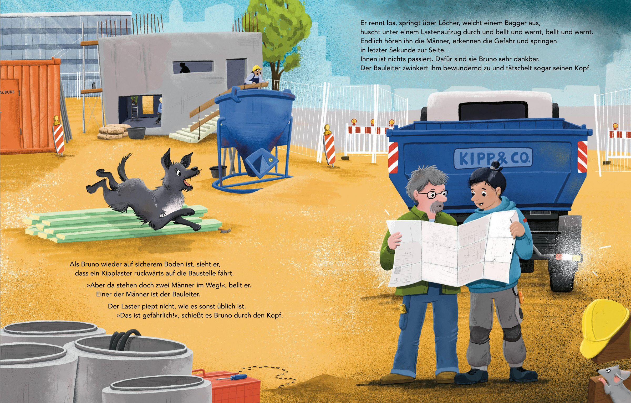 Eines Tages entdeckt er eine Baustelle und ist sofort fasziniert - hier möchte er helfen! Doch der Bauleiter sagt: 'Keine Hunde auf der Baustelle!' Aber mit Mut, Cleverness und Durchhaltevermögen beweist Bruno, dass er genau dort hingehört. Er verhindert einen Unfall mit einem Baufahrzeug und schützt die Baustelle nachts vor Dieben.