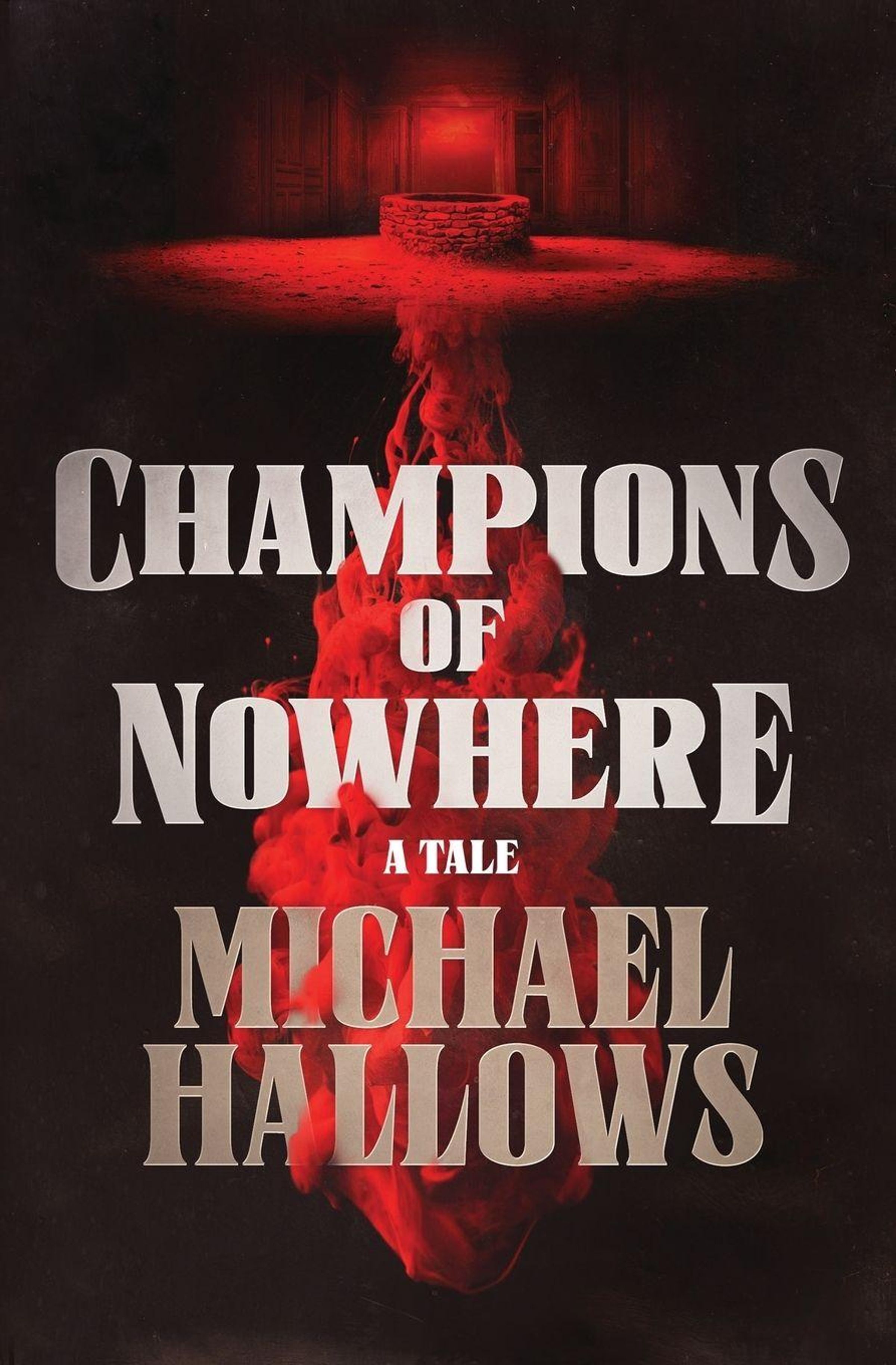 "Champions of Nowhere", "A Tale", "Michael Hallows". Dunkle, mystische Illustration mit einem Brunnen und rotem Rauch., Buch