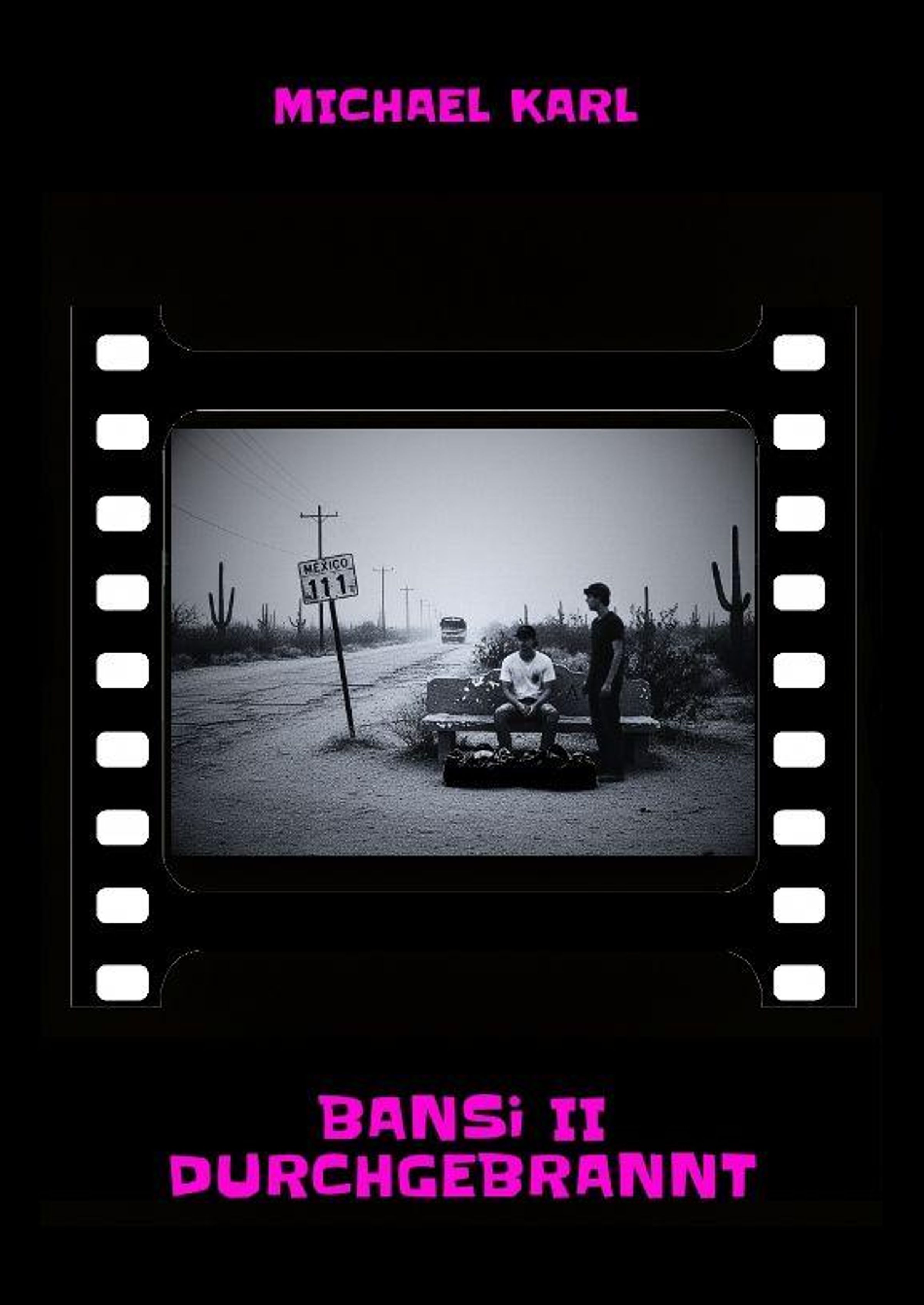 Text: "Michael Karl", "Bansi ii Durchgebrannt". Schwarz-weiß Bild: Zwei Menschen an Straßenschild, karger Weg. Filmstreifen-Rahmen., Buch