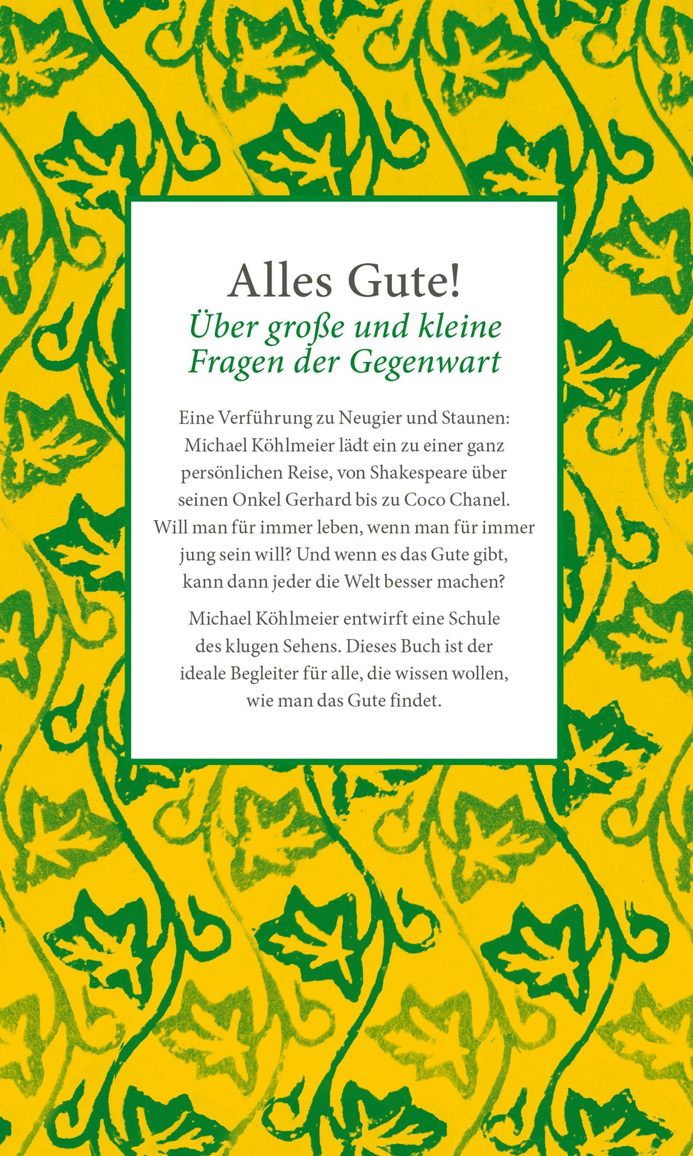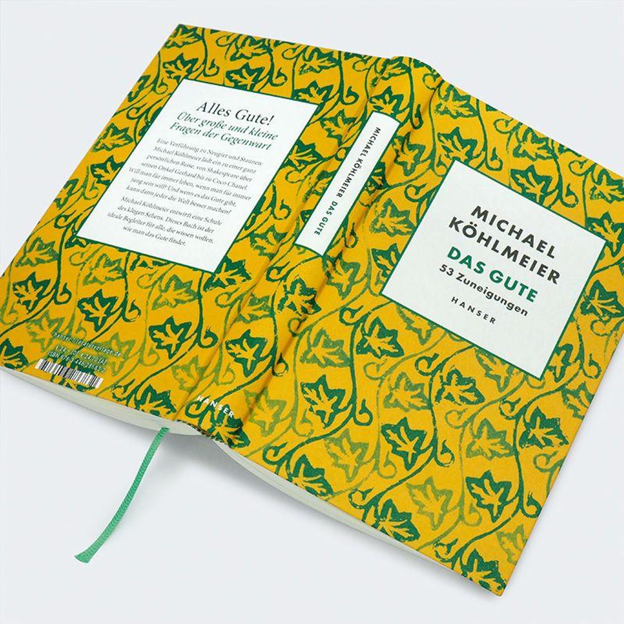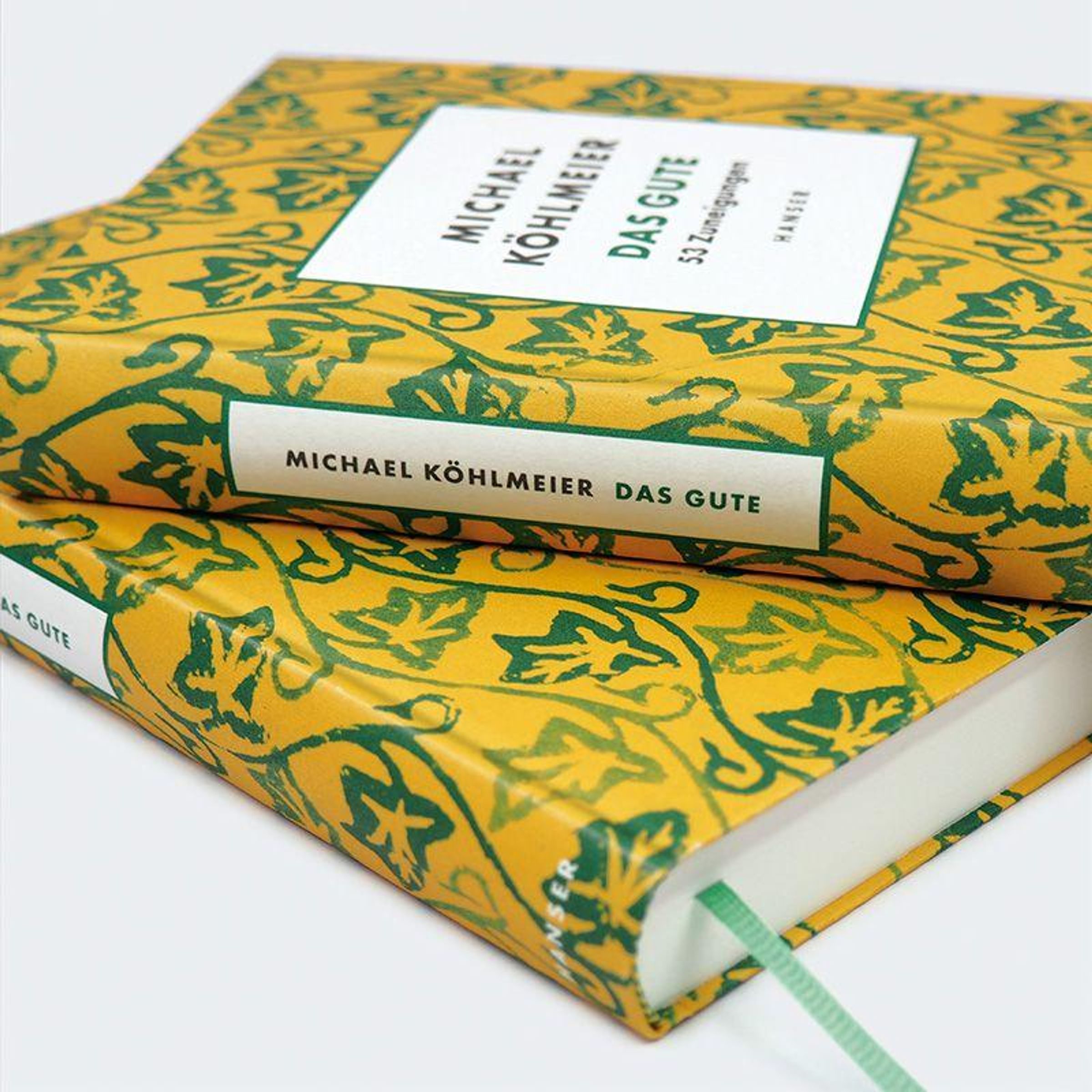 „MICHAEL KÖHLMEIER, DAS GUTE, 53 Zuneigungen, HANSER“ in einem weißen Feld mit grün-gelbem Blättermuster als Hintergrund., Buch