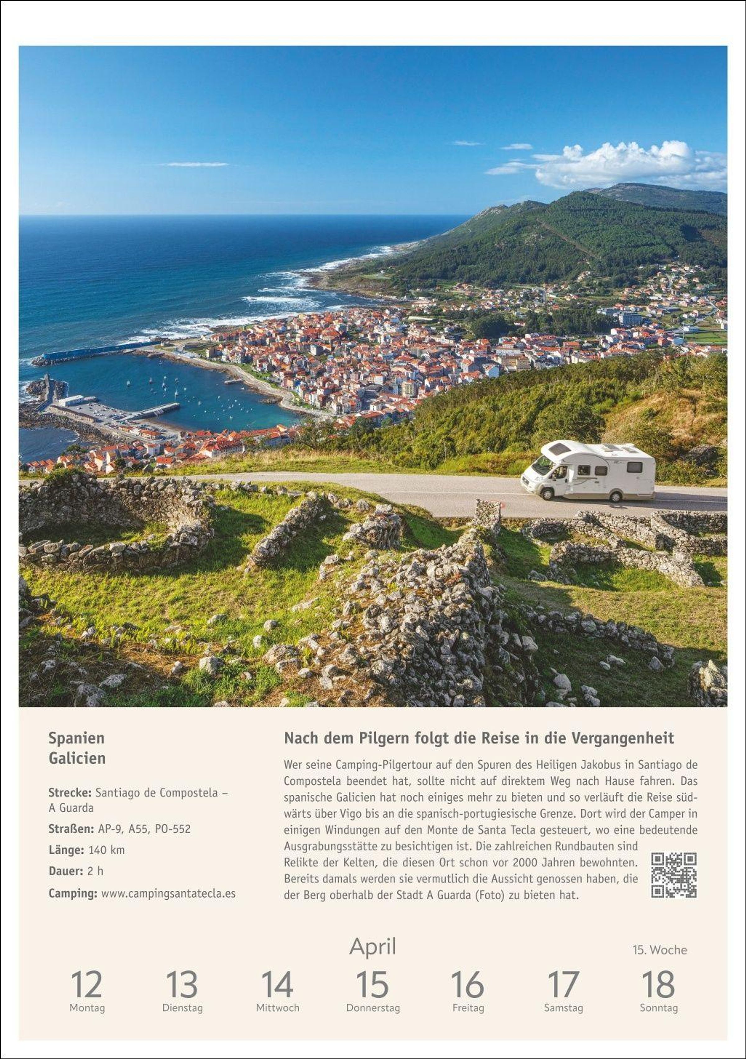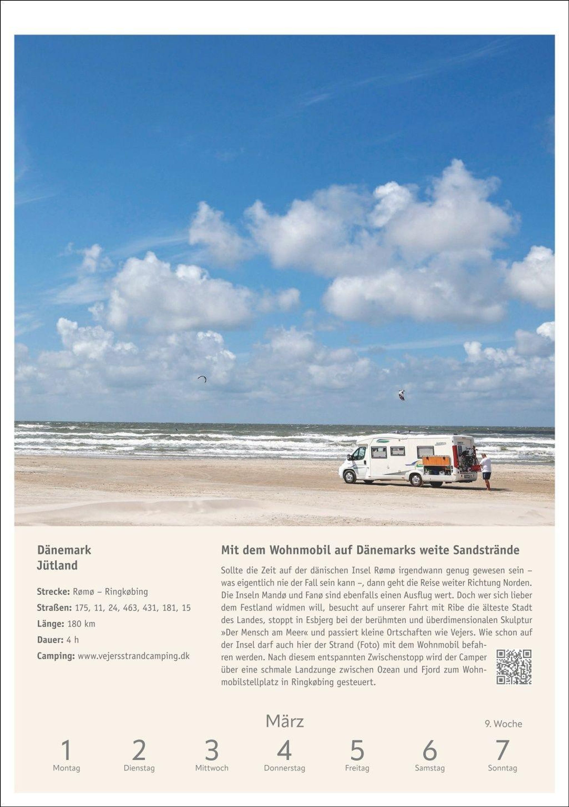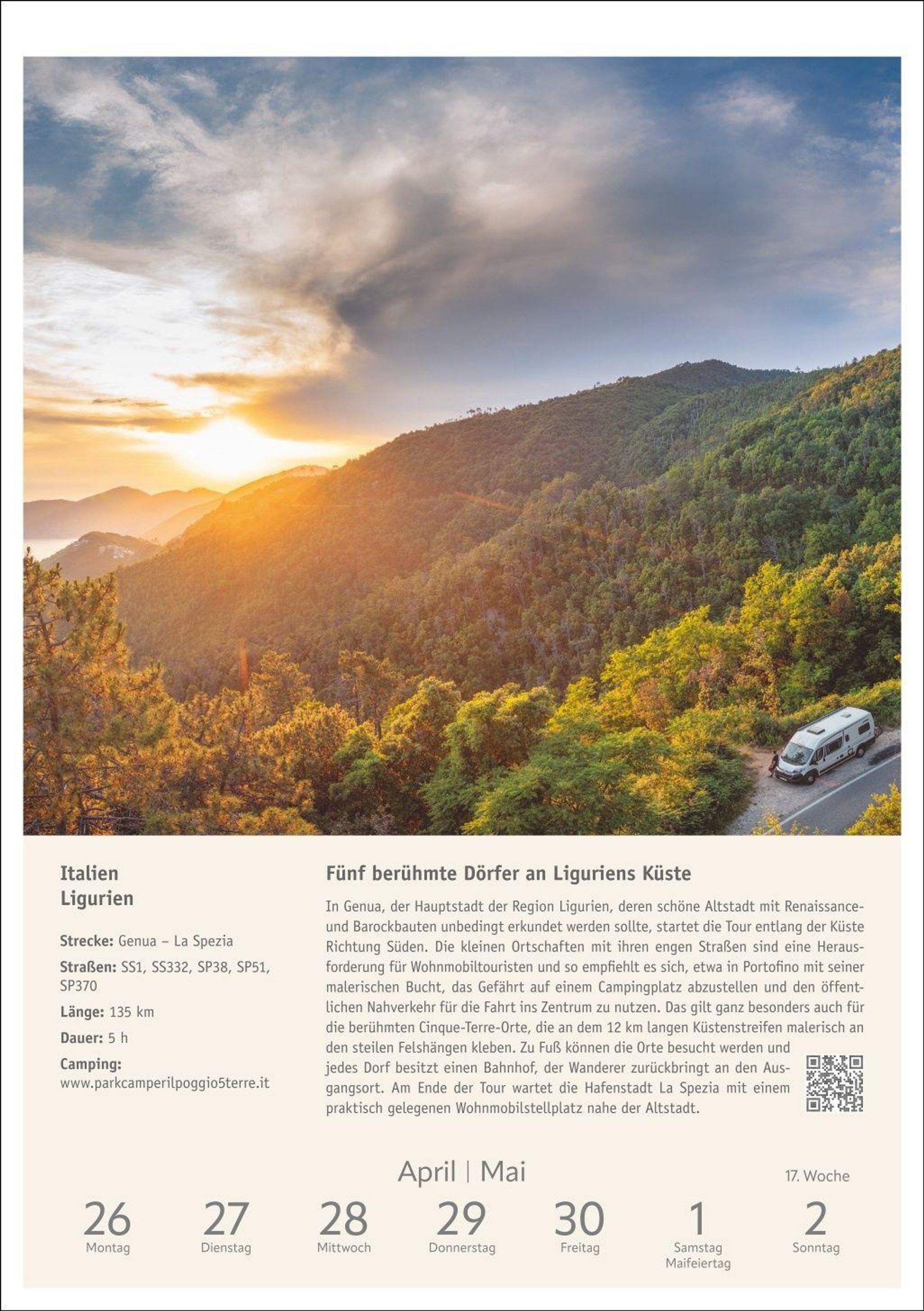 Inspiration und Information: Beschreibung der Route inklusive Infokasten zu Etappen und Highlights, Stellplatztipps sowie QR-Code mit weiterführendem Link zu jedem Wohnmobiltrip