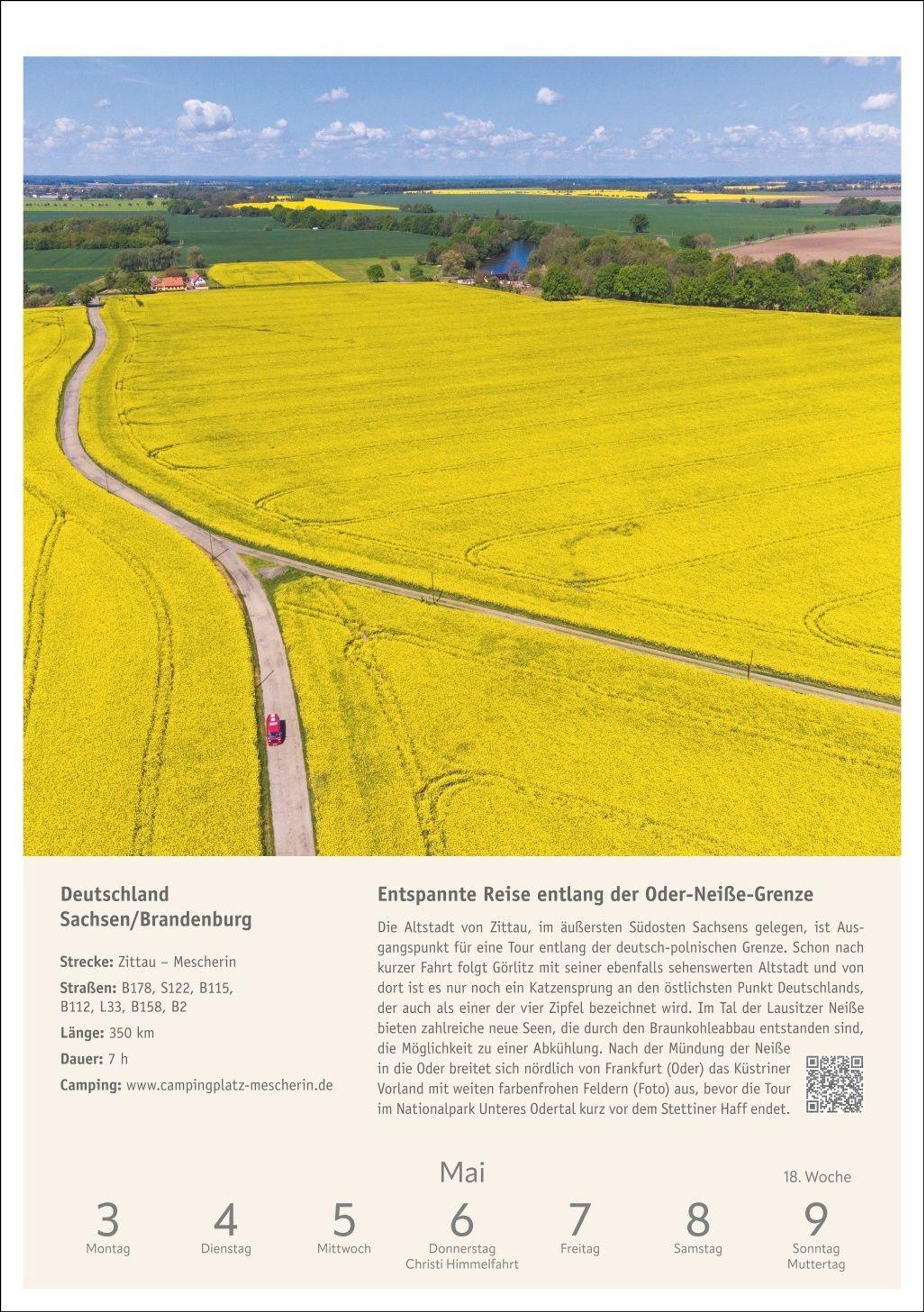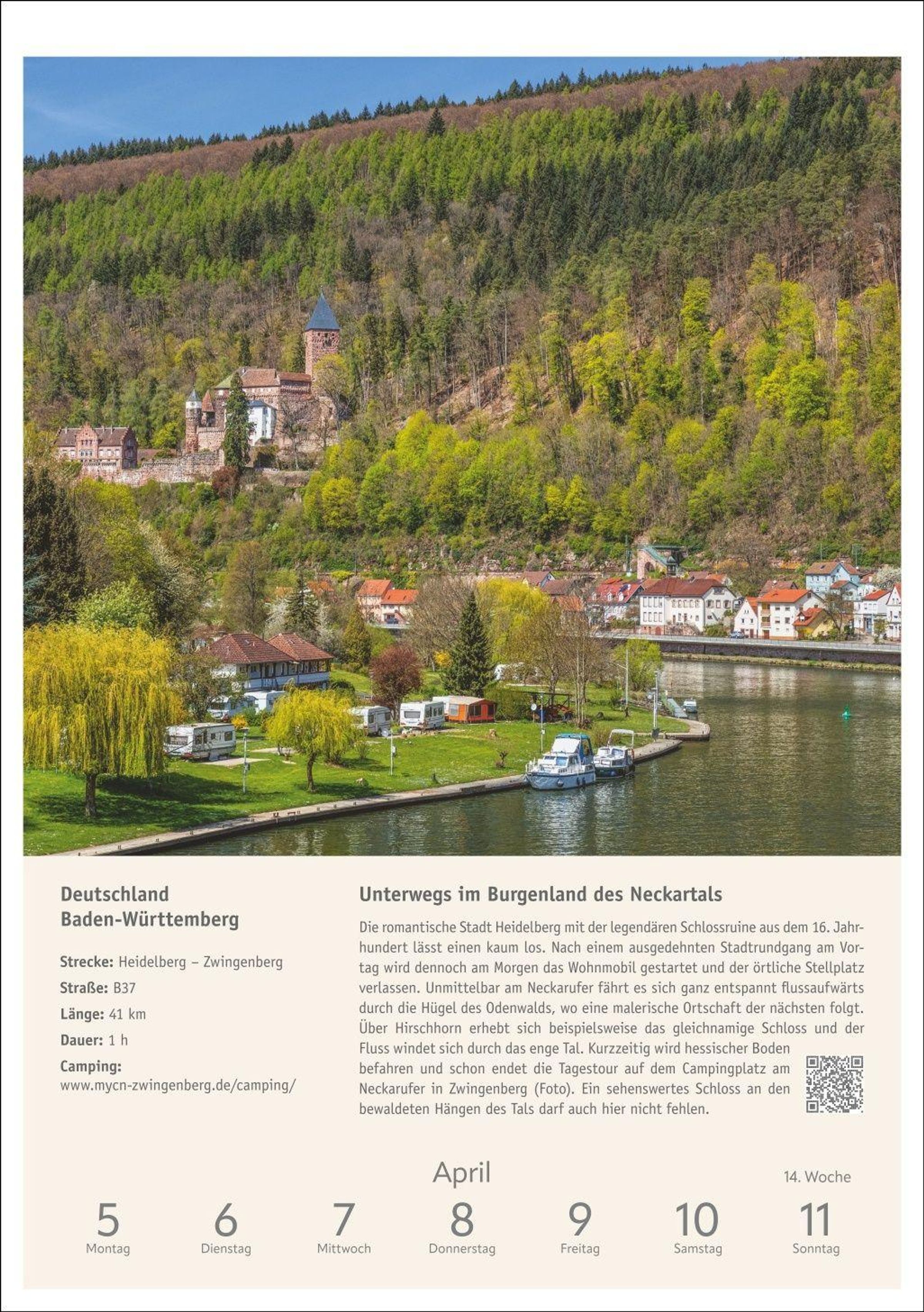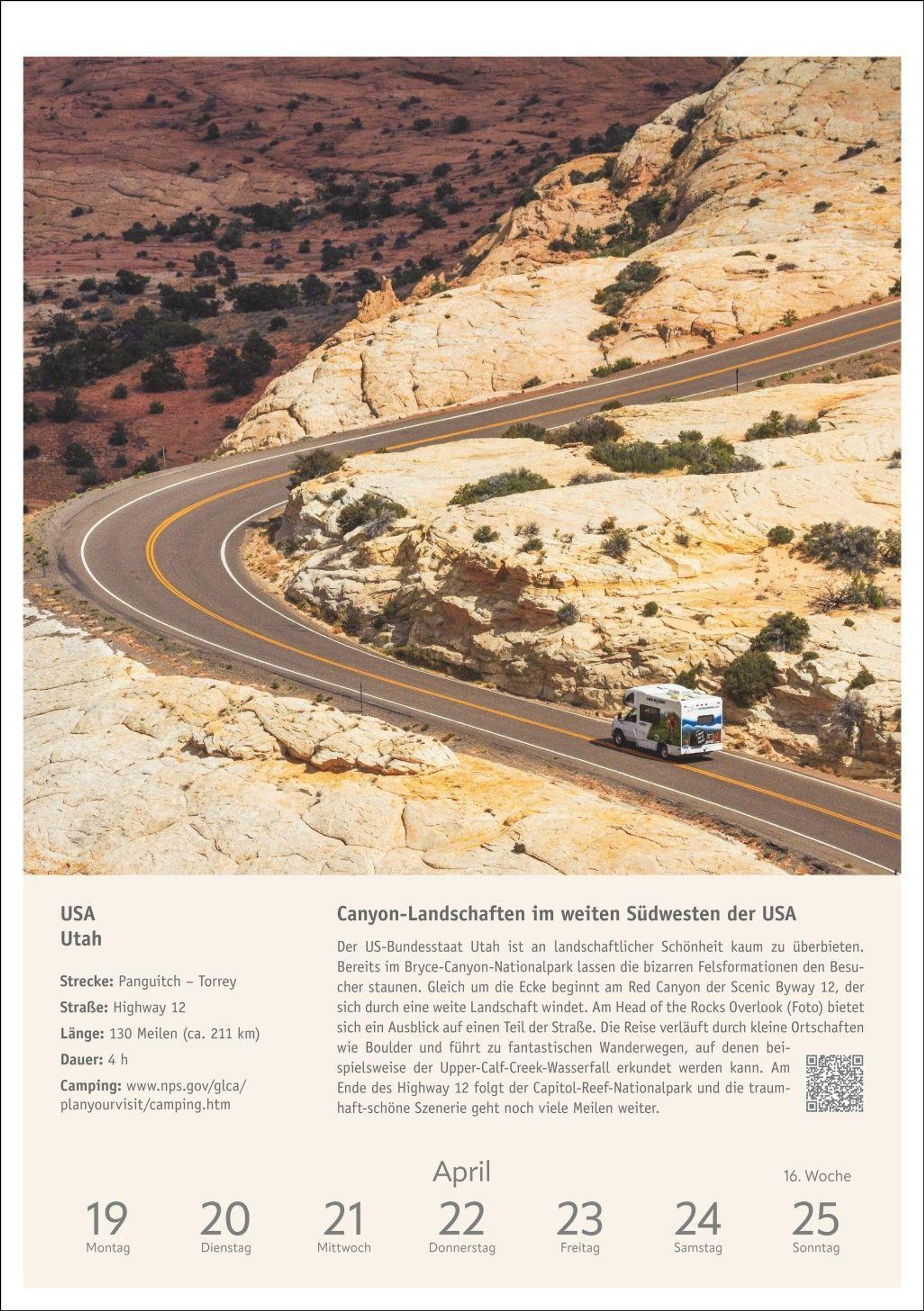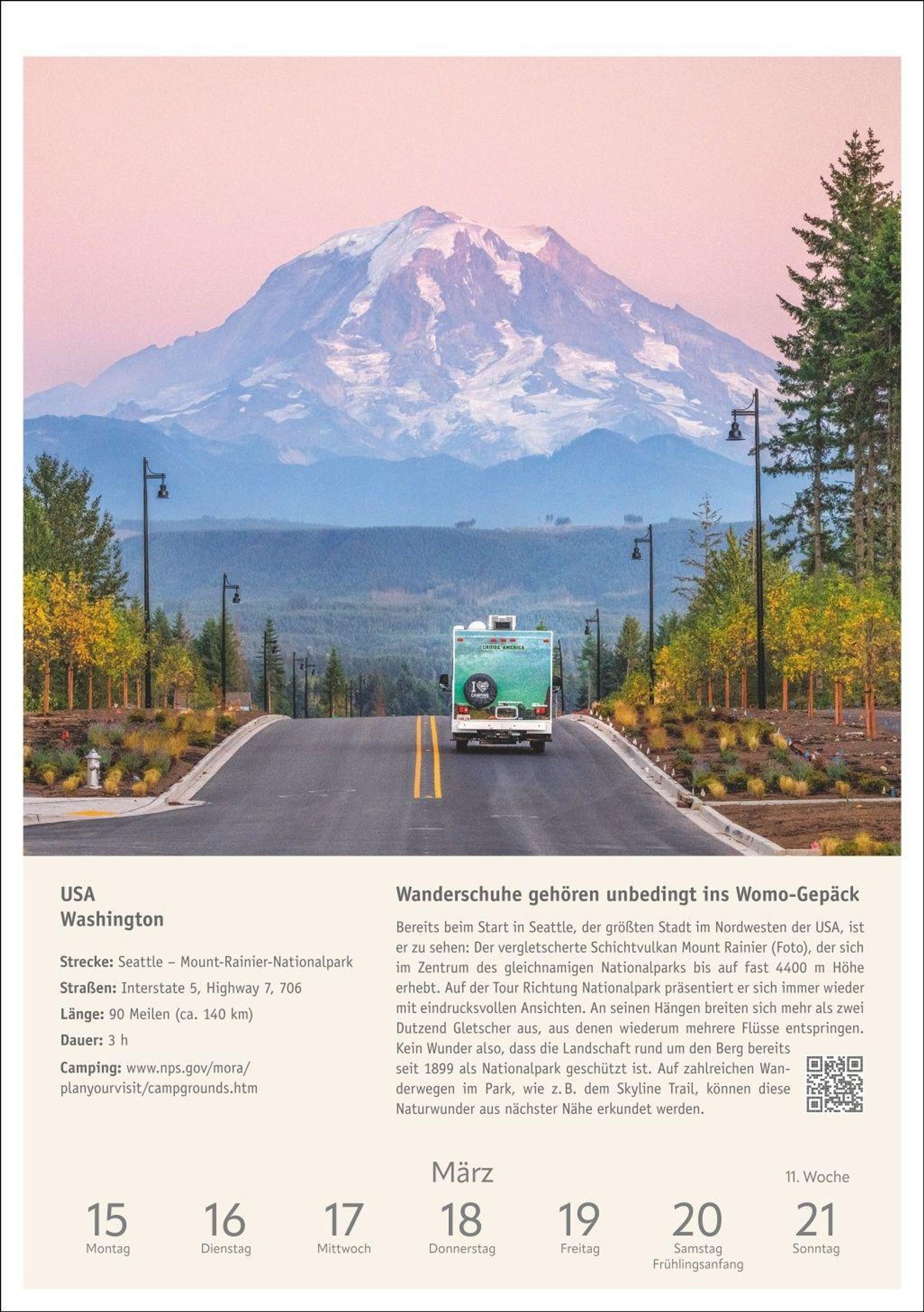 Inspiration und Information: Beschreibung der Route inklusive Infokasten zu Etappen und Highlights, Stellplatztipps sowie QR-Code mit weiterführendem Link zu jedem Wohnmobiltrip