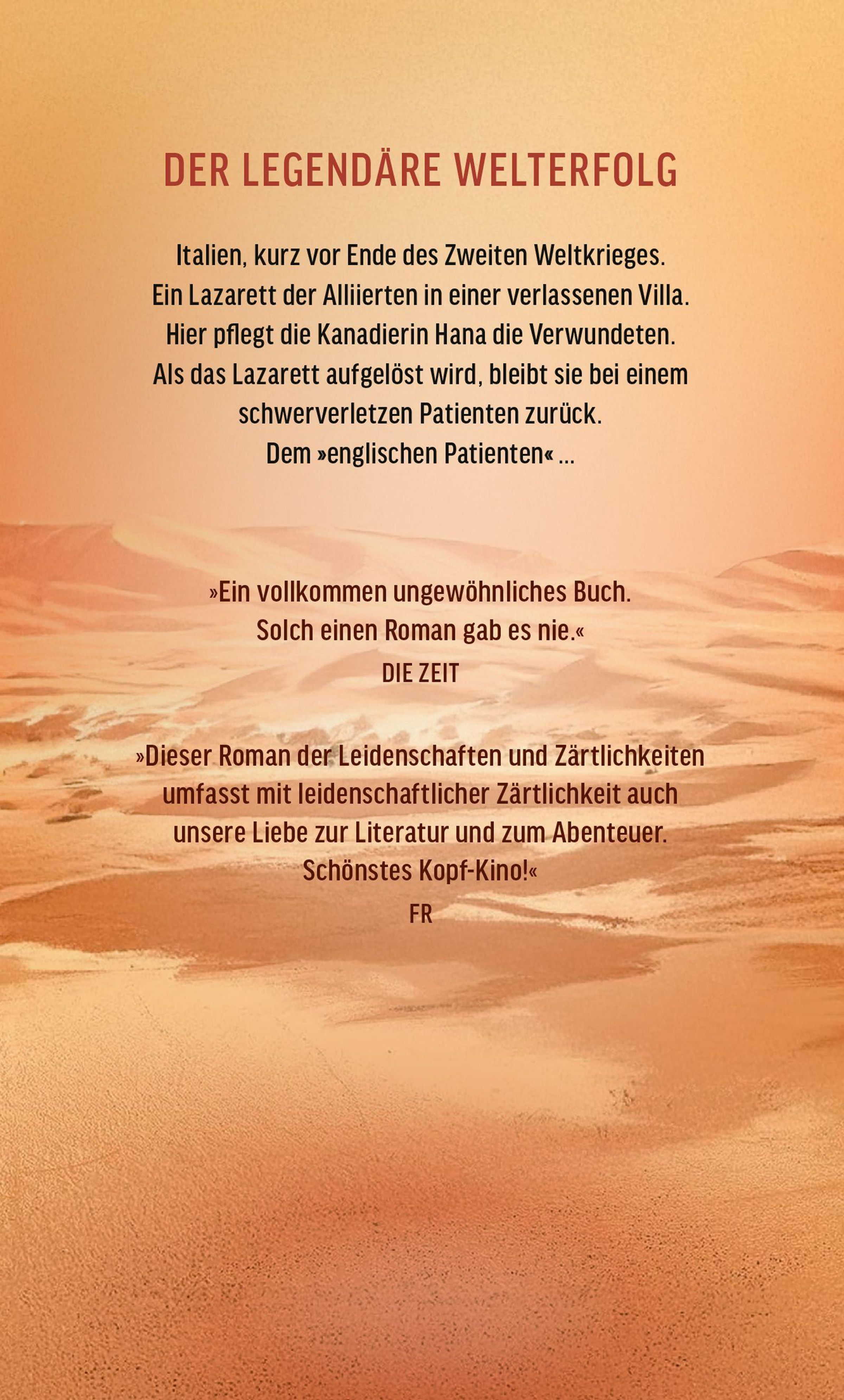 Der Krieg ist weitergezogen. In einer verlassenen Villa in Florenz sind vier Menschen gestrandet, die Zug um Zug ihre Leidenschaften und Wünsche, ihre Geschichte und Existenz voreinander enthüllen. Ein atemberaubendes Spiel um Leben und Tod beginnt. Die Verfilmung des Romans, unter der Regie von Anthony Minghella, gewann bei der Oscarverleihung 1997 neun Academy Awards.