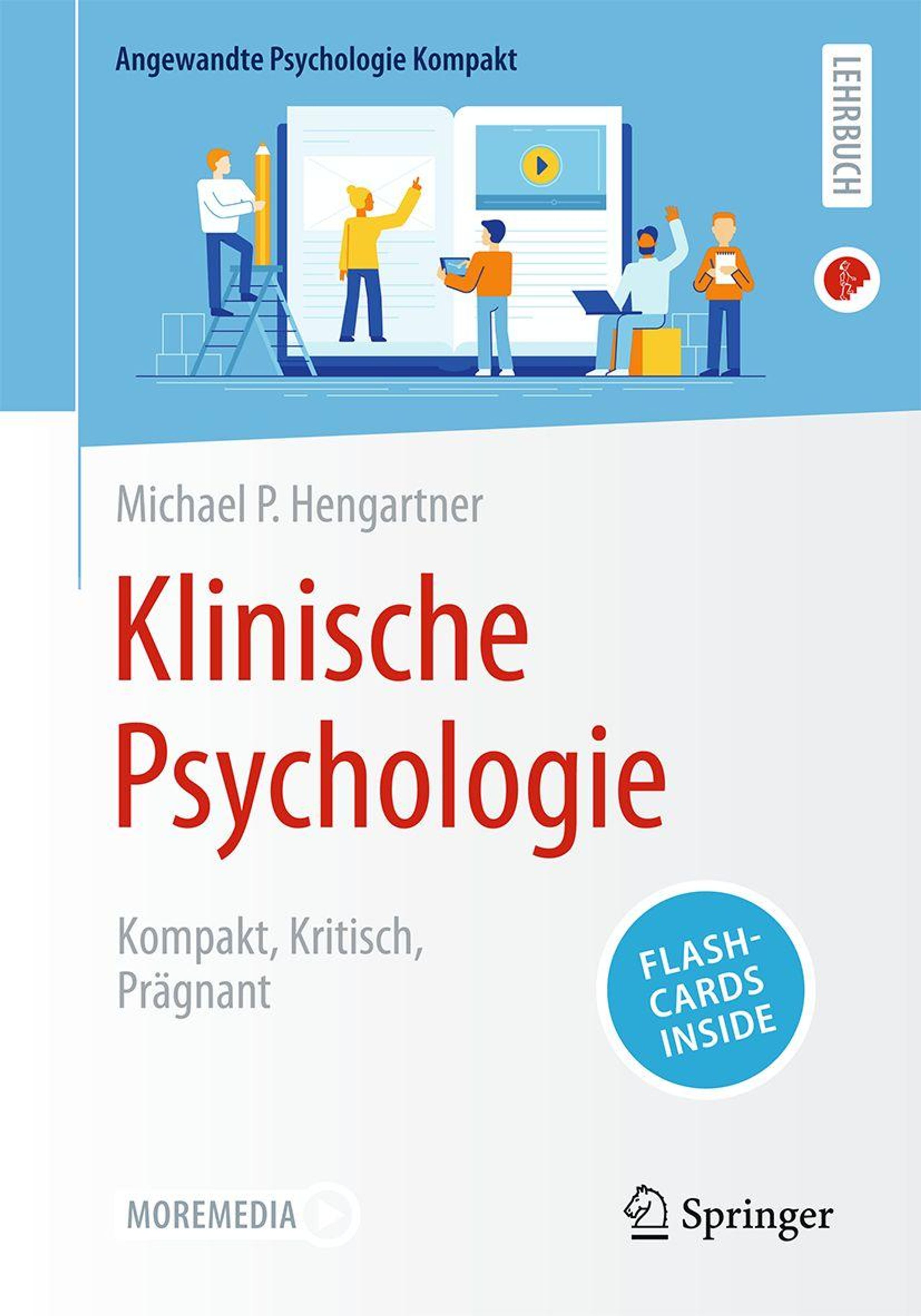 „Klinische Psychologie: Kompakt, Kritisch, Prägnant“ von Michael P. Hengartner, Illustration mit Figuren und großem Buch., Buch