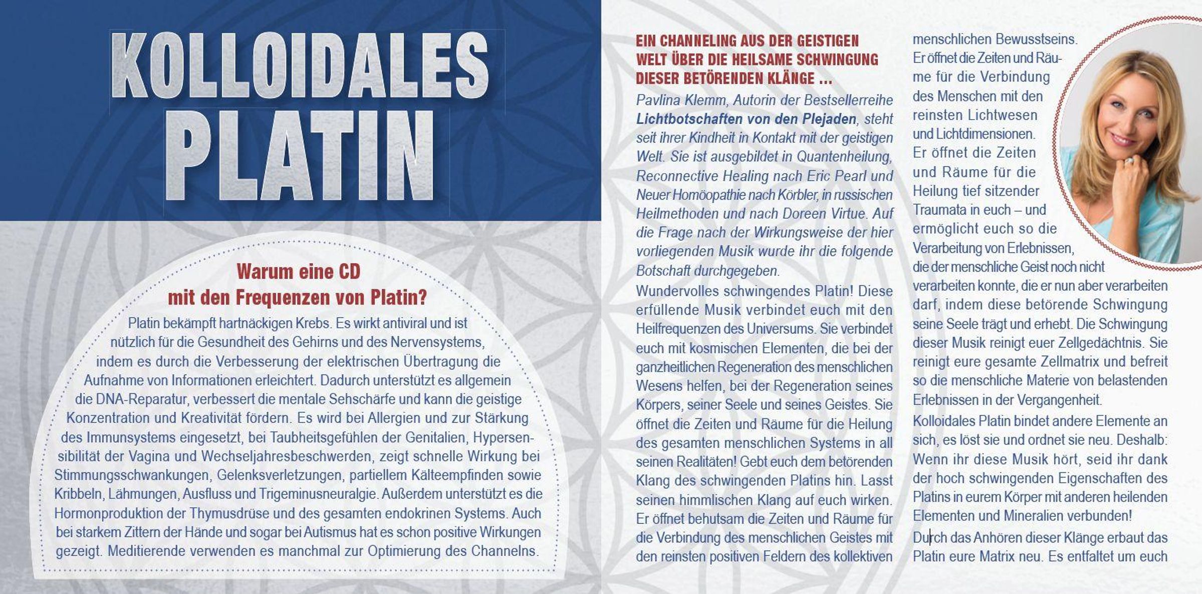 Im Booklet schreibt die Bestsellerautorin und Heilerin Pavlina Klemm über die Wirkungsweise dieser Musik, die auch zur besseren Anbindung beim Channeln verhilft, gibt eine Meditation und Anwendungen von Platin weiter. Die eingesetzten Klänge sind auch für Tiere sehr heilsam.