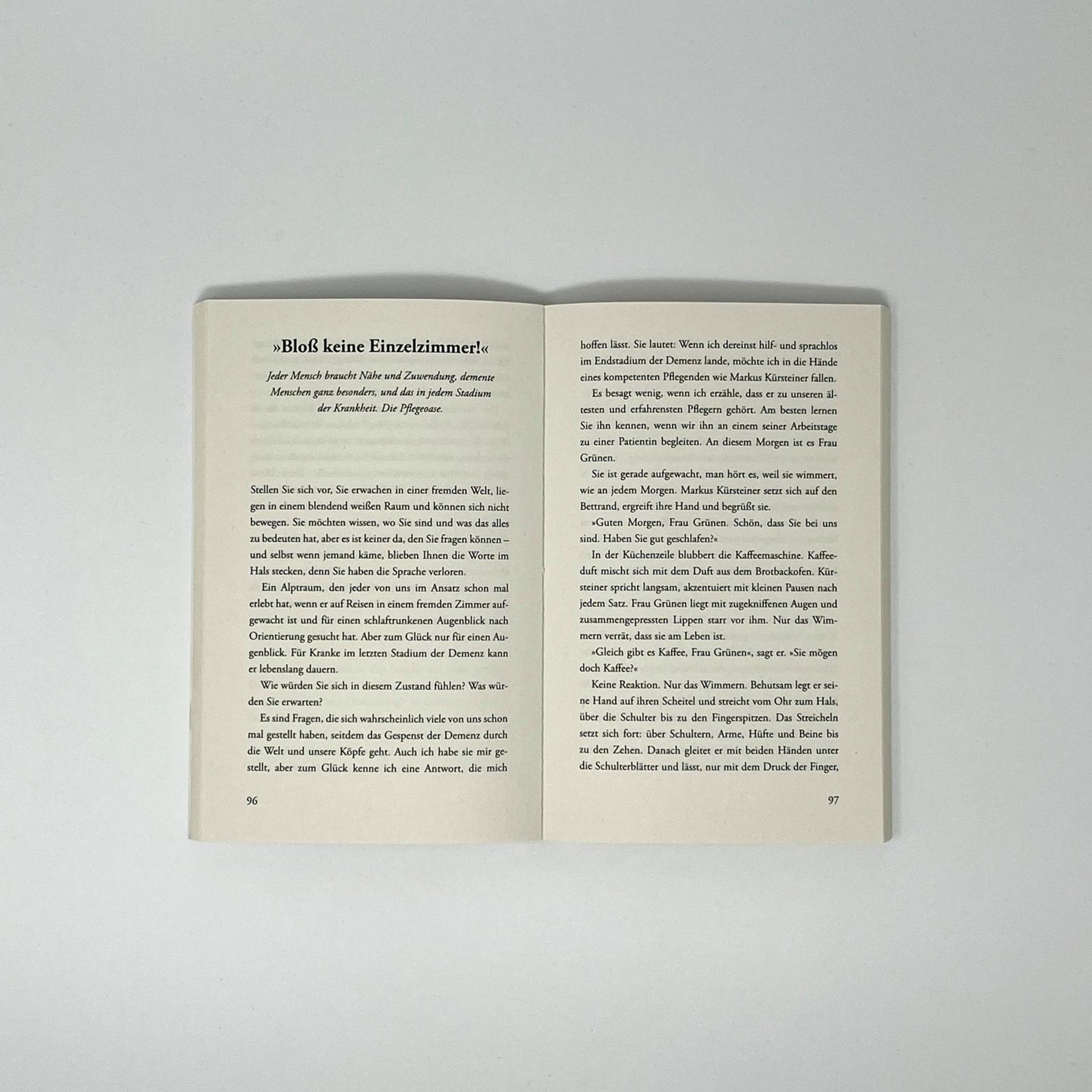 Die Würde der Demenzkranken ist unantastbar! Michael Schmieder leitet das Heim Sonnweid, das als eine der besten Pflegeeinrichtungen für Demenzkranke weltweit gilt. Sein erklärtes Ziel ist es, den Patienten ihre Würde wiederzugeben. Wenn wir die Kranken mit Medikamenten ruhig stellen, sie gar fixieren oder ihnen eine falsche Realität vorgaukeln, berauben wir sie ihrer Würde - selbst dann, wenn wir ihnen damit zu helfen glauben. Wenn wir sie hingegen ernst nehmen und auf ihre Ängste und Bedürfnisse eingehen, sehen wir sie als Menschen. Und darauf kommt es an. 'Der Pflegeheimleiter und Ethik-Experte Michael Schmieder kämpft gegen den verstörenden Trend, Demenzkranke in einer falschen Realität leben zu lassen.' Der Spiegel