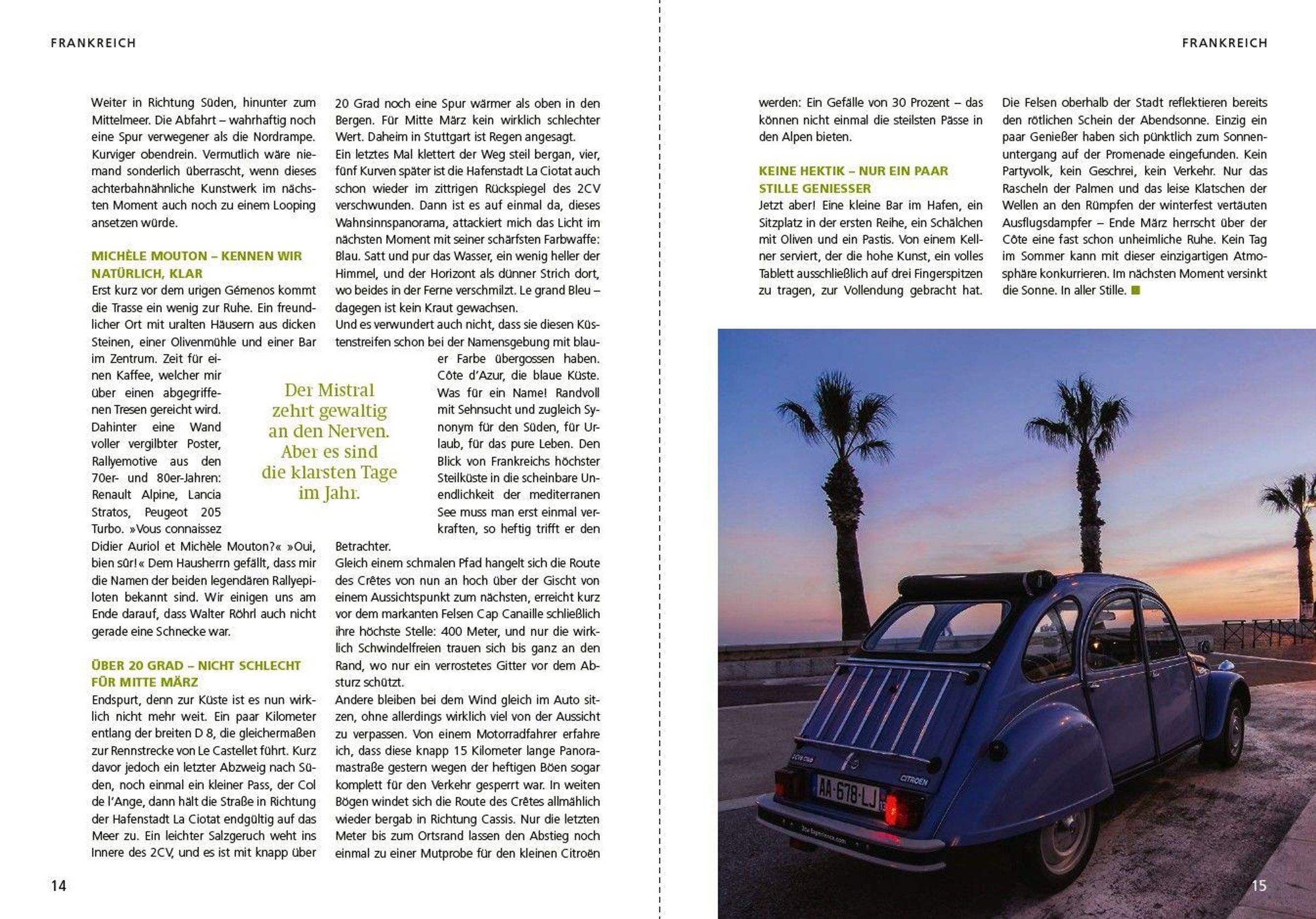 "Retro-Reisen. Rund ums Mittelmeer. Die schönsten Touren mit Old- und Youngtimern. Auto auf Küstenstraße, Mann sitzt nahe am Rand.", Buch