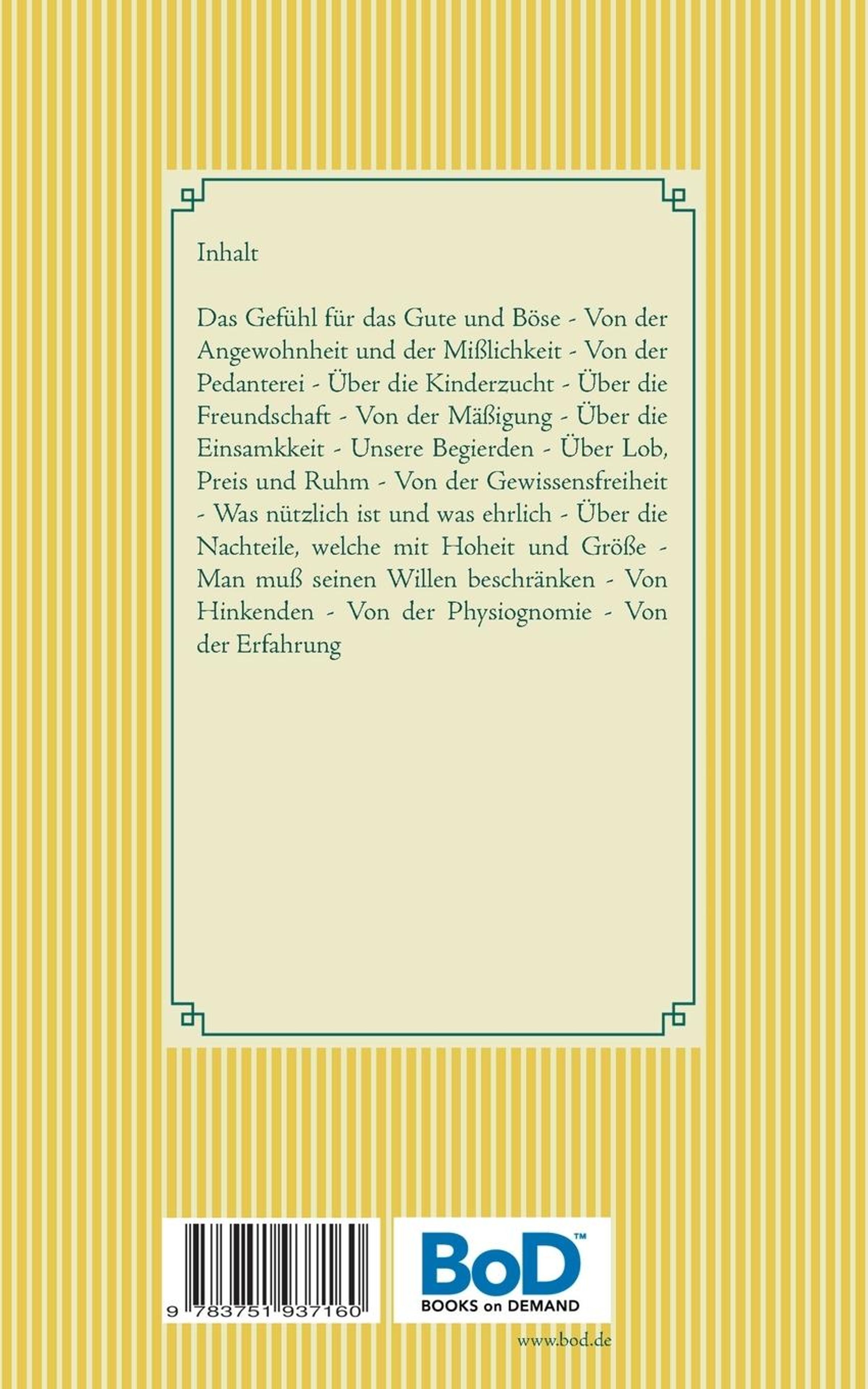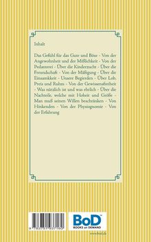 Das Gefühl für das Gute und Böse - Von der Angewohnheit und der Mißlichkeit - Von der Pedanterei - Über die Kinderzucht - Über die Freundschaft - Von der Mäßigung - Über die Einsamkkeit - Unsere Begierden - Über Lob, Preis und Ruhm - Von der Gewissensfreiheit - Was nützlich ist und was ehrlich - Über die Nachteile, welche mit Hoheit und Größe - Man muß seinen Willen beschränken - Von Hinkenden - Von der Physiognomie - Von der Erfahrung