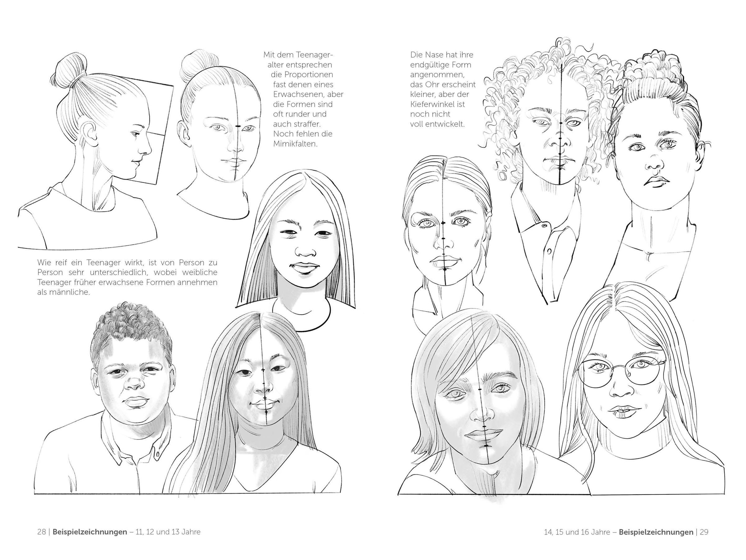Zeichenschule für realistische Gesichter: Unterschiede von Alter, Geschlecht und Körperbau werden anschaulich aufgezeigt. Kinderköpfe, jugendliche Gesichtszüge und alternde Gesichter verdeutlichen, wie sich Formen und Proportionen im Laufe des Lebens verändern.