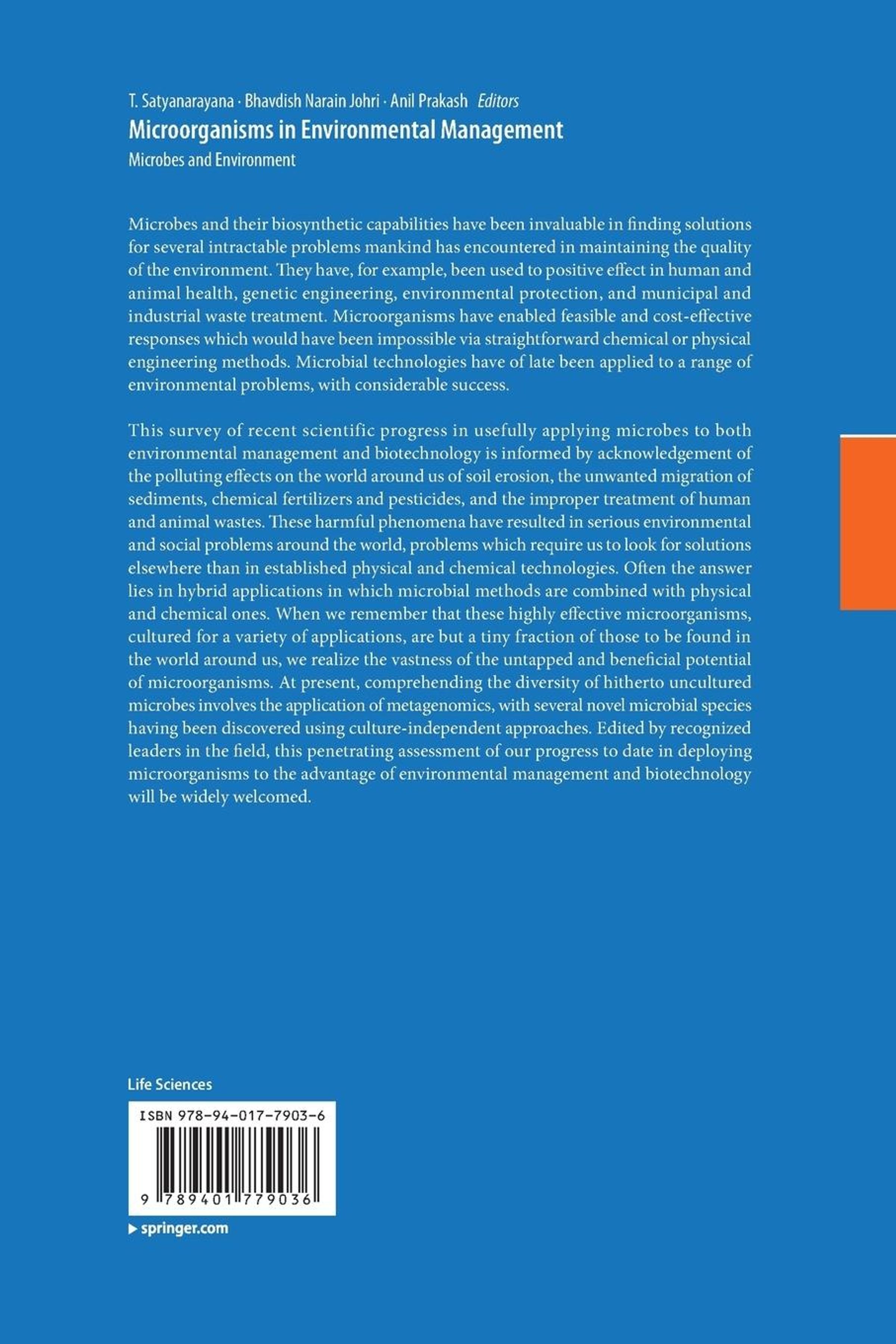 Microbes and their biosynthetic capabilities have been invaluable in finding solutions for several intractable problems mankind has encountered in maintaining the quality of the environment. They have, for example, been used to positive effect in human and animal health, genetic engineering, environmental protection, and municipal and industrial waste treatment. Microorganisms have enabled feasible and cost-effective responses which would have been impossible via straightforward chemical or physical engineering methods. Microbial technologies have of late been applied to a range of environmental problems, with considerable success. This survey of recent scientific progress in usefully applying microbes to both environmental management and biotechnology is informed by acknowledgement of the polluting effects on the world around us of soil erosion, the unwanted migration of sediments, chemical fertilizers and pesticides, and the improper treatment of human and animal wastes. These harmful phenomena have resulted in serious environmental and social problems around the world, problems which require us to look for solutions elsewhere than in established physical and chemical technologies. Often the answer lies in hybrid applications in which microbial methods are combined with physical and chemical ones. When we remember that these highly effective microorganisms, cultured for a variety of applications, are but a tiny fraction of those to be found in the world around us, we realize the vastness of the untapped and beneficial potential of microorganisms. At present, comprehending the diversity of hitherto uncultured microbes involves the application of metagenomics, with several novel microbial species having been discovered using culture-independent approaches. Edited by recognized leaders in the field, this penetrating assessment of our progress to date in deploying microorganisms to the advantage of environmental management andbiotechnology will be widely welcomed.