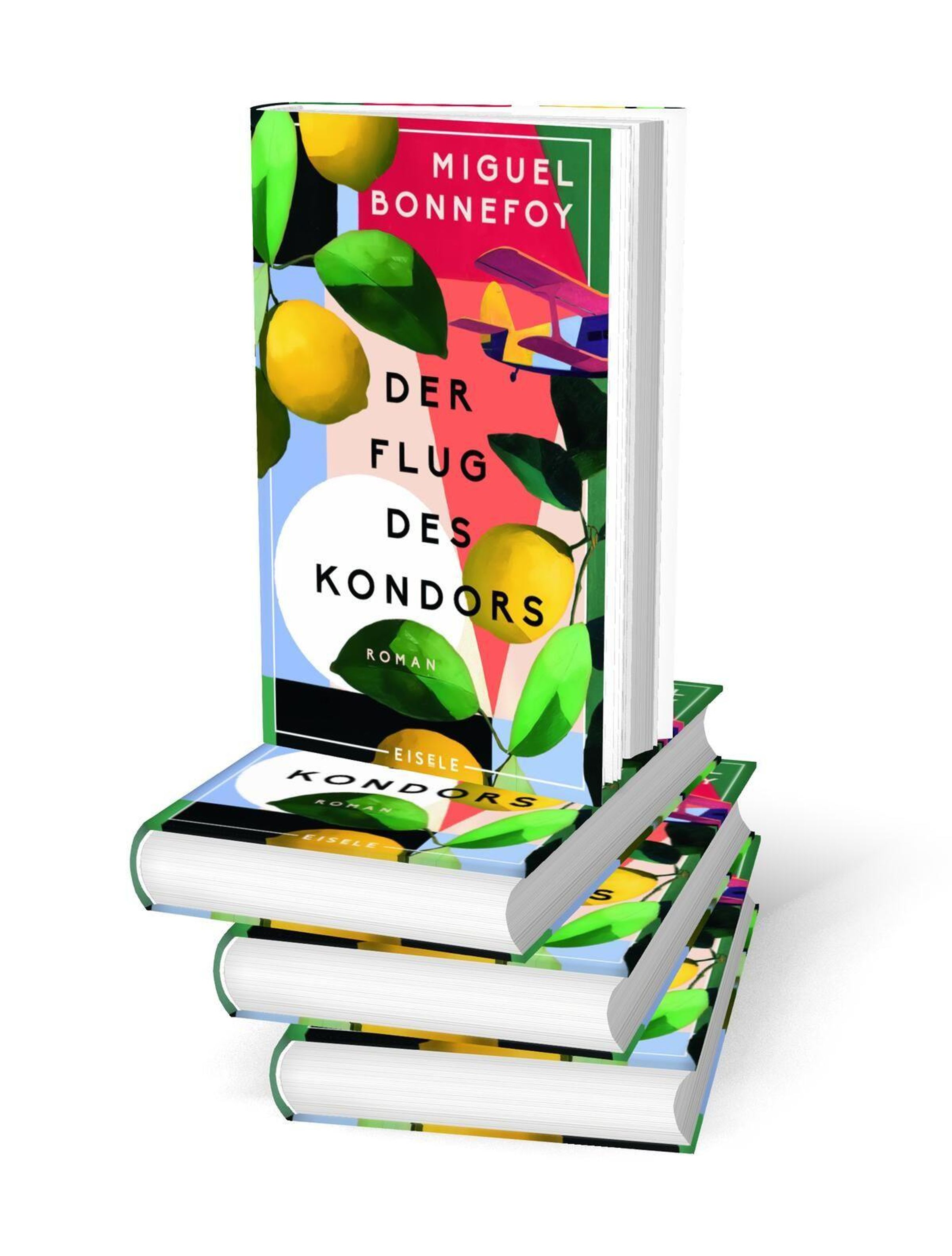 „Miguel Bonnefoy, Der Flug des Kondors, Roman, Eisele“ steht auf einer Illustration mit Zitronen und einem Flugzeug., Buch