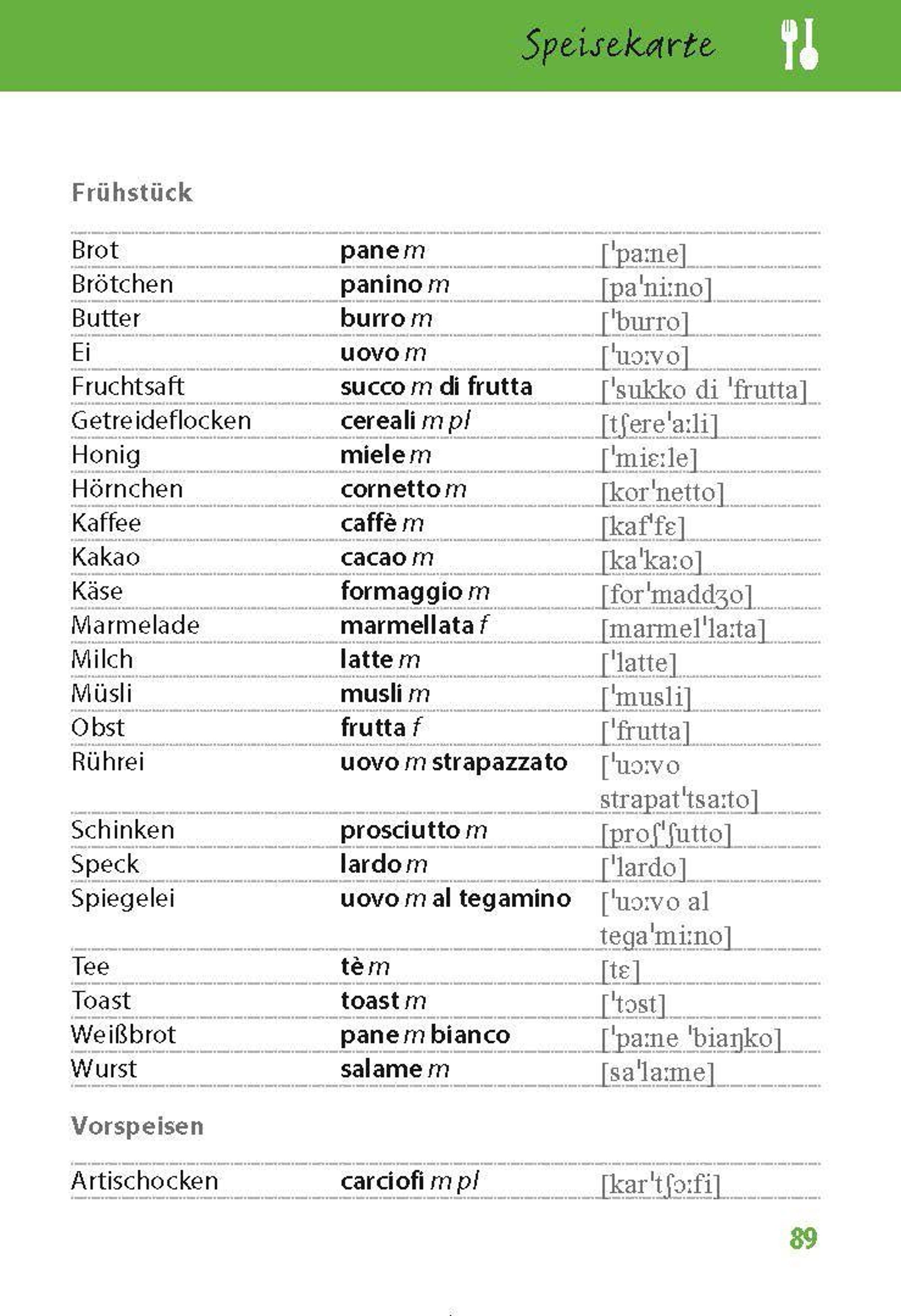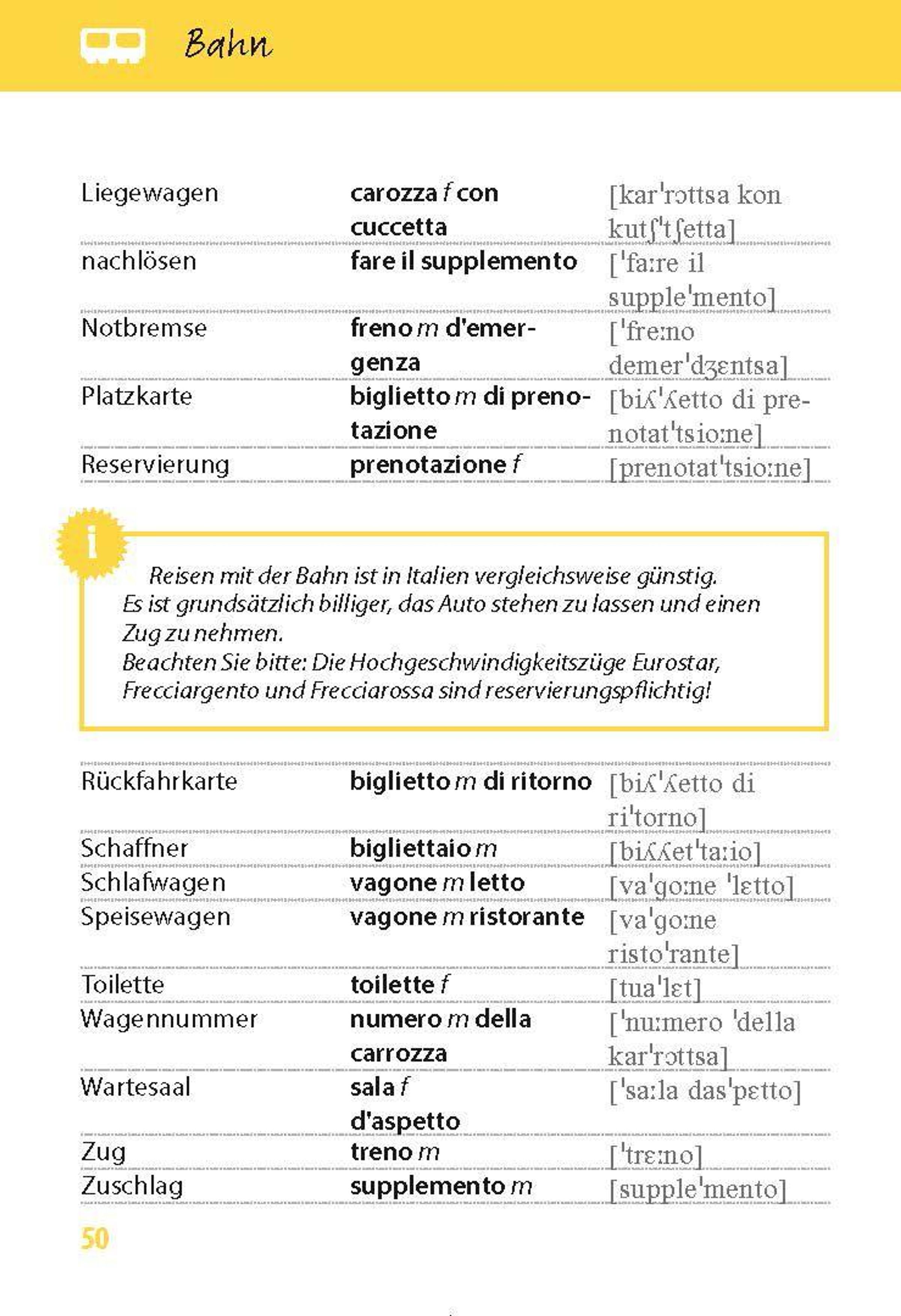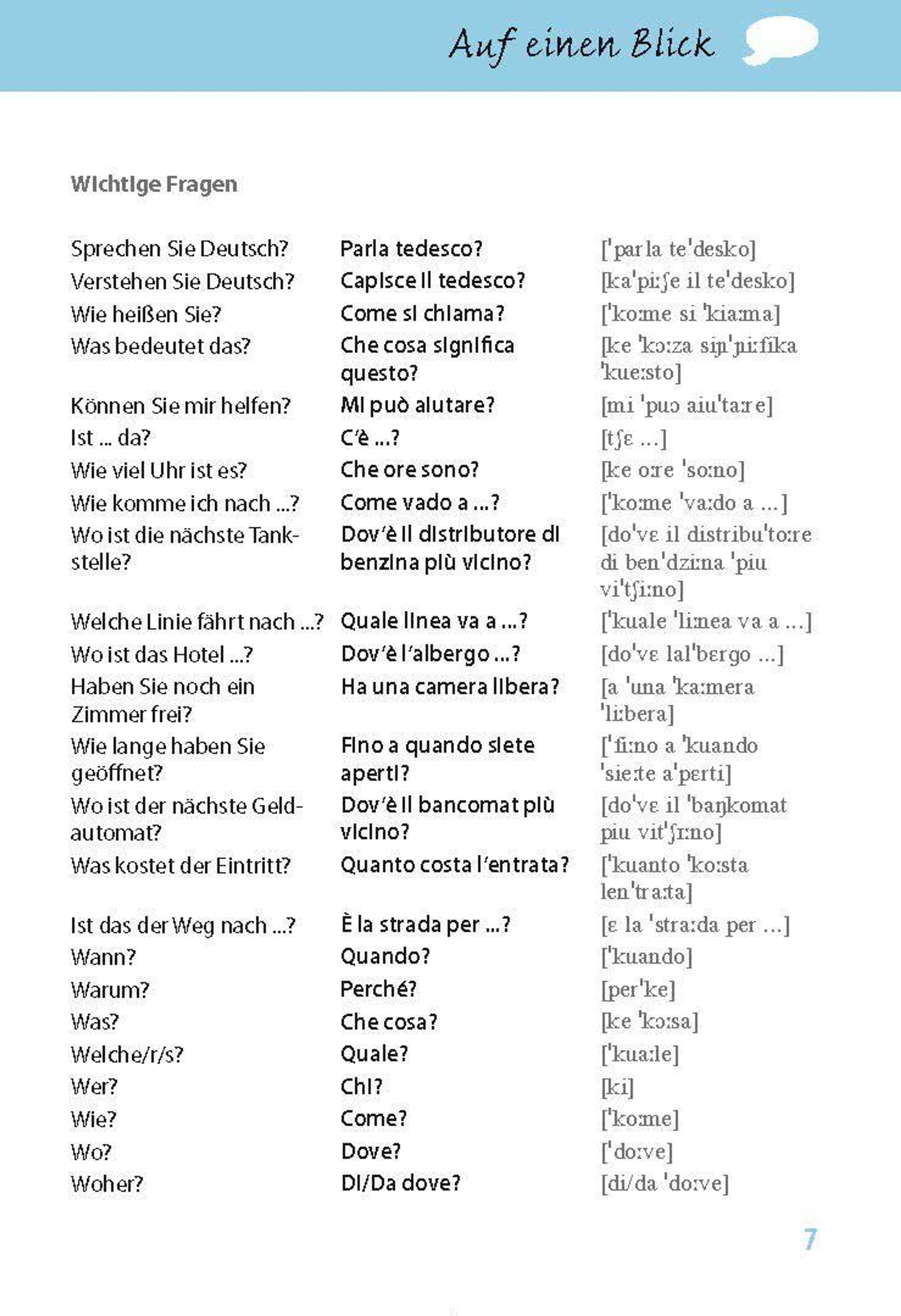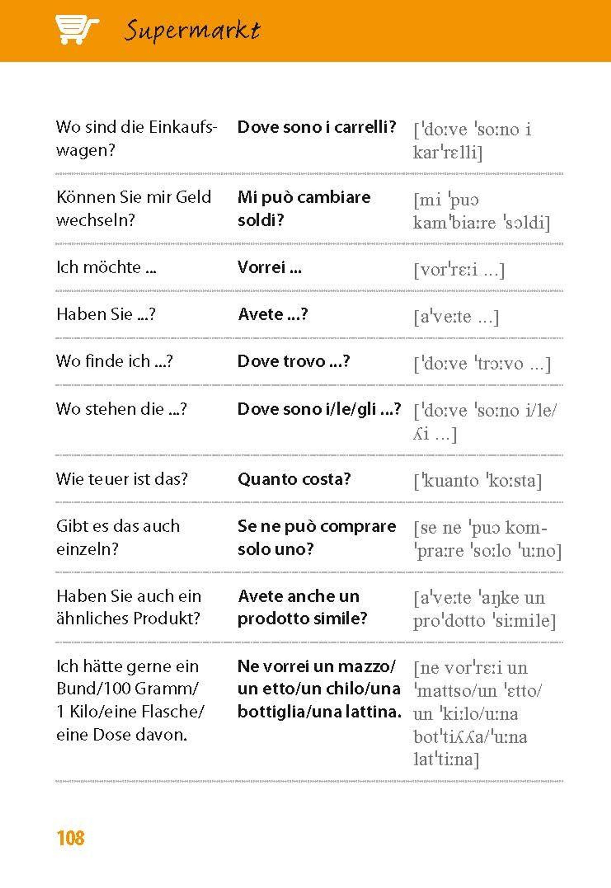 Der Sprachführer Italienisch ist der ideale Begleiter für Reise und Urlaub, denn er macht einfache Verständigung auch ohne Italienischkenntnisse möglich. Klar gegliedert nach Situationen bietet er praktische Hilfe mit den wichtigsten Wörtern, Sätzen und Wendungen. Zahlreiche Infokästen mit landeskundlichen Tipps helfen, sich in jeder Lage schnell zurechtzufinden. Die am häufigsten gebrauchten Wörter, Sätze und Redewendungen, klare Gliederung nach Reisesituationen. Alle Einträge mit internationaler Lautschrift. 16 Zeigeseiten mit Fotos zu den Themen Essen & Trinken, Geschirr & Besteck, menschlicher Körper, Kleidung, Tiere, Fortbewegungsmittel. Mit Reisewörterbuch Italienisch zum schnellen Nachschlagen. Übersichtliches Layout mit vielen Fotos und praktisches Format für die Jackentasche.