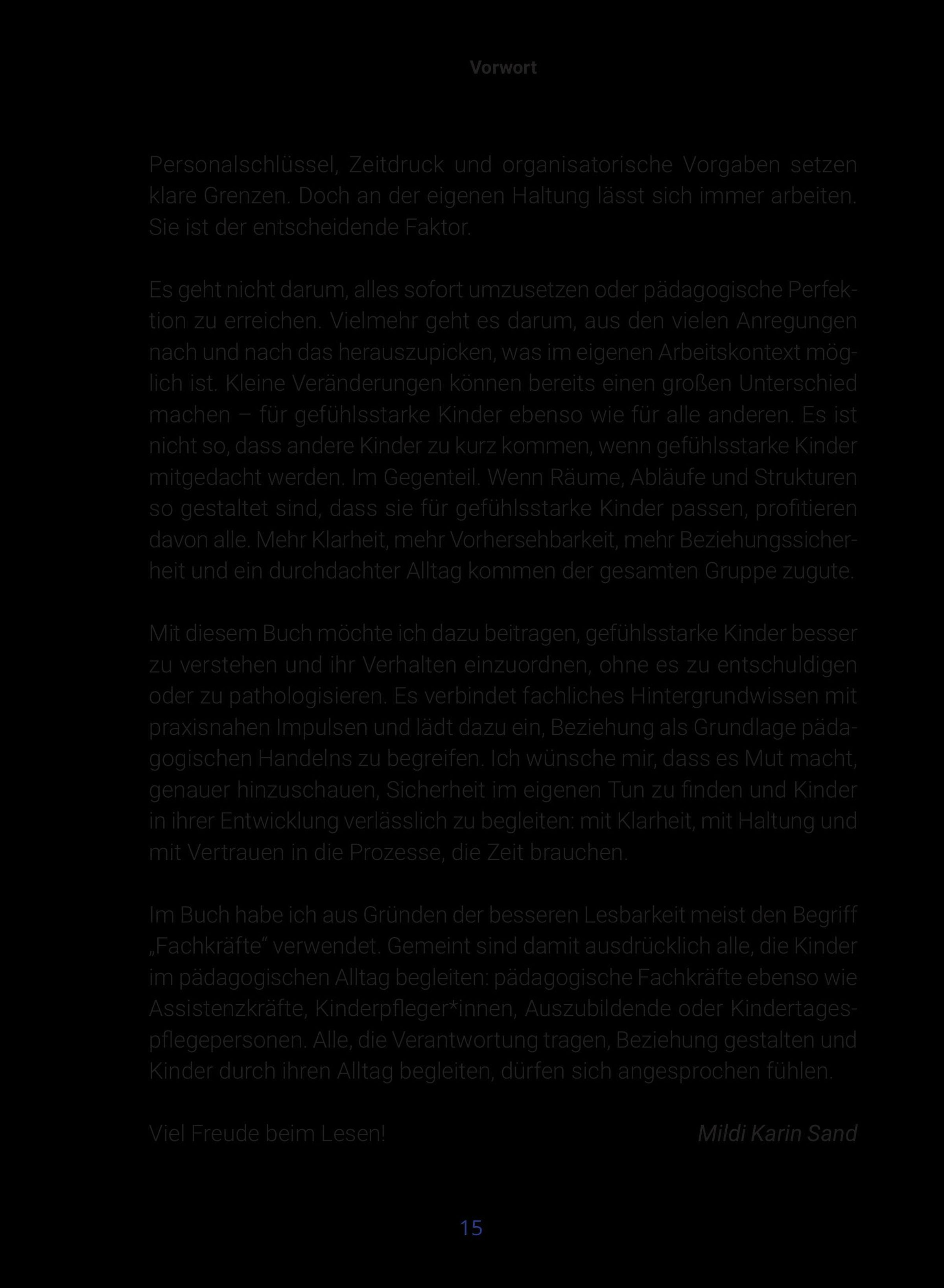 Familienberaterin und Kita-Referentin Mildi Karin Sand verbindet in diesem Buch fundiertes Fachwissen über Neurobiologie, Selbstregulation und Temperament mit praxisnahen Impulsen für den pädagogischen Alltag. Entstanden aus jahrelanger Erfahrung in der Begleitung gefühlsstarker Kinder und aus vielen fachlichen Beratungen mit Eltern und Fachkräften, bietet das Buch konkrete Ansätze für die Fachkräfte, um diese Kinder besser zu verstehen - ohne ihr Verhalten zu pathologisieren oder zu entschuldigen.
