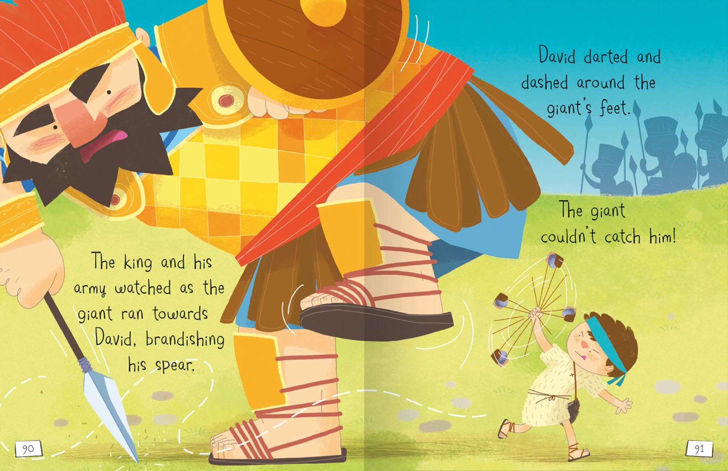 - David and Goliath is about a giant Goliath who challenges any Israelite to fight him. A shepherd called David manages to defeat him with just a few stones.