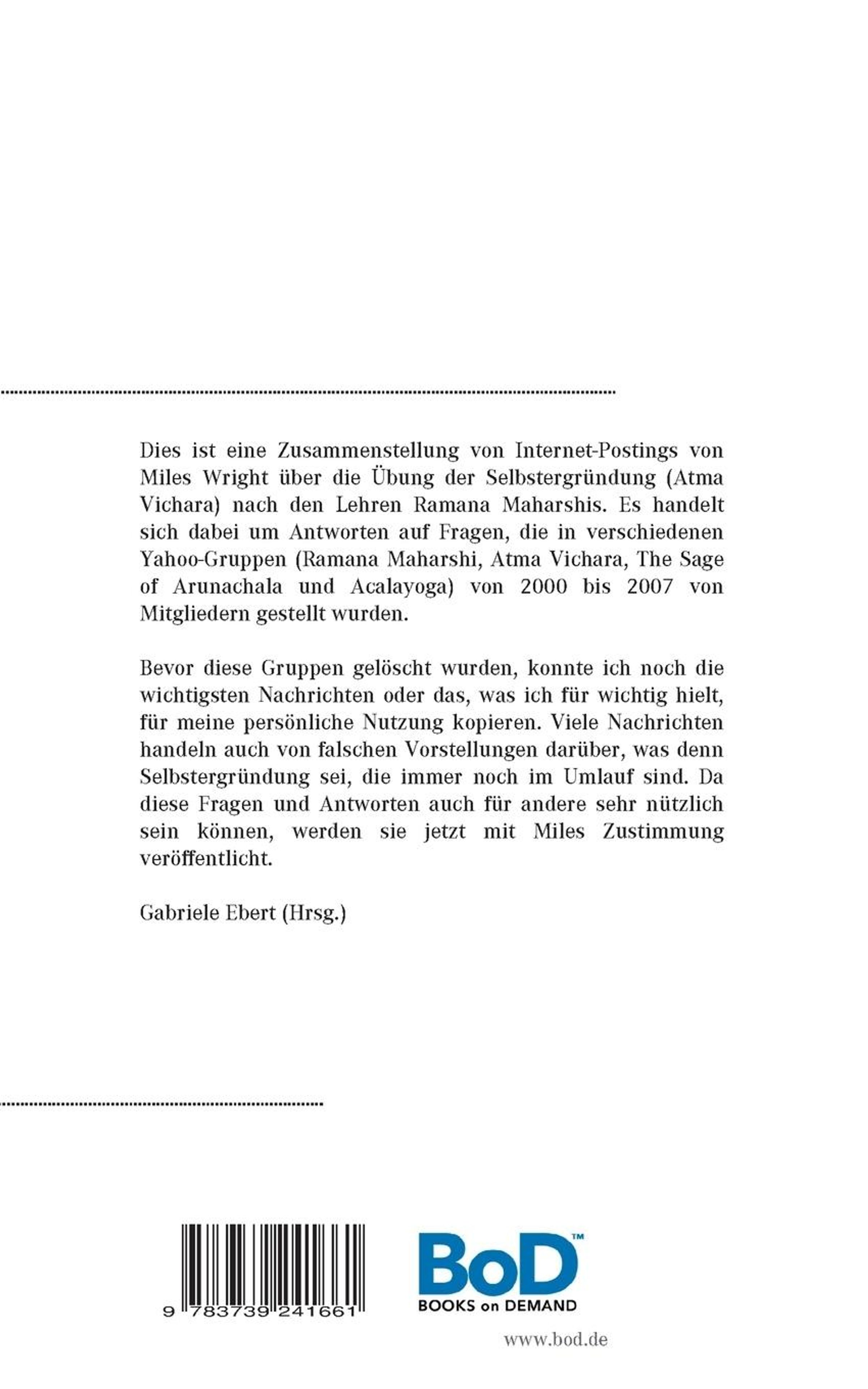 Dies ist eine Zusammenstellung von Internet-Postings von Miles Wright über die Übung der Selbstergründung (Atma Vichara) nach den Lehren Ramana Maharshis. Es handelt sich dabei um Antworten auf Fragen, die in verschiedenen Yahoo-Gruppen (Ramana Maharshi, Atma Vichara, The Sage of Arunachala und Acalayoga) von 2000 bis 2007 von Mitgliedern gestellt wurden. Bevor diese Gruppen gelöscht wurden, konnte ich noch die wichtigsten Nachrichten oder das, was ich für wichtig hielt, für meine persönliche Nutzung kopieren. Viele Nachrichten handeln auch von falschen Vorstellungen darüber, was denn Selbstergründung sei, die immer noch im Umlauf sind. Da diese Fragen und Antworten auch für andere sehr nützlich sein können, werden sie jetzt mit Miles Zustimmung veröffentlicht. Gabriele Ebert (Hrsg.)