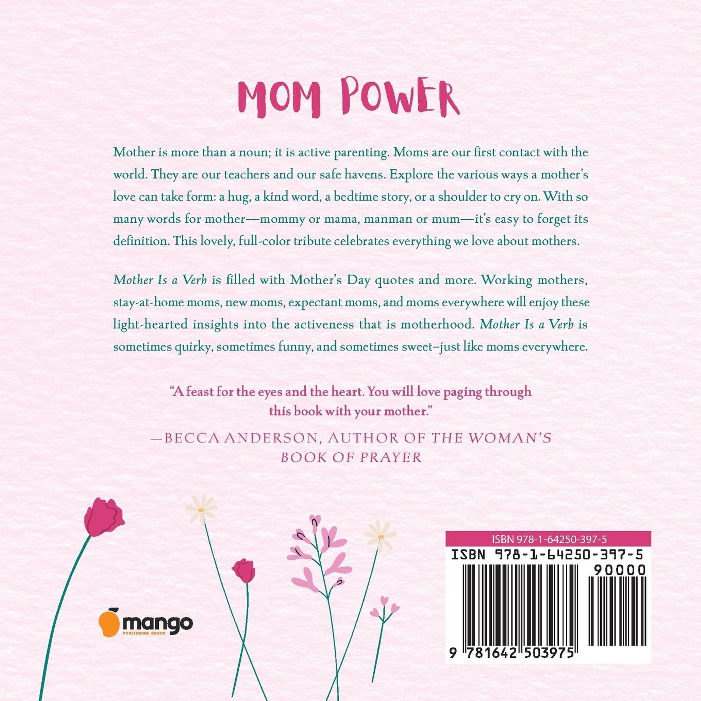 Inspirational quotes on every page. Mother Is a Verbcontains inspirational mom quotes that mothers look toward to remind them to take time to celebrate themselves. These light-hearted insights impart an important reminder that even as mothers, self-care and honoring oneself is vital in the journey of motherhood.