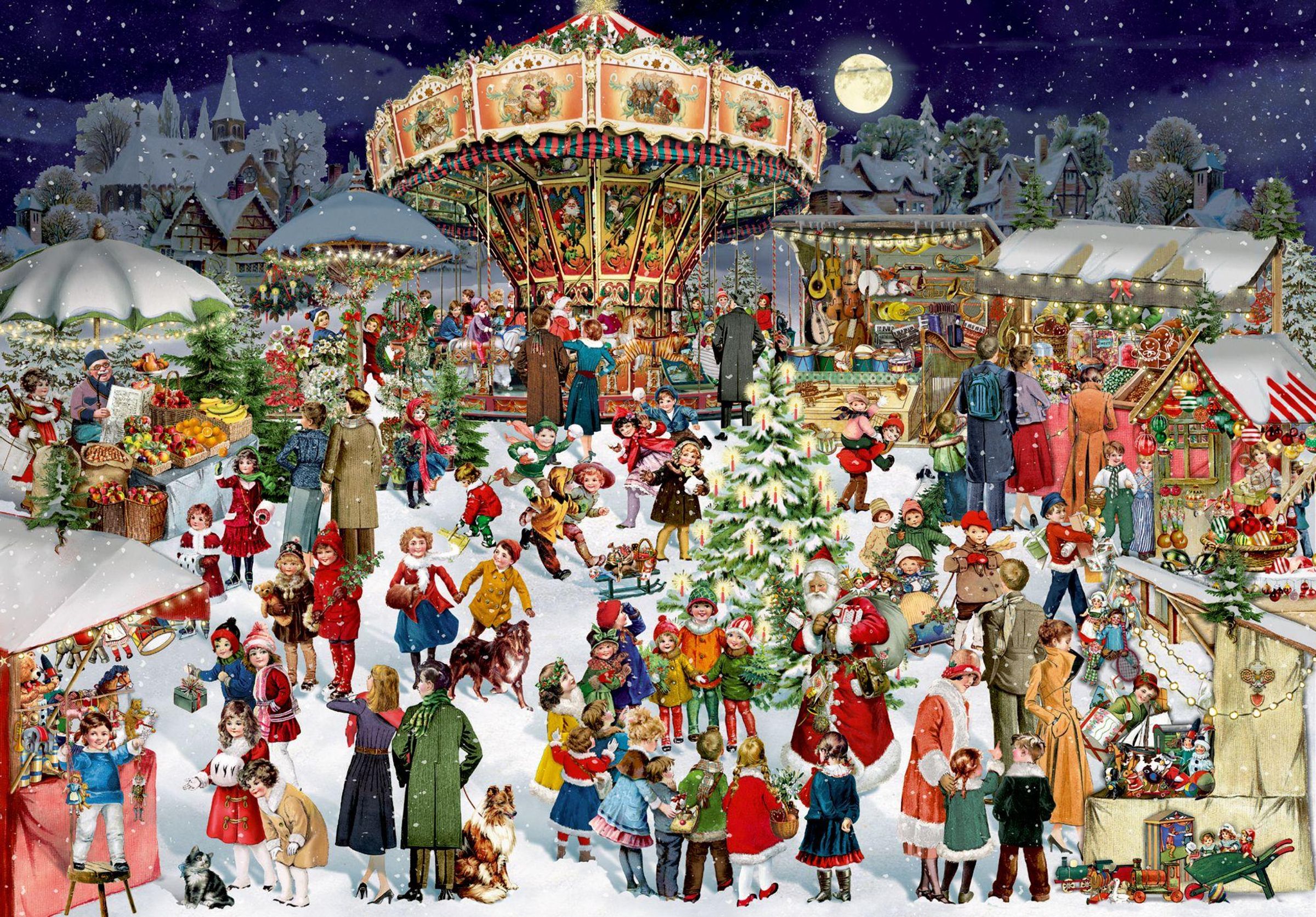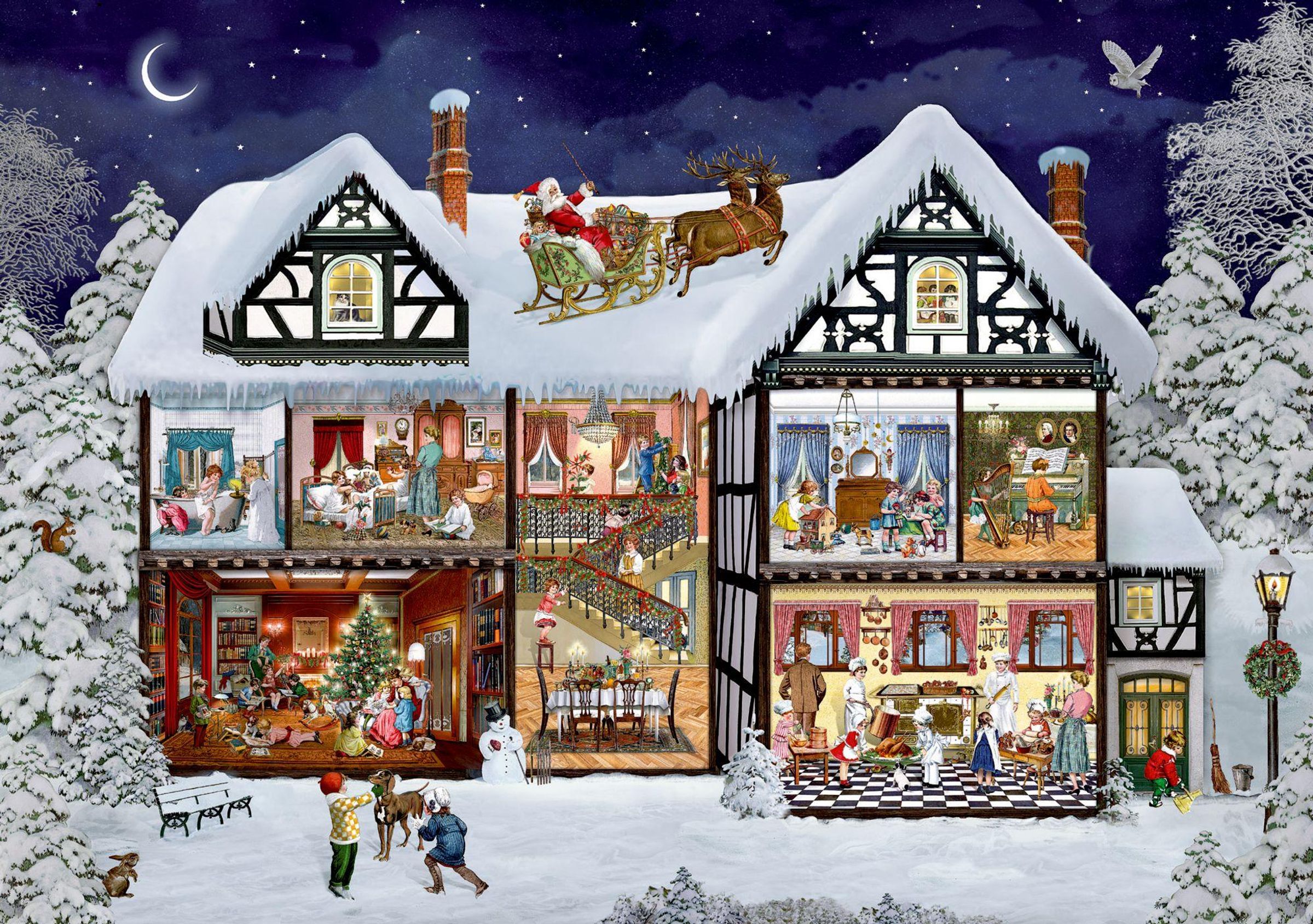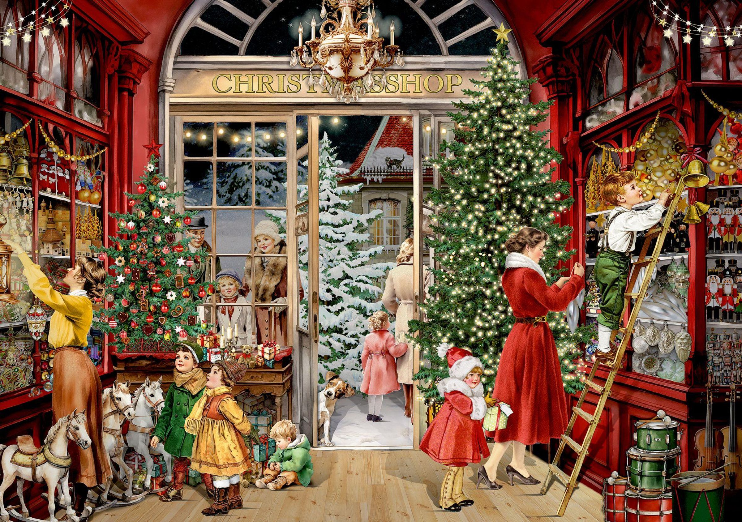 Nostalgische Mini-Adventskalender-Karten · Mini-Adventskalender-Karte im nostalgischen Design mit Glitter und Goldfolie veredelt · Vier Motive im Format von jeweils ca. 16, 5 × 11, 5 cm , mit 24 Türchen und Kuvert · Vier stimmungsvolle Szenen: Weihnachtsladen, behagliches Haus, Kaminzimmer, verschneiter Markt · Ideal zum Verschenken oder Versenden mit Platz für persönliche Grüße