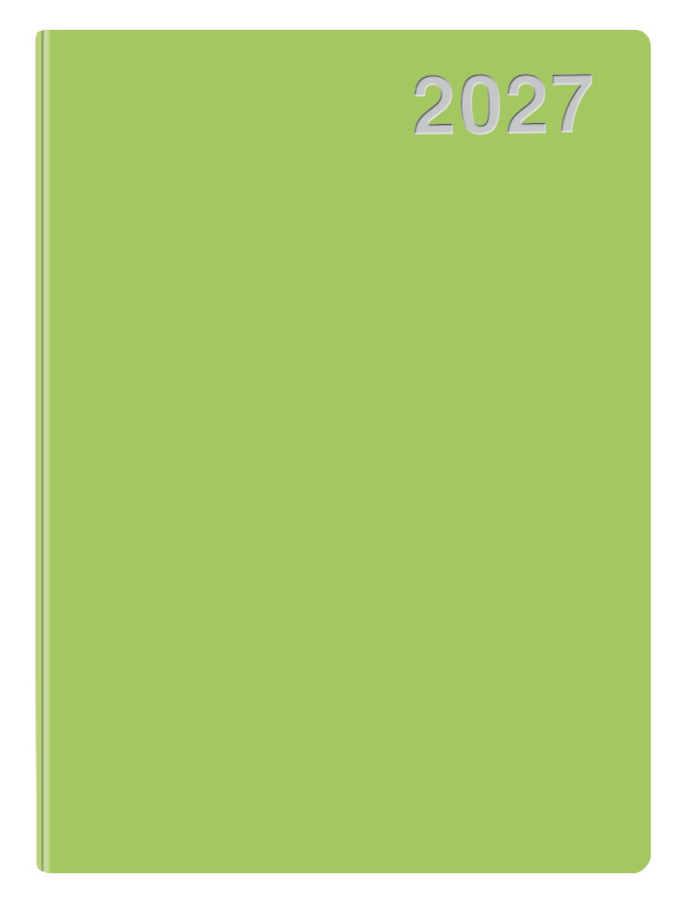 Kompakter Taschenkalender mit grünem Papiereinband. 168 Seiten, 2 Seiten pro Woche. Kalendarium: d-e-f-i.