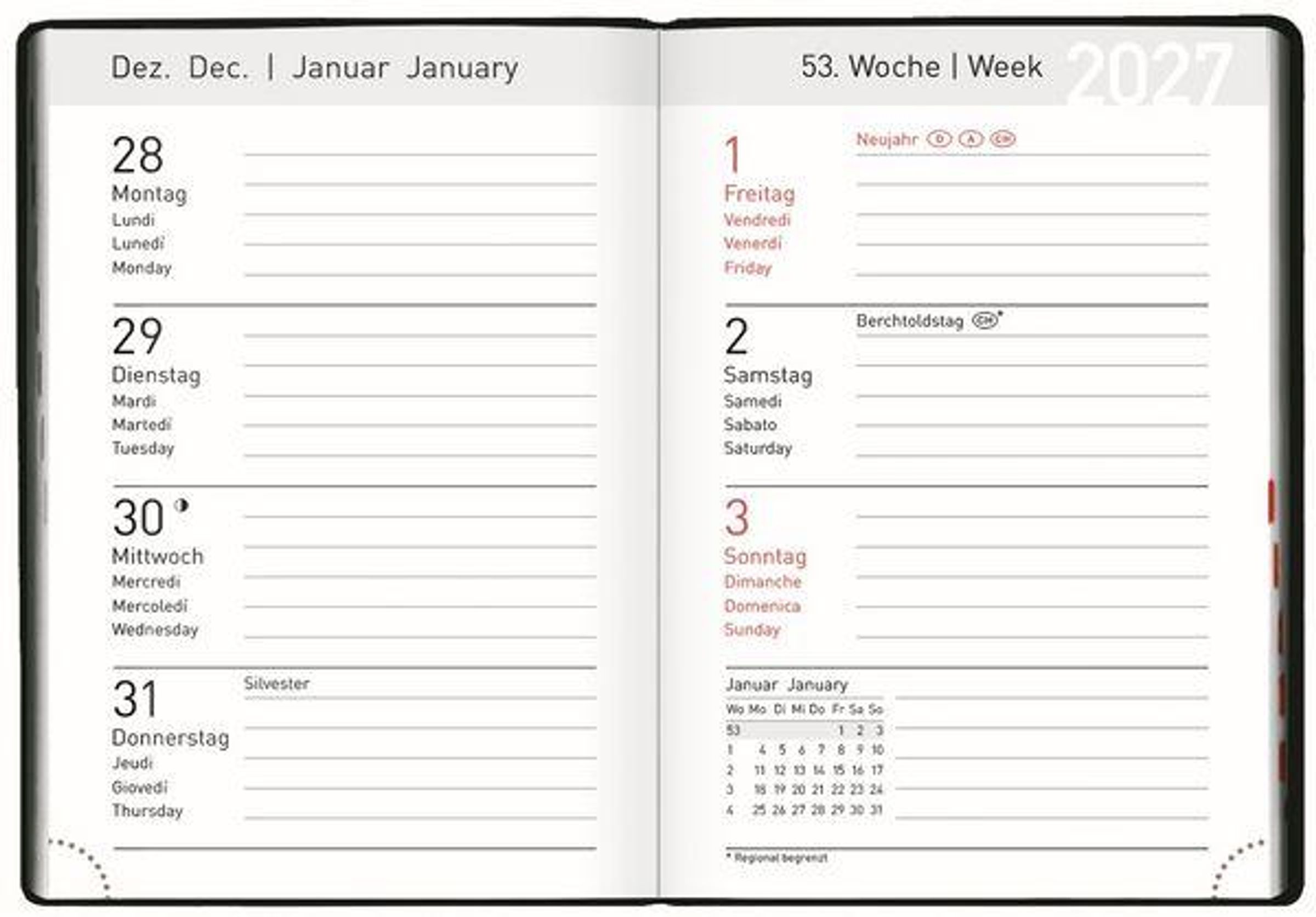 - Kalendarium auf Deutsch, Englisch, Französisch und Italienisch; Feiertage für Deutschland, Österreich und Schweiz