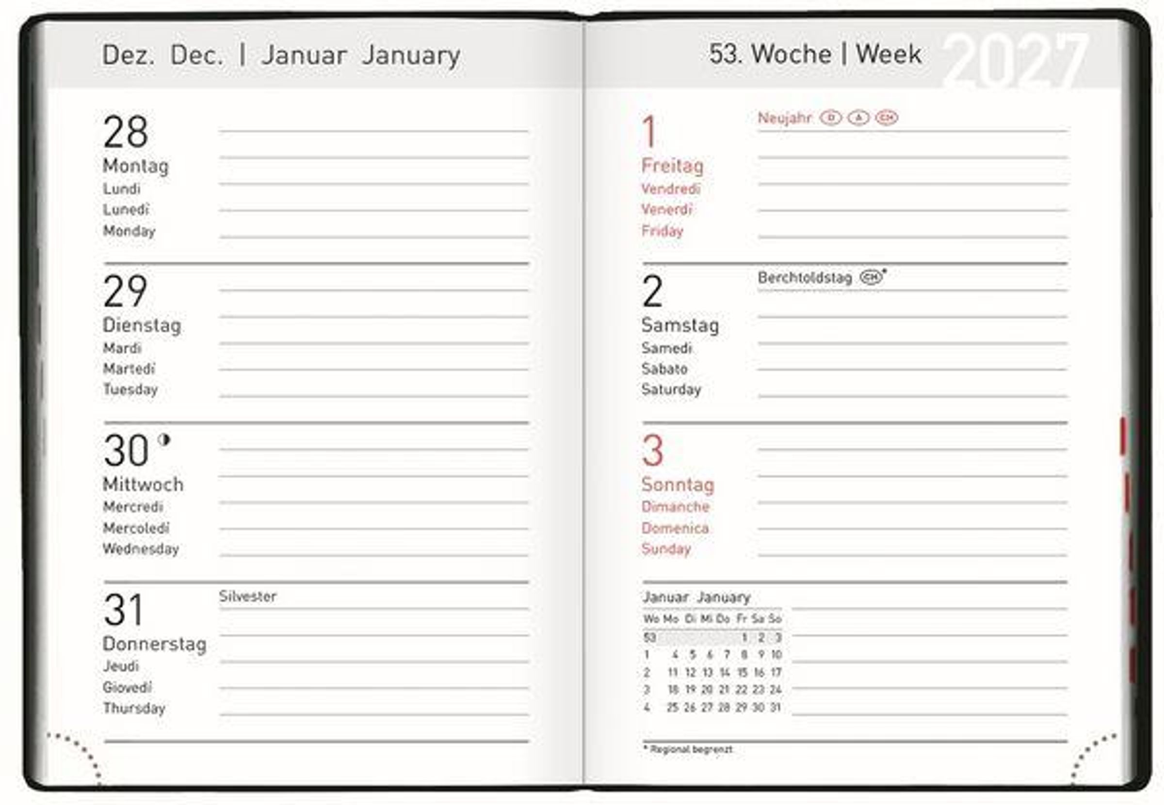 Kompakter Taschenkalender mit schwarzem Einband aus PVC. 168 Seiten, 2 Seiten pro Woche. Kalendarium d-e-f-i.