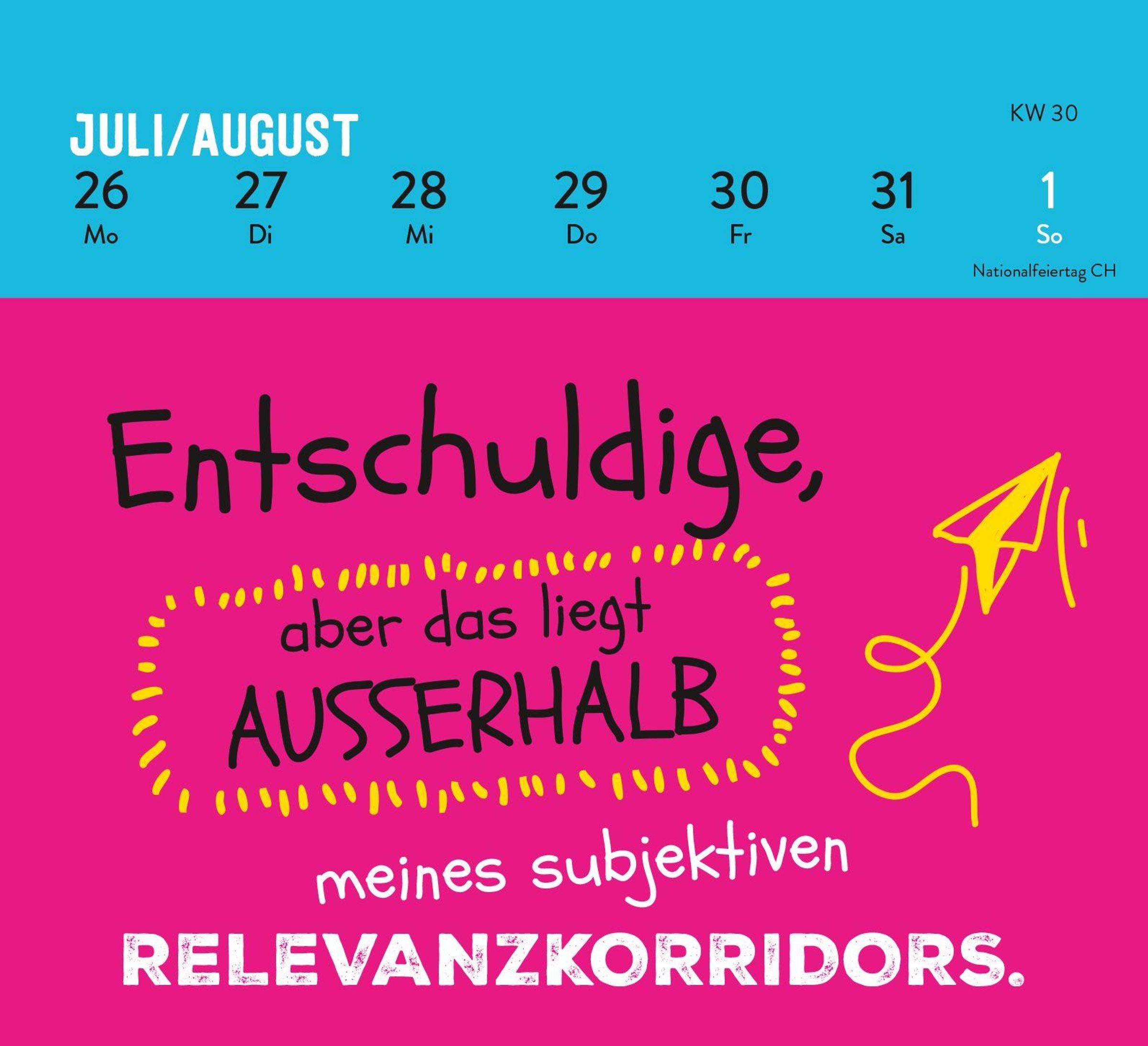 Ob Homeoffice oder Büroschreibtisch - der kleine Wochenkalender ist ein echter Hingucker. Jede Woche begeistert er mit einem fiesen Spruch in knallig bunter Gestaltung. Auf den Rückseiten der Kalenderblätter ist außerdem Platz für Notizen, Geburtstage und kleine Botschaften.