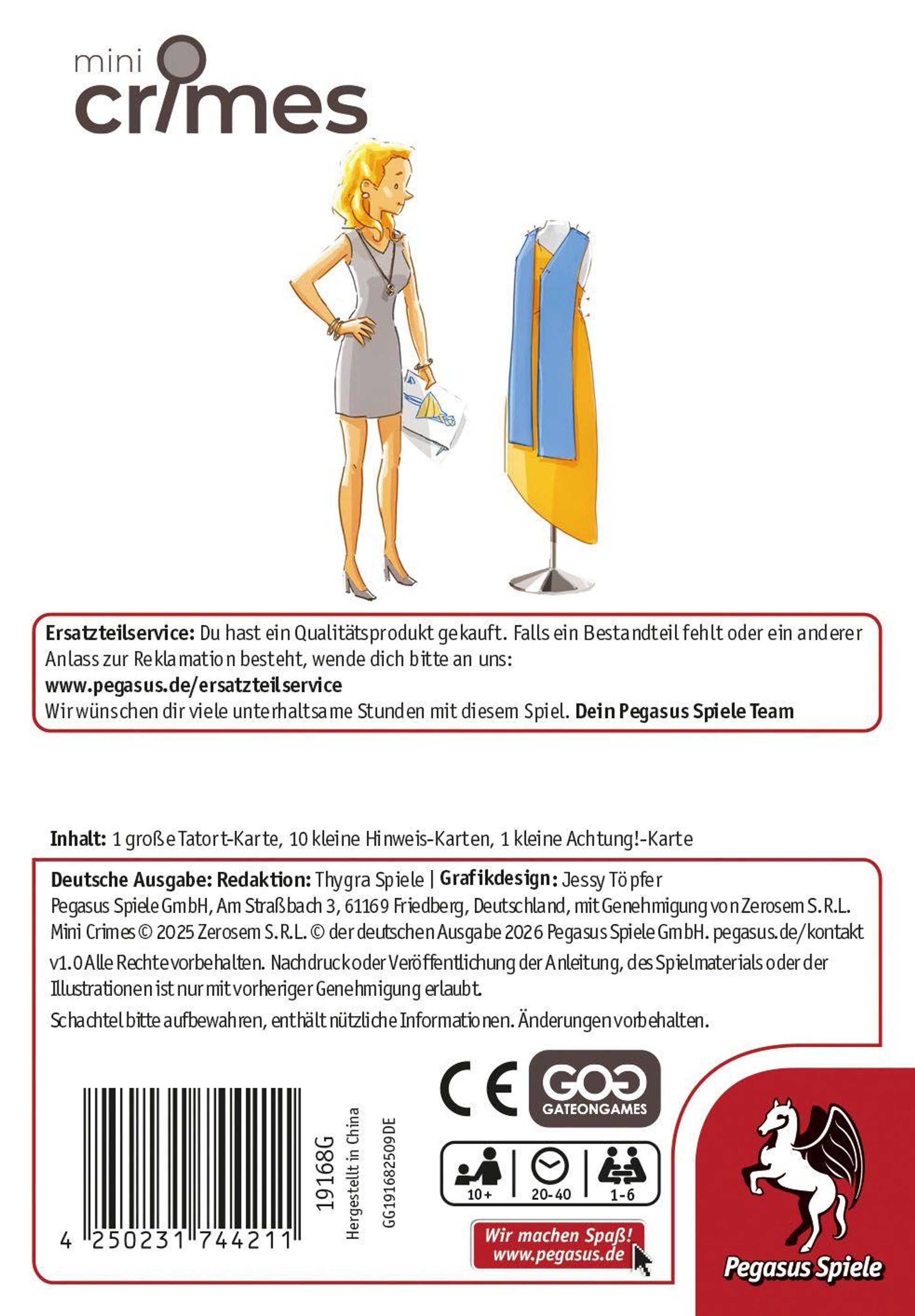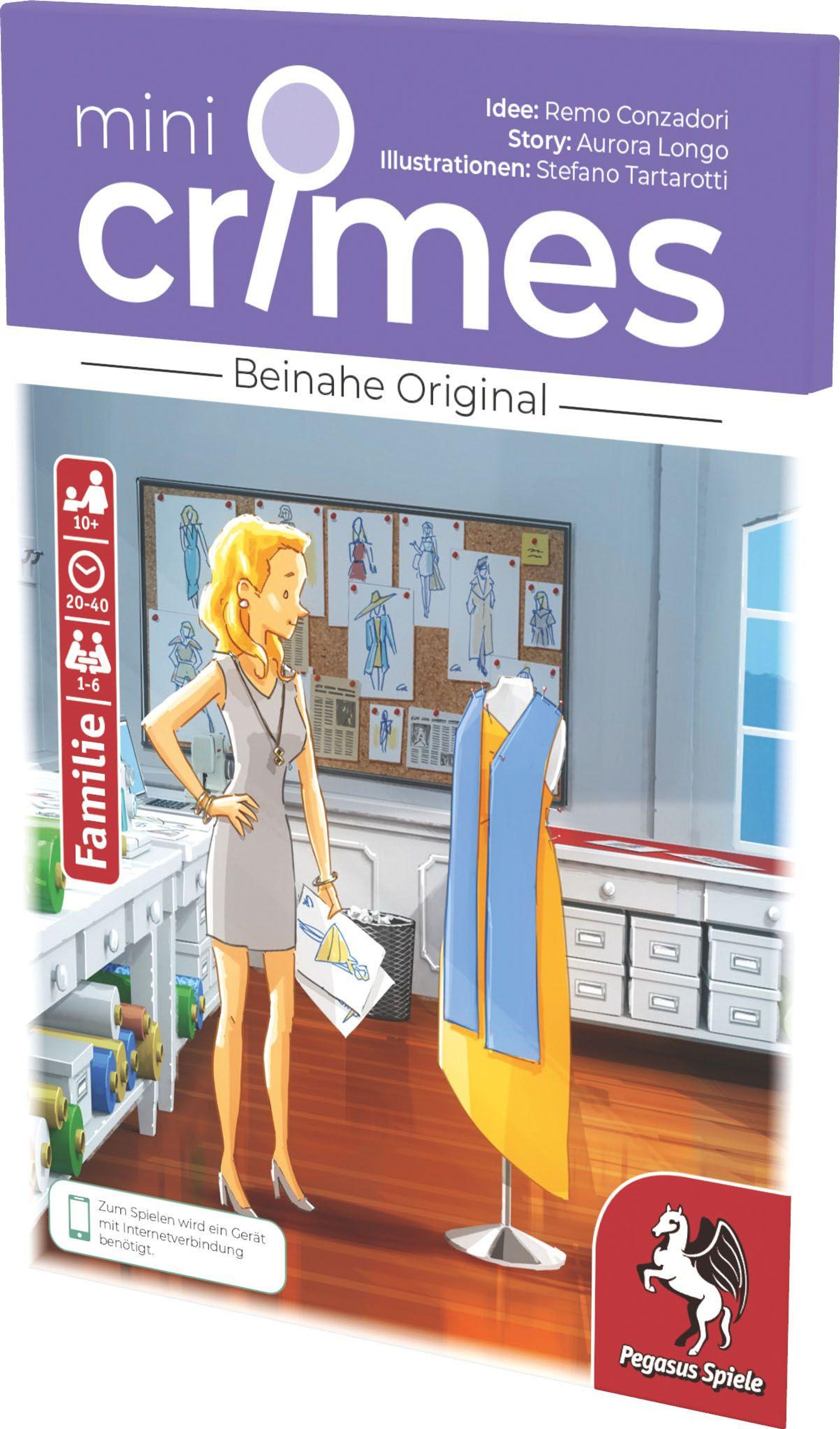 Die MiniCrimes Fälle sind kooperative Krimispiele, in denen die Spielenden ihre Beobachtungsgabe und ihre detektivischen Fähigkeiten unter Beweis stellen müssen, um einen mysteriösen Fall zu lösen. Sie untersuchen dabei den Tatort und bis zu 10 Hinweise, die sie mit Bedacht auswählen müssen, um das Geheimnis zu lüften! In MiniCrimes - Beinahe Original wurde Camille Roux, eine junge und aufstrebende Modedesignerin, kurz vor ihrem Debüt auf der Fashion Week tot in ihrem Atelier in Mailand aufgefunden. Die Modewelt trauert um ihren gefallenen Stern, doch wer hat ihr Licht ausgelöscht?