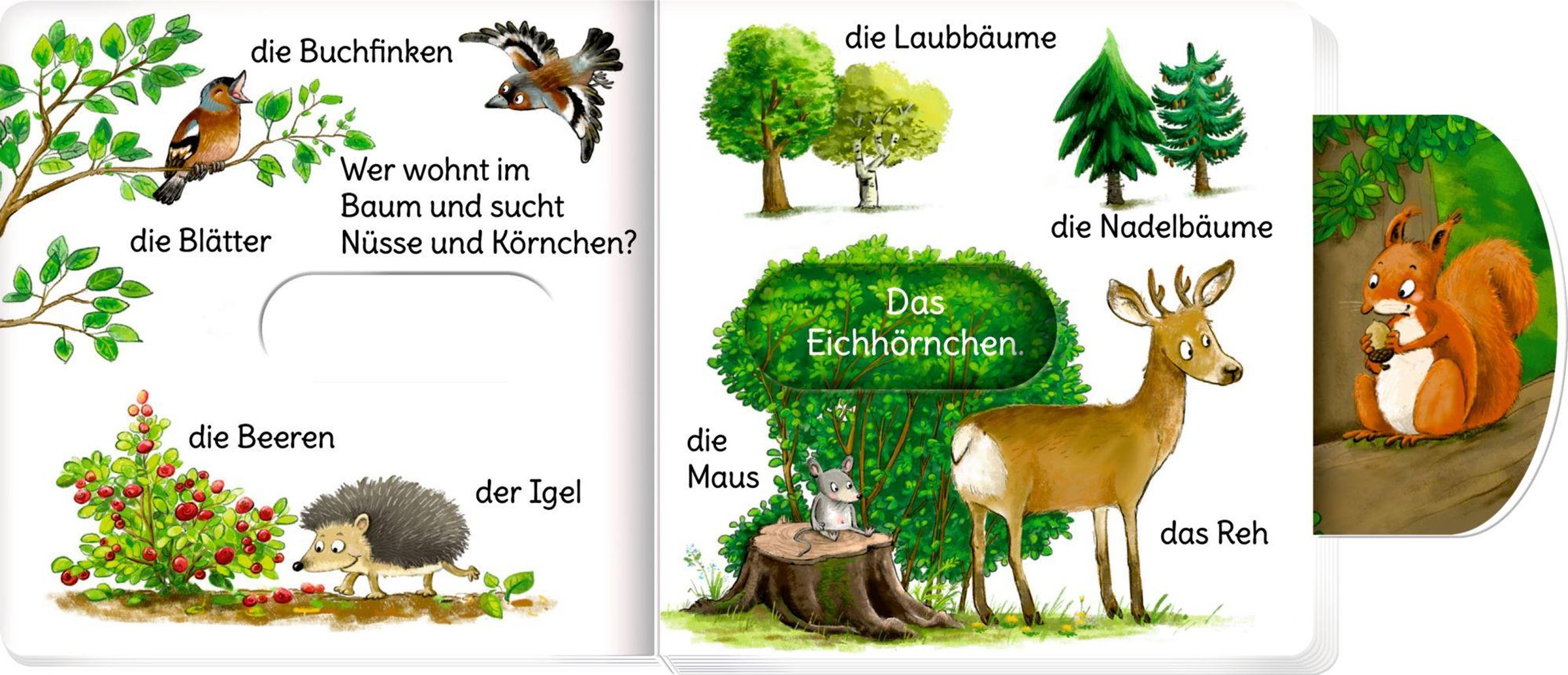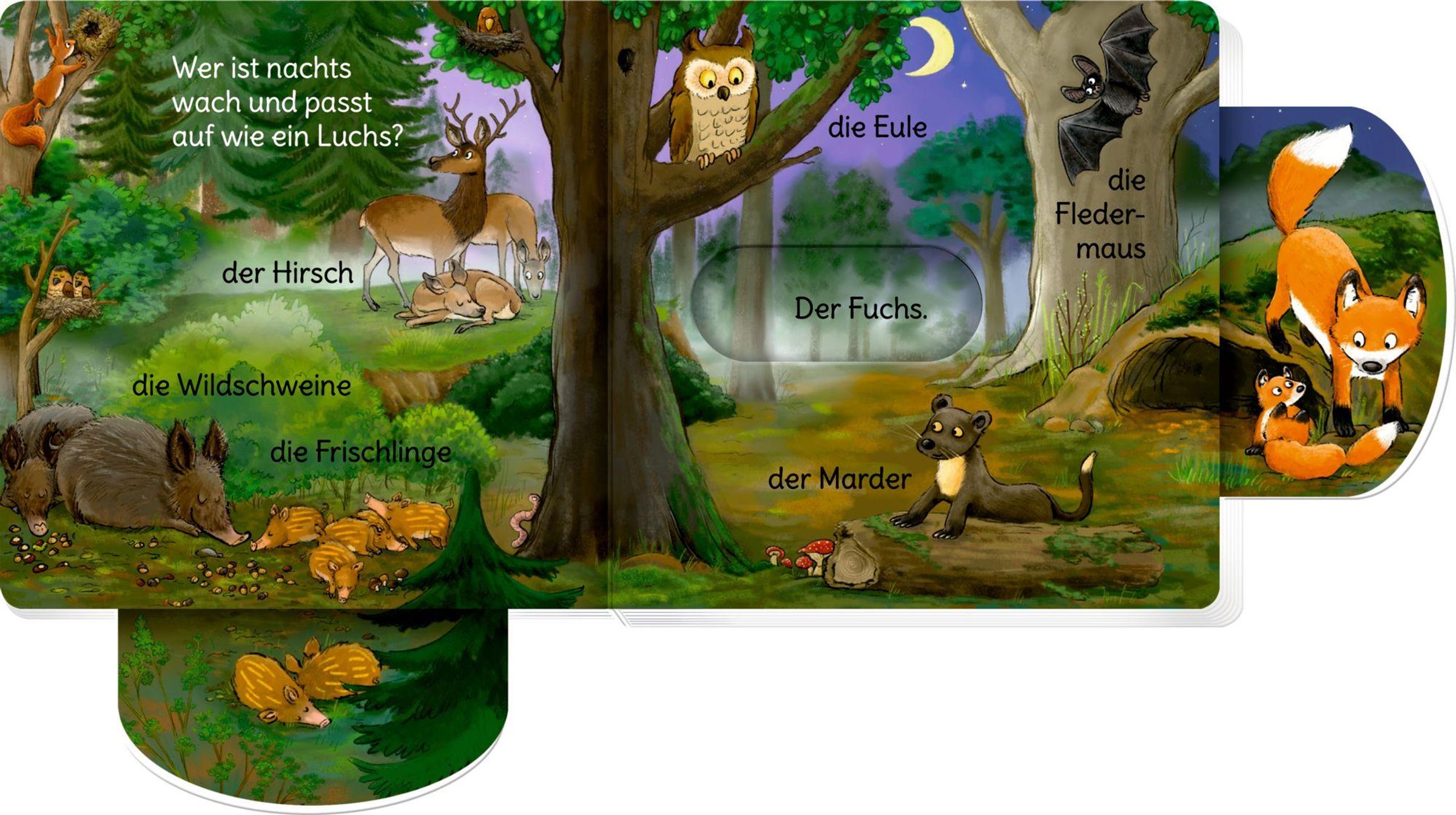 Wer wohnt im Wald? Wer ist nachts unterwegs? Und was fressen die Tiere dort? In diesem liebevoll gestalteten Bildwörterbuch für Kinder ab 18 Monaten entdecken die Kleinsten spielerisch die Welt des Waldes. Auf jeder Seite wird eine einfache Frage gestellt - und die Antwort verbirgt sich hinter stabilen Schiebern. So lernen Kinder nicht nur Tiere wie das Eichhörnchen, den Dachs oder den Uhu kennen, sondern auch erste Begriffe rund um ihre Lebenswelt. Dank klarer Illustrationen und beschrifteter Tiere und Gegenstände lädt das Buch gezielt zum Sprechenlernen ein. Die gereimten Texte fördern die Sprachentwicklung und laden mit viel Spaß zum Mitmachen ein.
