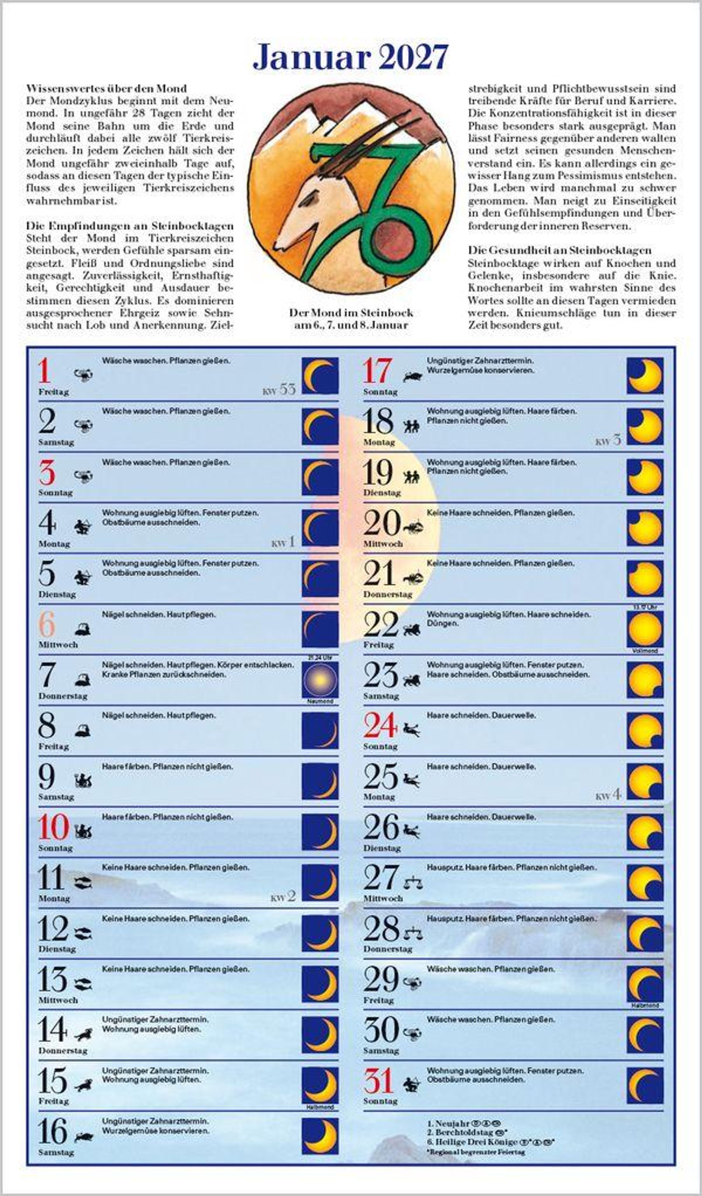 Großformatiger Mondkalender für die praktische Tagesplanung im Zeichen des Mondes. Mit ausführlichen Zusatzinformationen zu Wissenswertem, Empfindungen und Gesundheit in den einzelnen Tierkreiszeichen.