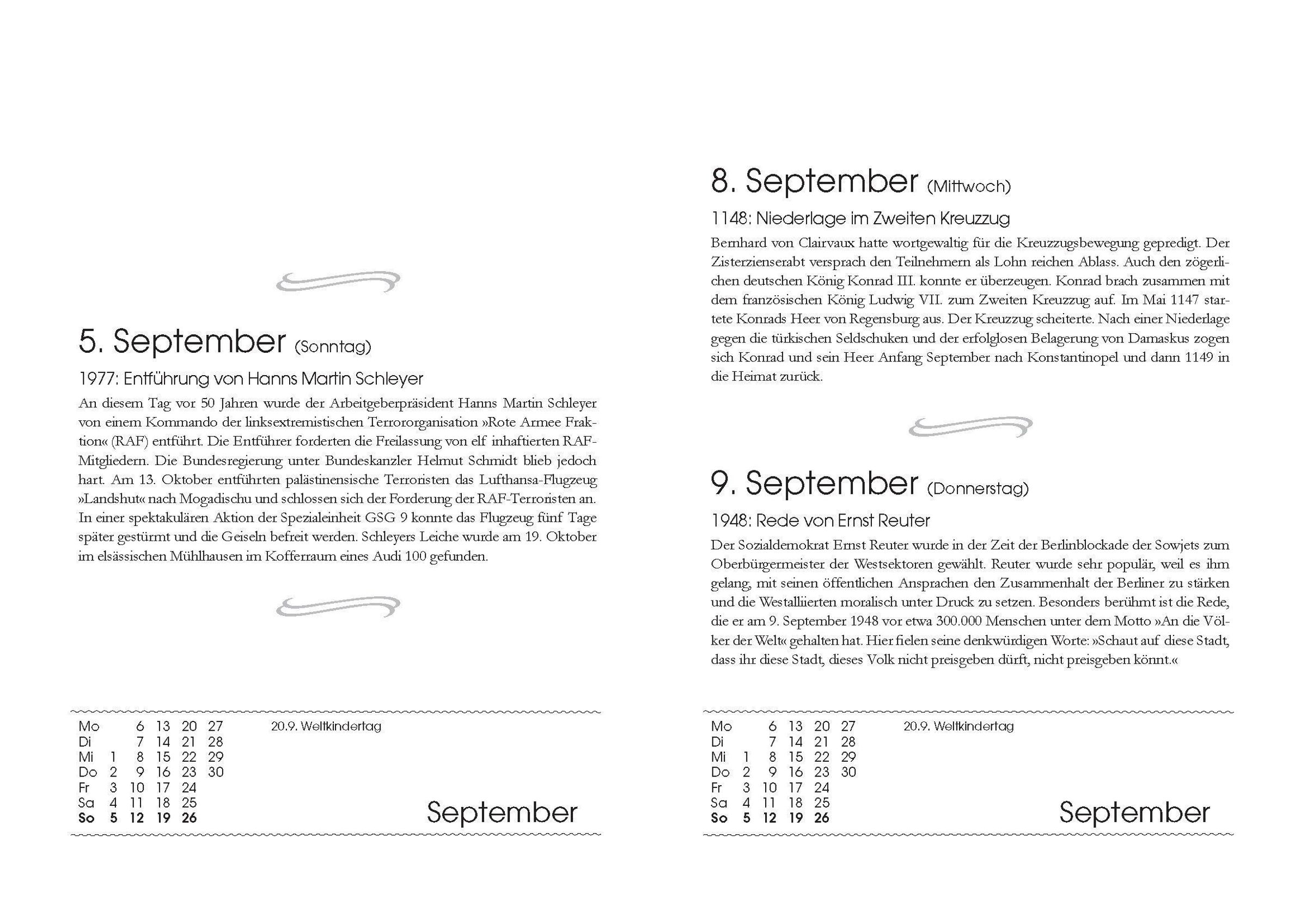 Dieser Kalender wirft einen Blick auf die wichtigsten Eckpfeiler deutscher Geschichte vom Mittelalter bis zur Gegenwart. An jedem Tag wird ein interessantes und manchmal auch bewegendes Ereignis aus der deutschen Geschichte vorgestellt. Ob Karl der Große, der erste Weltkrieg oder der Mauerfall, zu jedem Ereignis erfährt man die wichtigsten Hintergründe, Fakten und Daten.