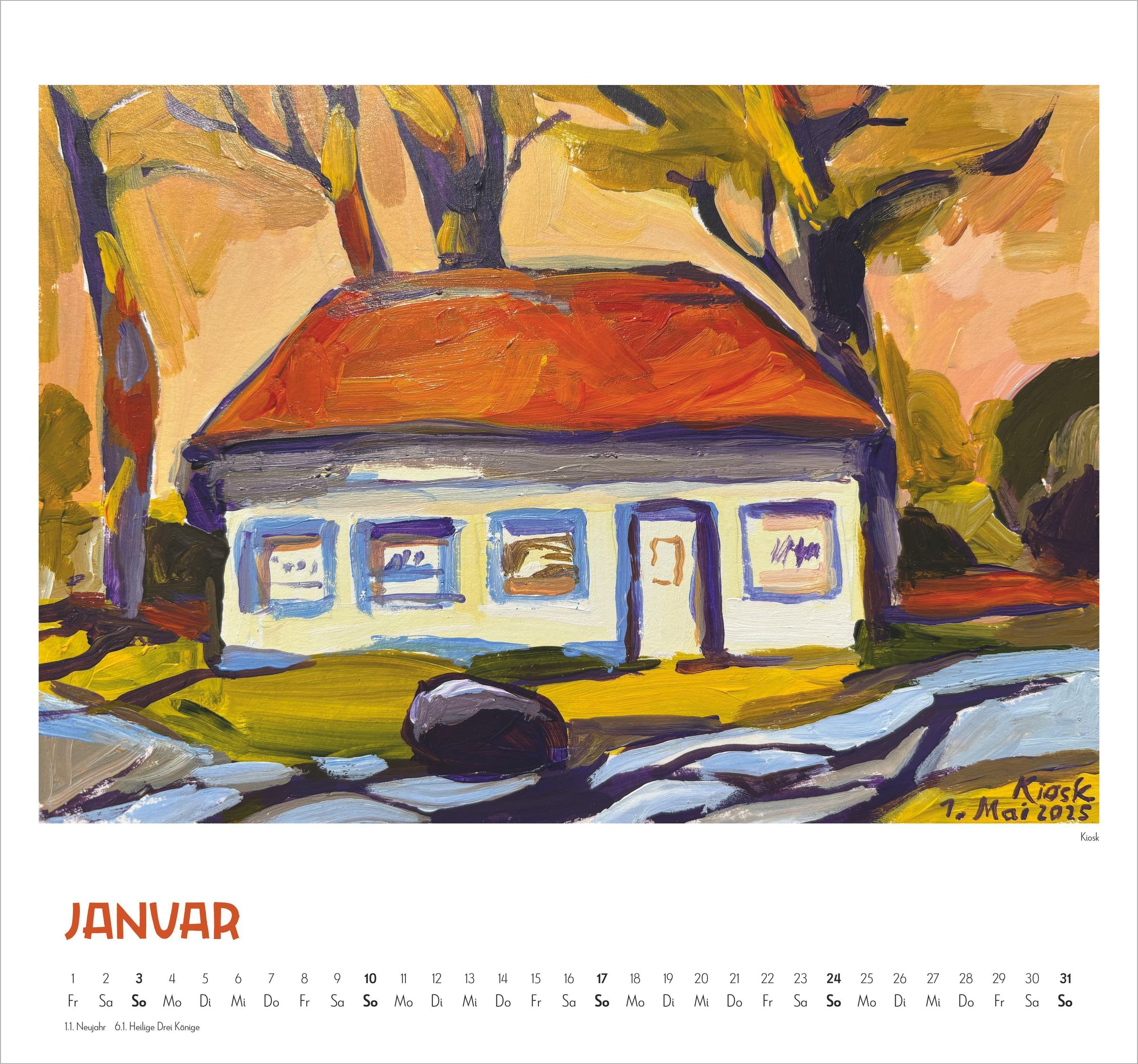 Texte: "Mit Kat Menschik an der Ostsee", "2027". Illustration mit farbenfroher Küstenlandschaft und Bergen im Hintergrund., Kalender