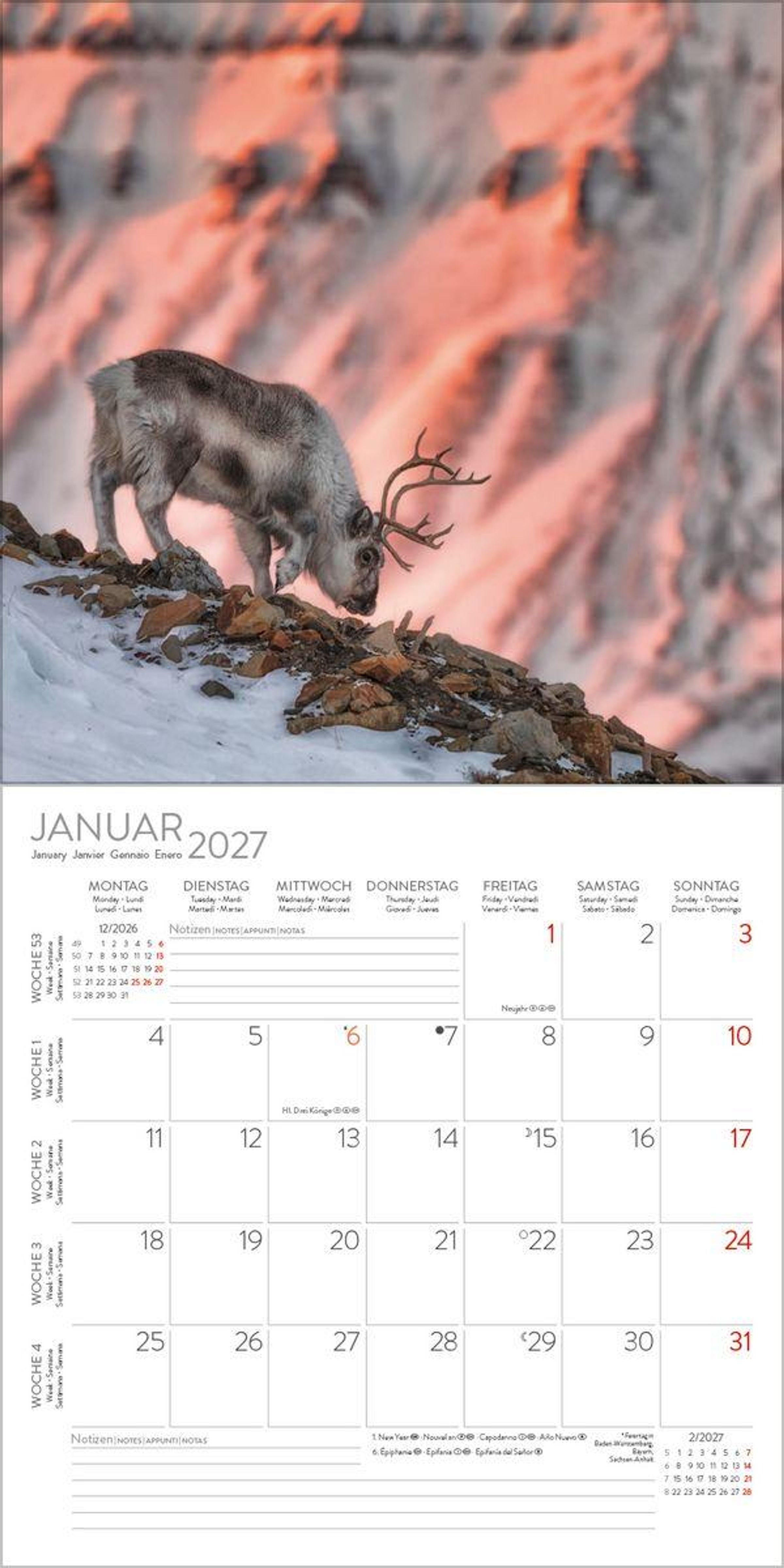 Hochwertig und ohne Plastikfolie verpackt Wandkalender im Format: 30 x 30 cm; Offenes Format: 30 x 60 cm; umweltfreundliches FSC Papier Jede Kalenderseite mit großem Bild und viel Platz im Kalendarium für Notizen und Termine Mehrsprachiges Kalendarium: DE/GB/FR/IT/ES mit Feiertagen für D/A/CH/GB/FR/IT/ES Regionale Ferienzeiten für DE/A/CH Monatsübersicht für den jeweiligen Vor- und Nachmonat; Jahresübersicht