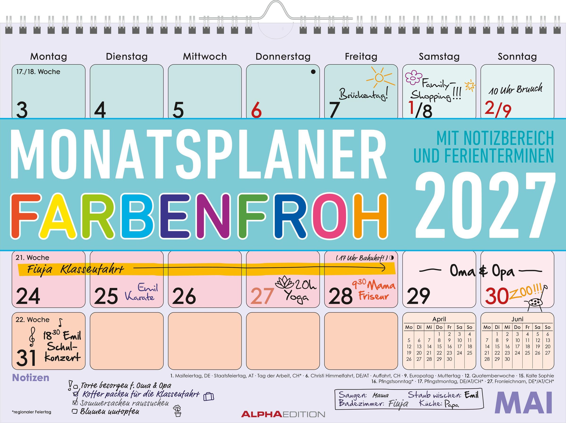 Der Monatsplaner Farbenfroh 2027 von Alpha Edition bietet eine übersichtliche und klare Struktur, ideal für Büro, Homeoffice oder Familienorganisation. Mit einem Monat pro Seite behalten Sie wichtige Termine und Fristen stets im Blick. Die Sonn- und Feiertage sind farblich hervorgehoben, und die praktische Übersicht über Vor- und Folgemonat erleichtert die Planung.