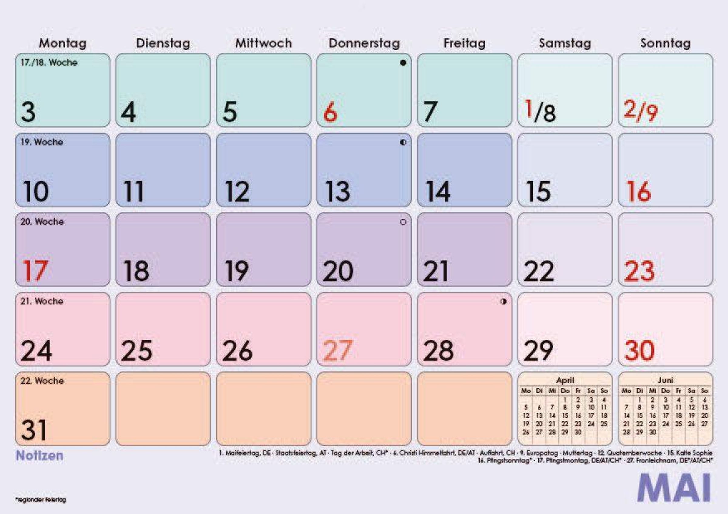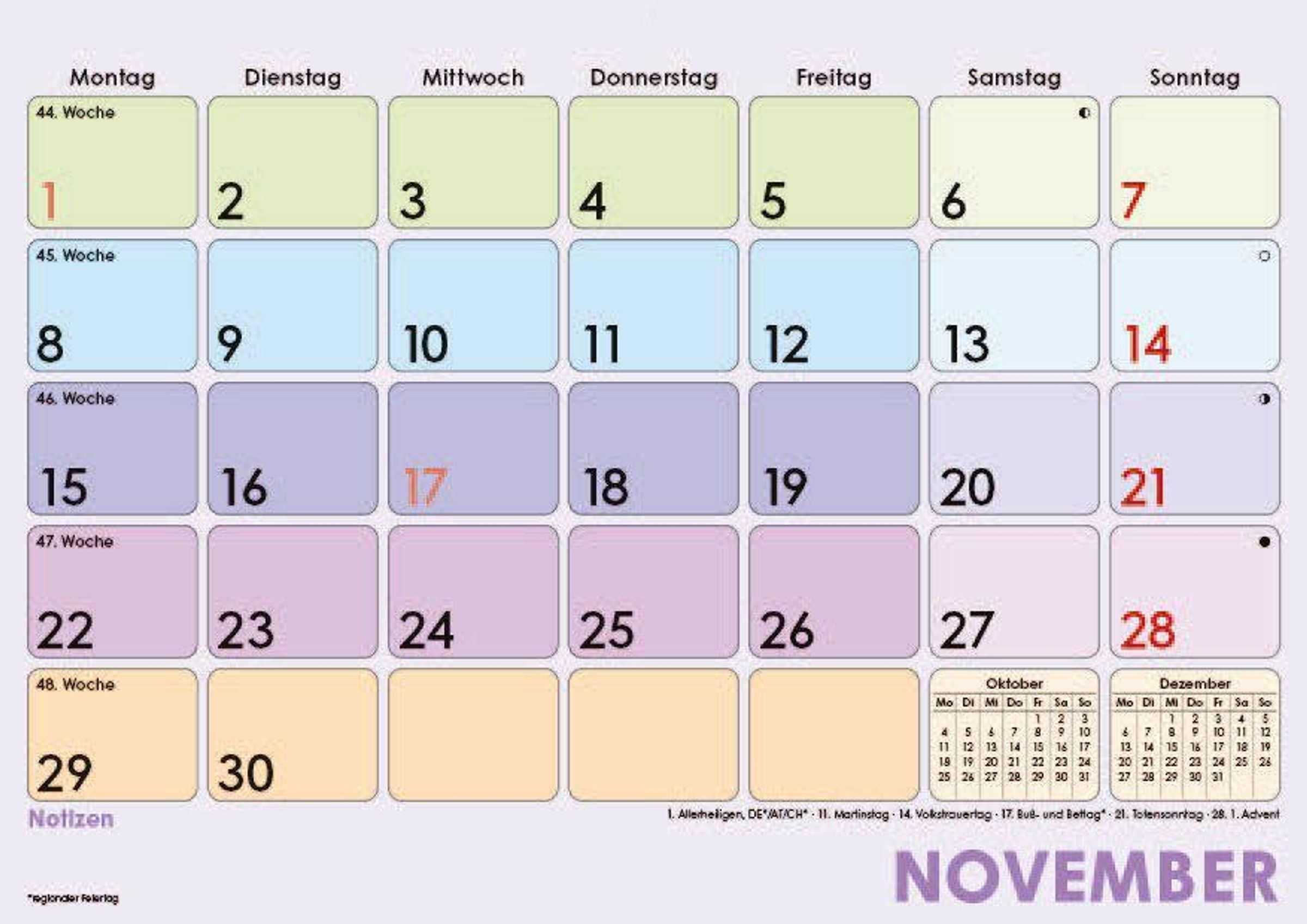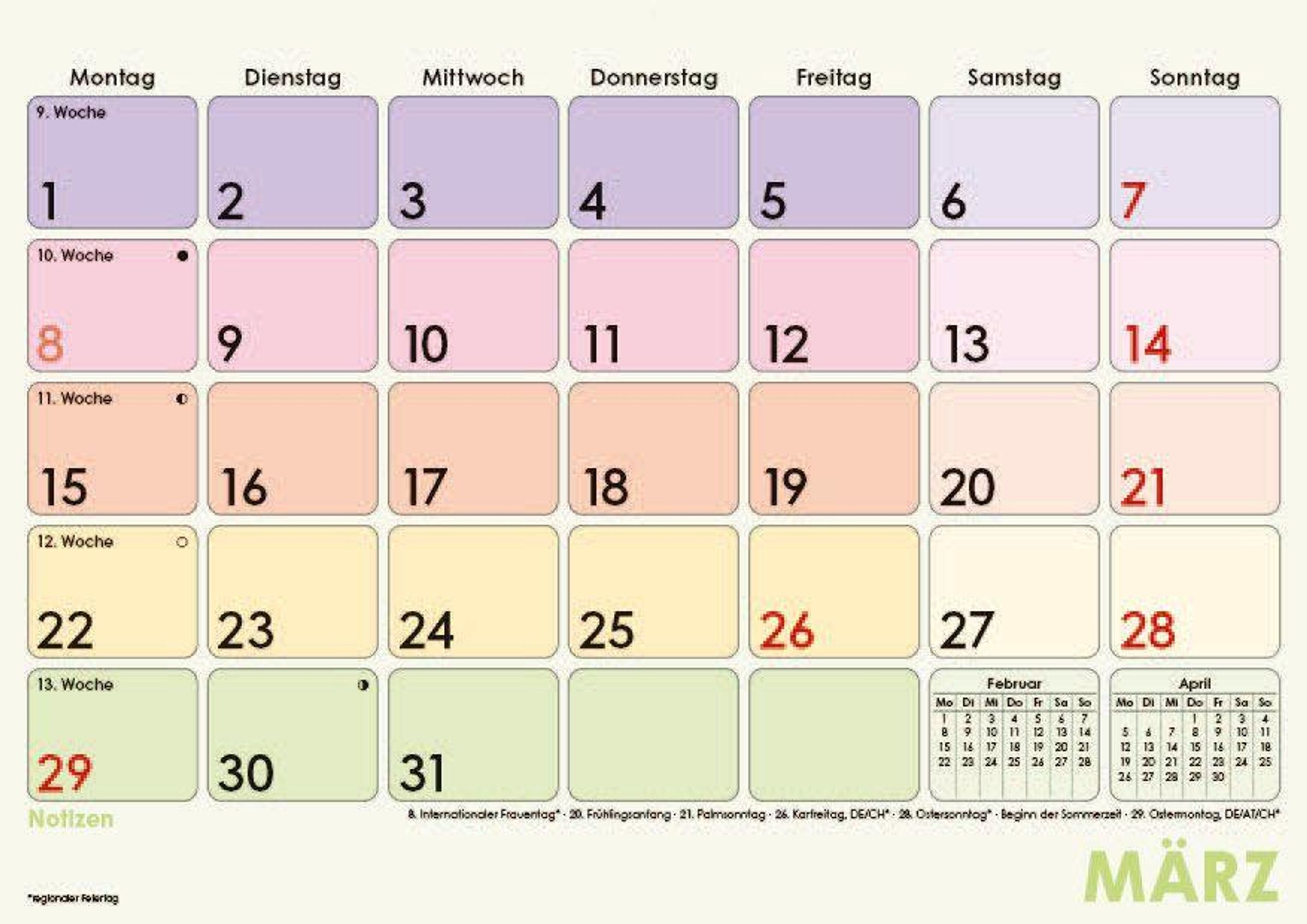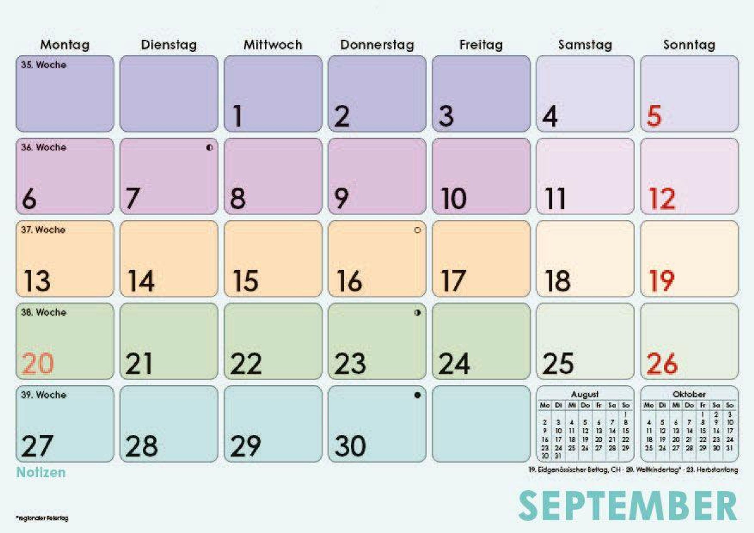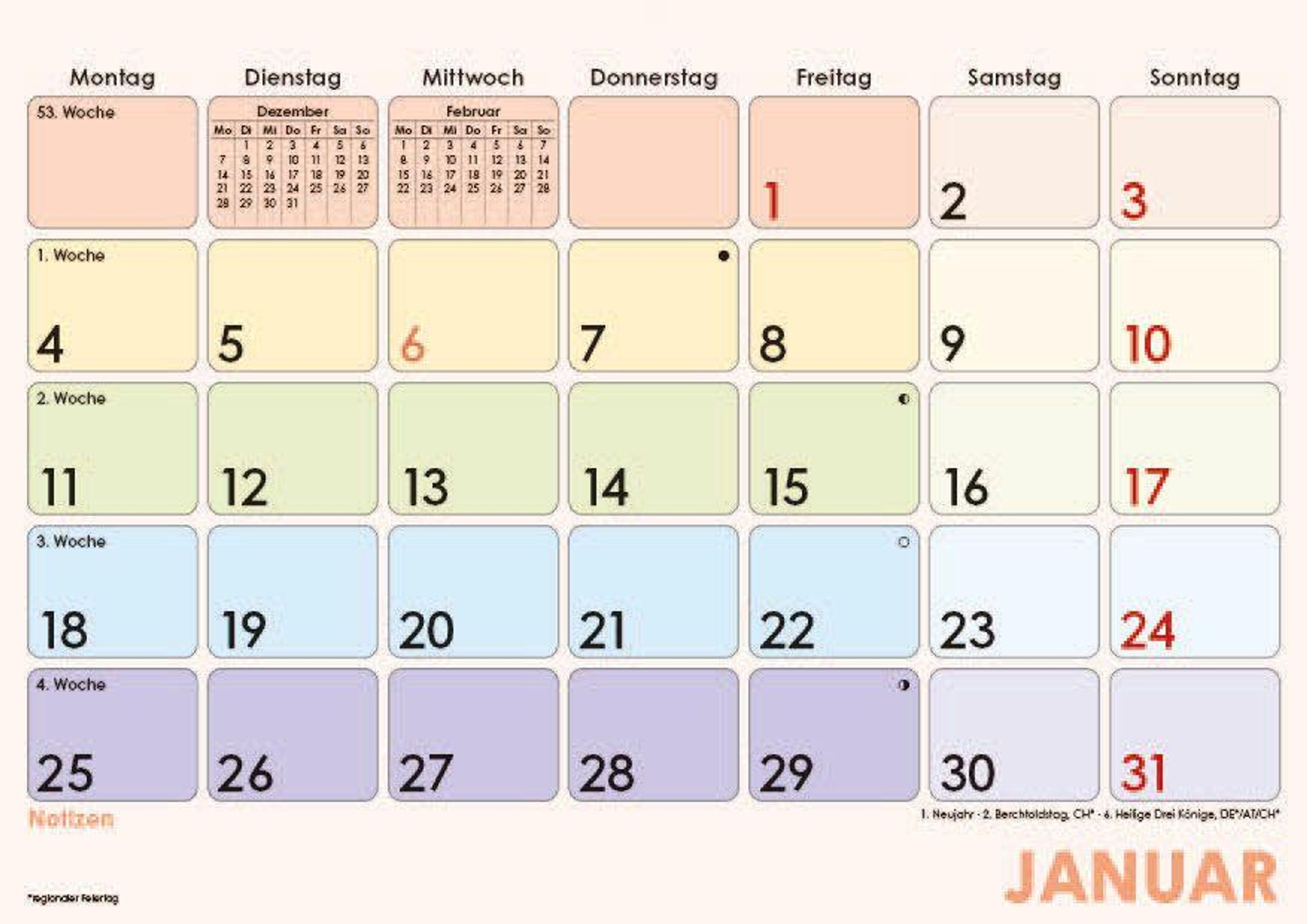 Farblich hervorgehobene Sonn- & Feiertage für schnelle Orientierung