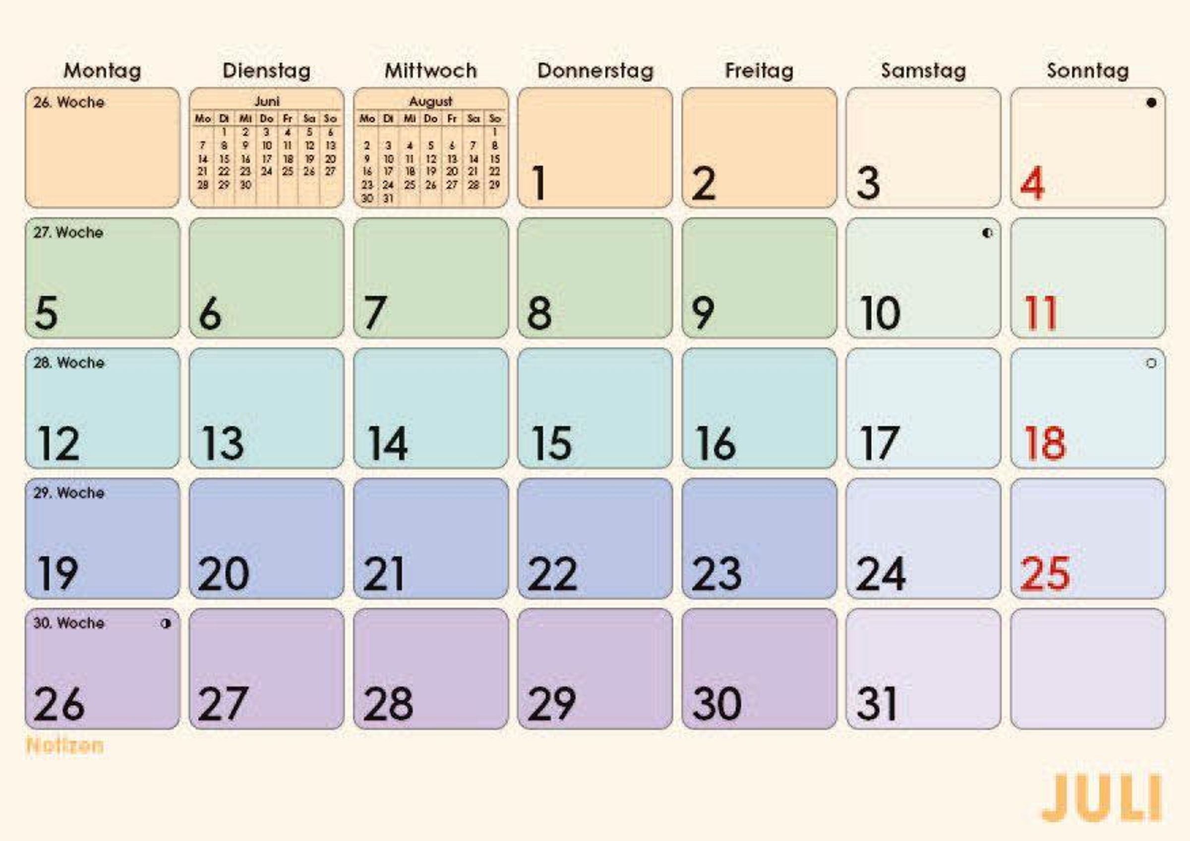 Kalendarium in Deutsch mit Übersicht über Vor- und Folgemonat