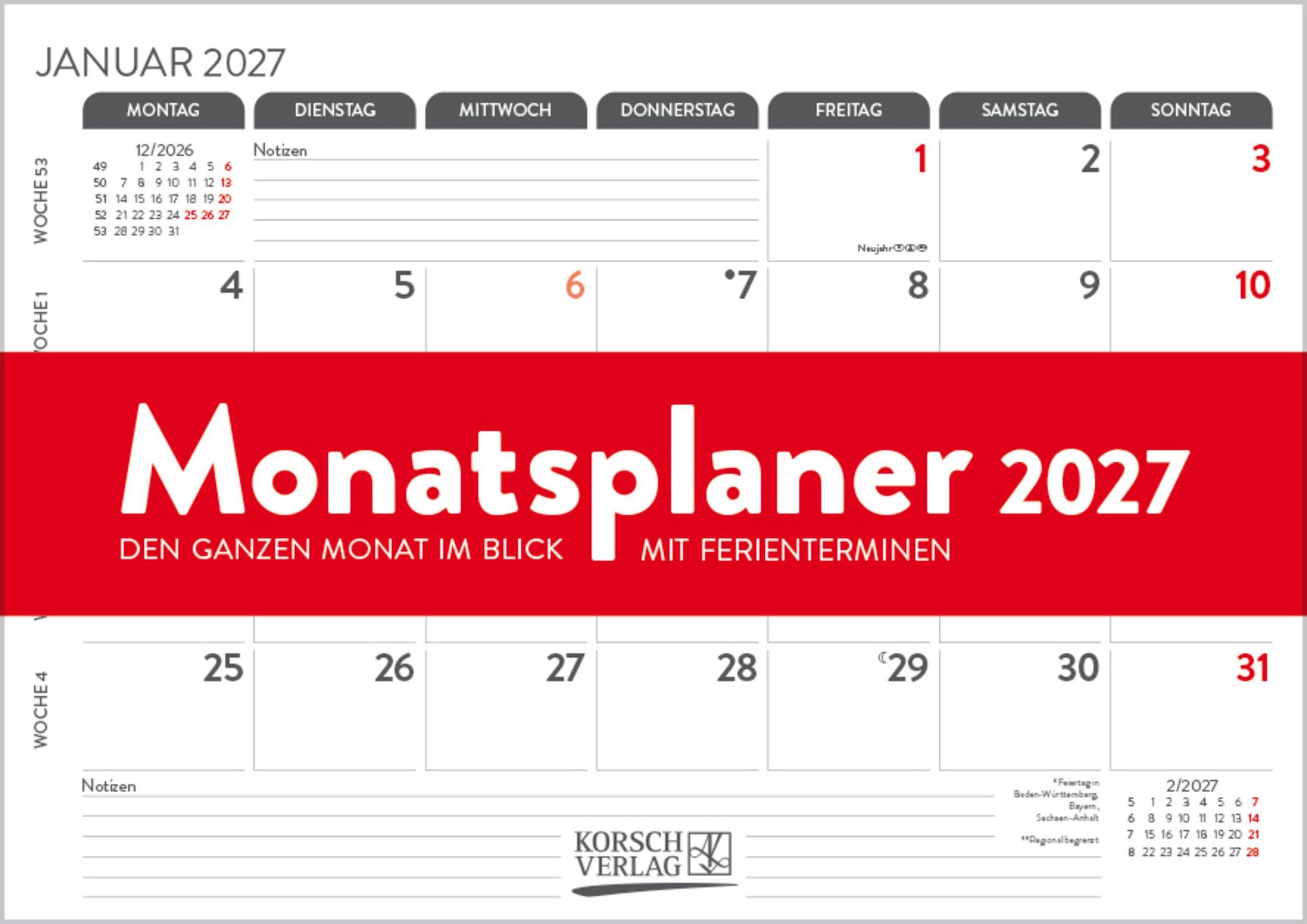 - 12 Monate mit Ferienterminen und Feiertagen. 29,7 x 21 cm.
