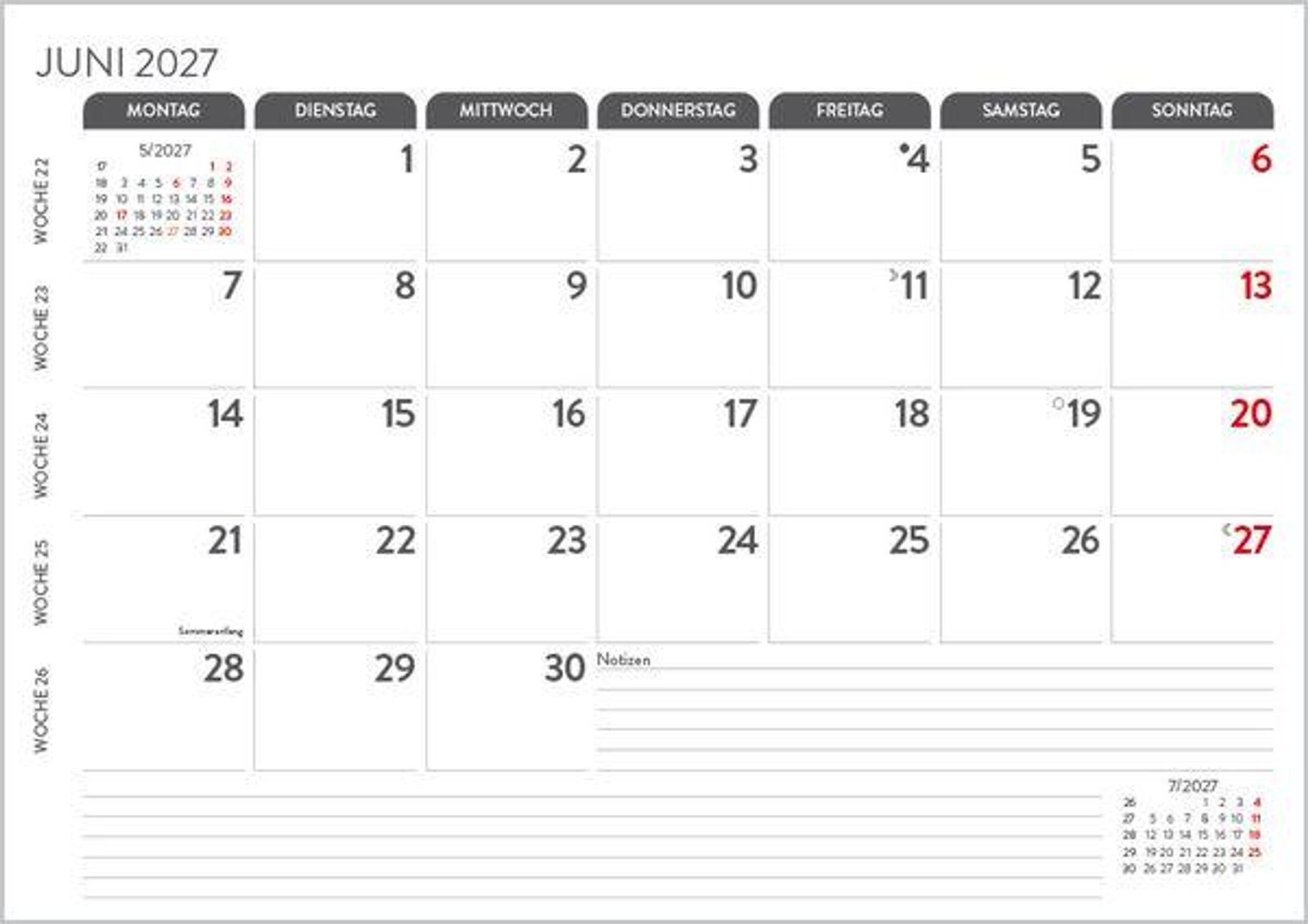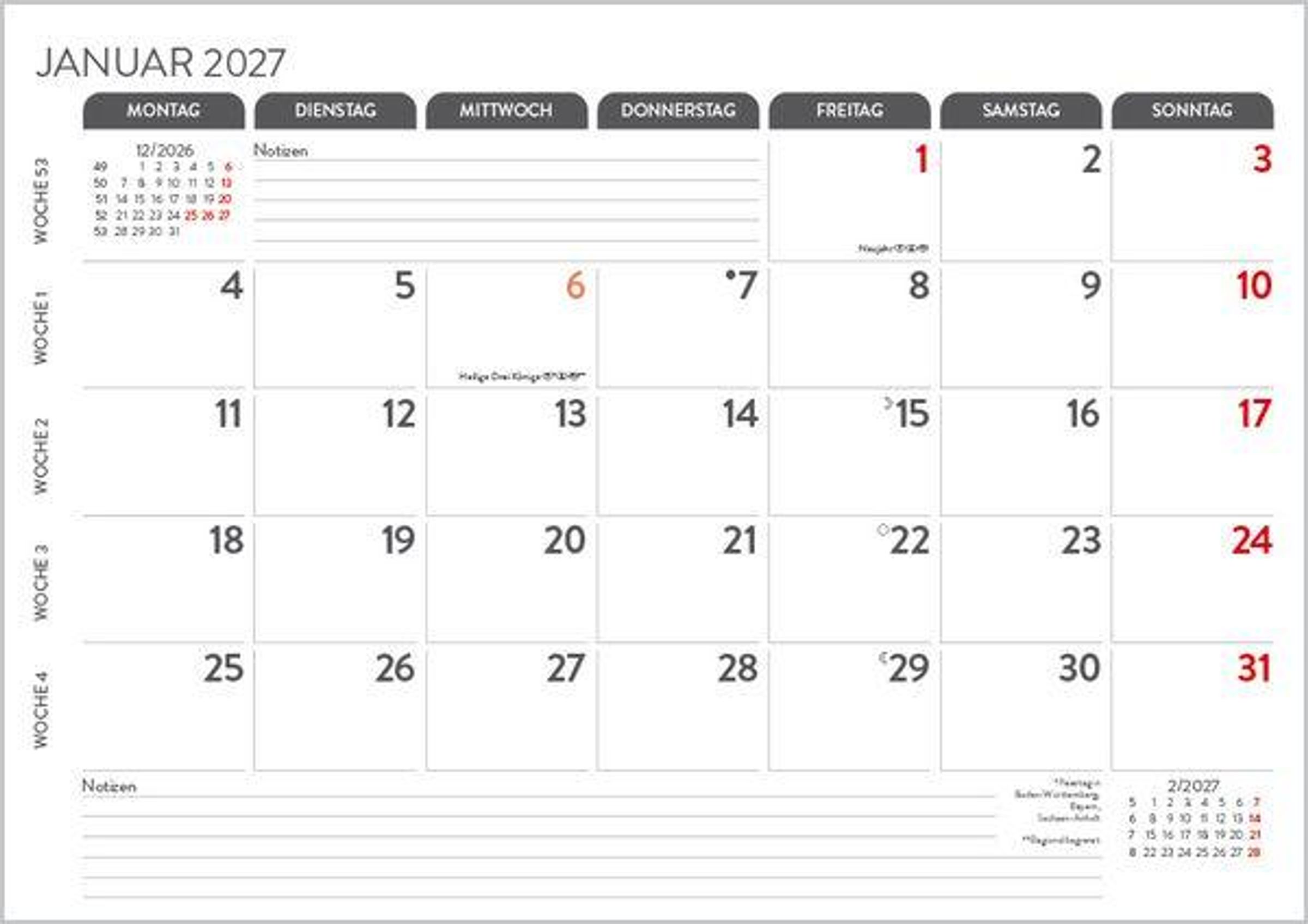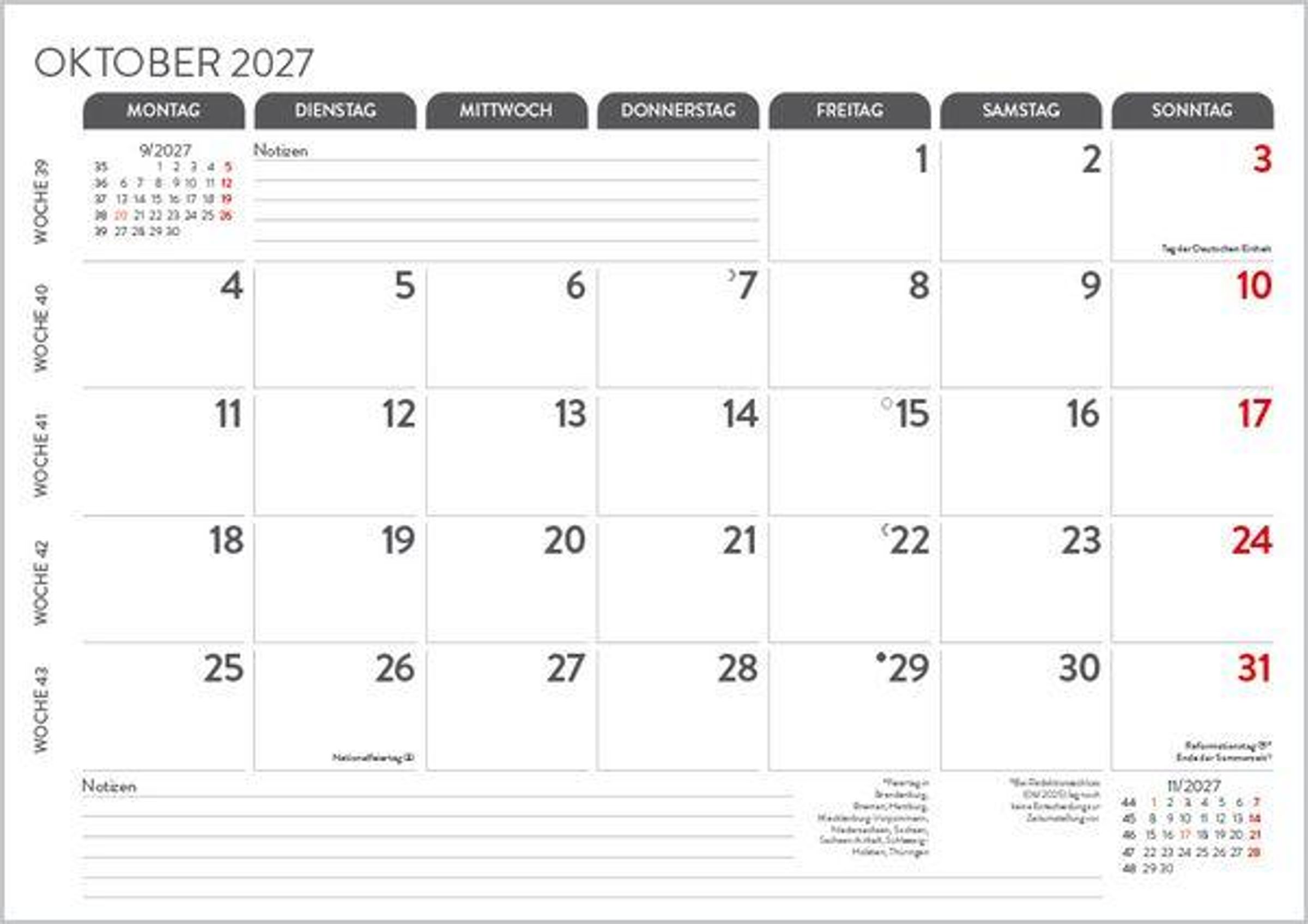 - Kalendarium auf Deutsch mit hervorgehobenen Sonn- und Feiertagen für D, A und CH