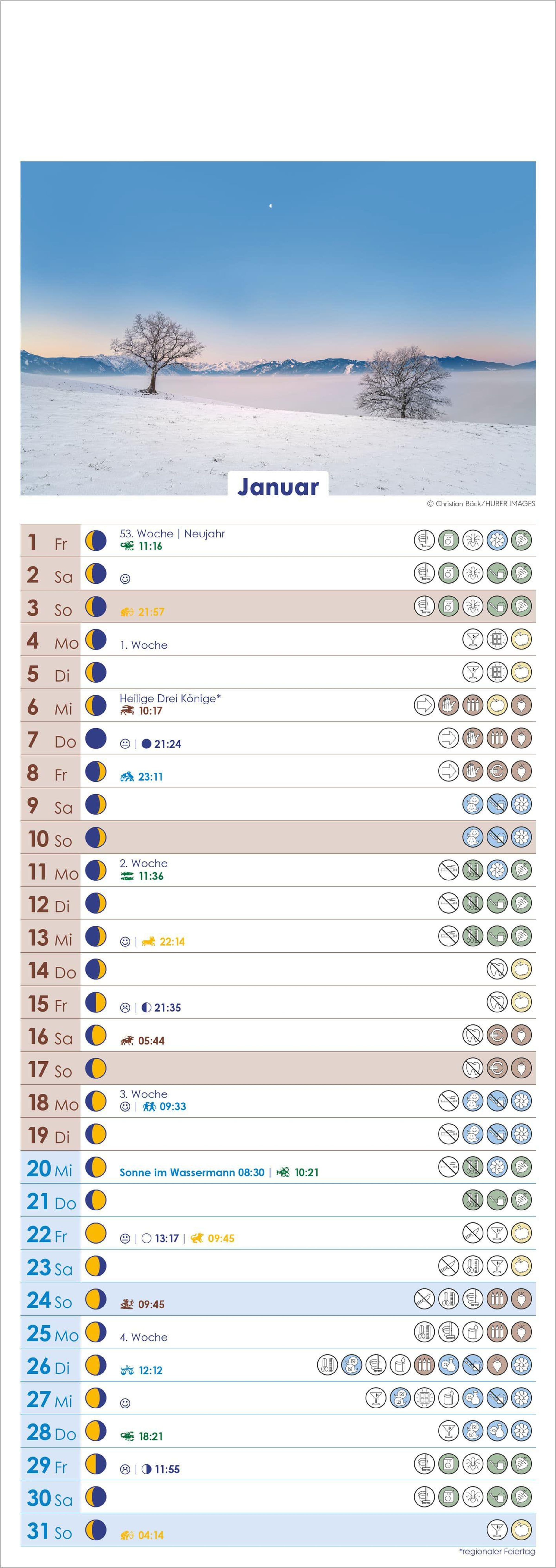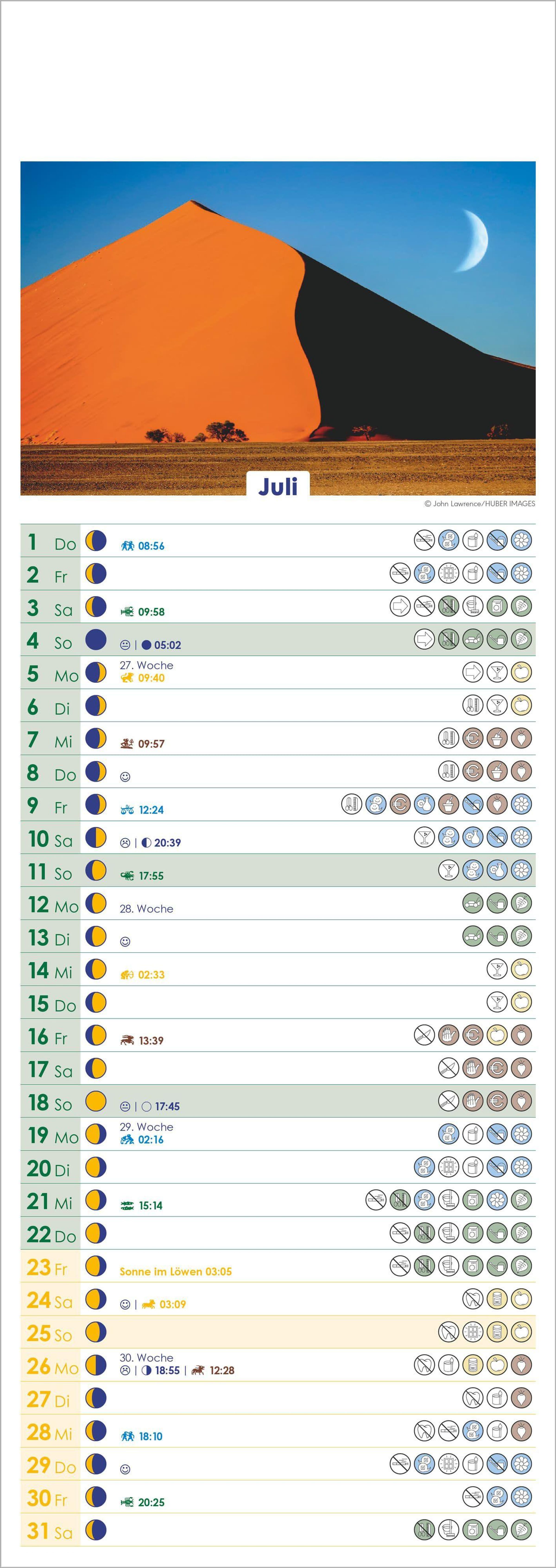 Der Alpha Edition Mondkalender 2027 begleitet Sie Tag für Tag mit wertvollen Informationen rund um Gesundheit, Haushalt, Garten und Natur. Das harmonische Farbkonzept zeigt den Rhythmus von Sonne und Mond, während minutengenaue Angaben zu Mondphasen und Tierkreiszeichen für eine präzise Planung sorgen.